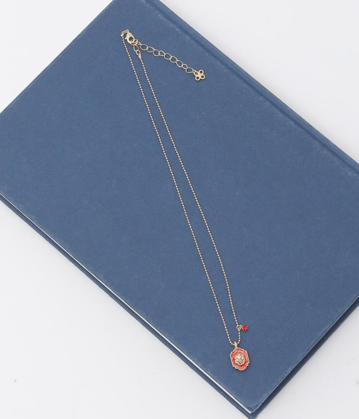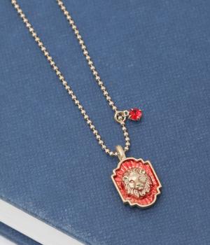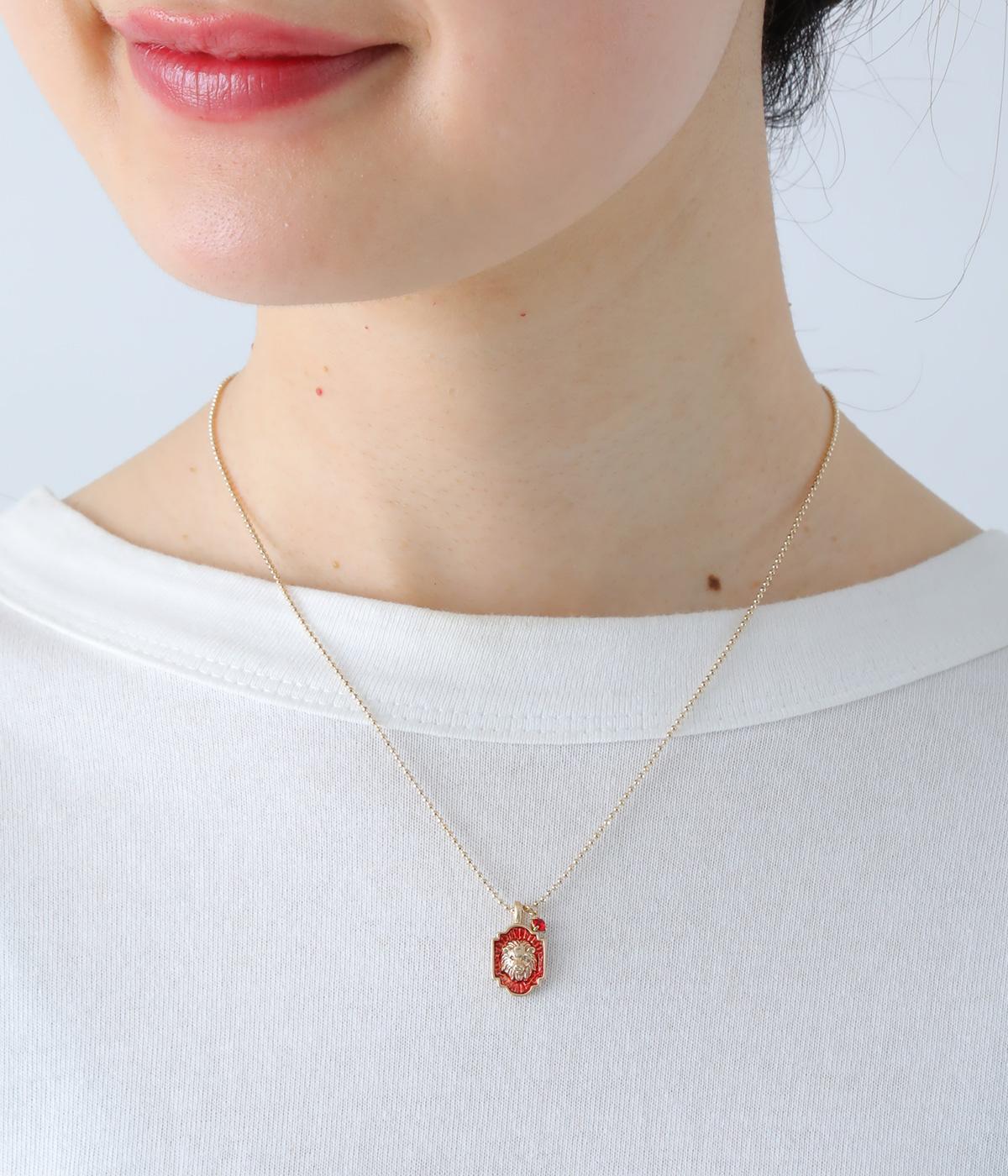 王者の風格を感じさせる赤とゴールドを基調にした、ライオンのエンブレムのネックレス。宝石のように輝くカットガラスをあしらい、上品な輝きをプラスしました。勝利を意味するルビーをイメージしたカラーが、コーディネートを華やかに引き立てます。