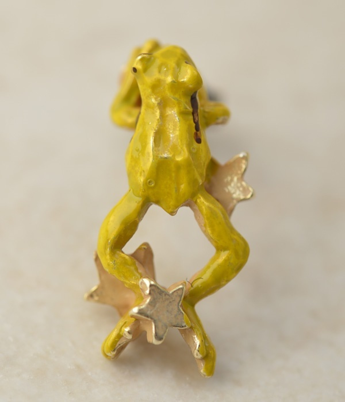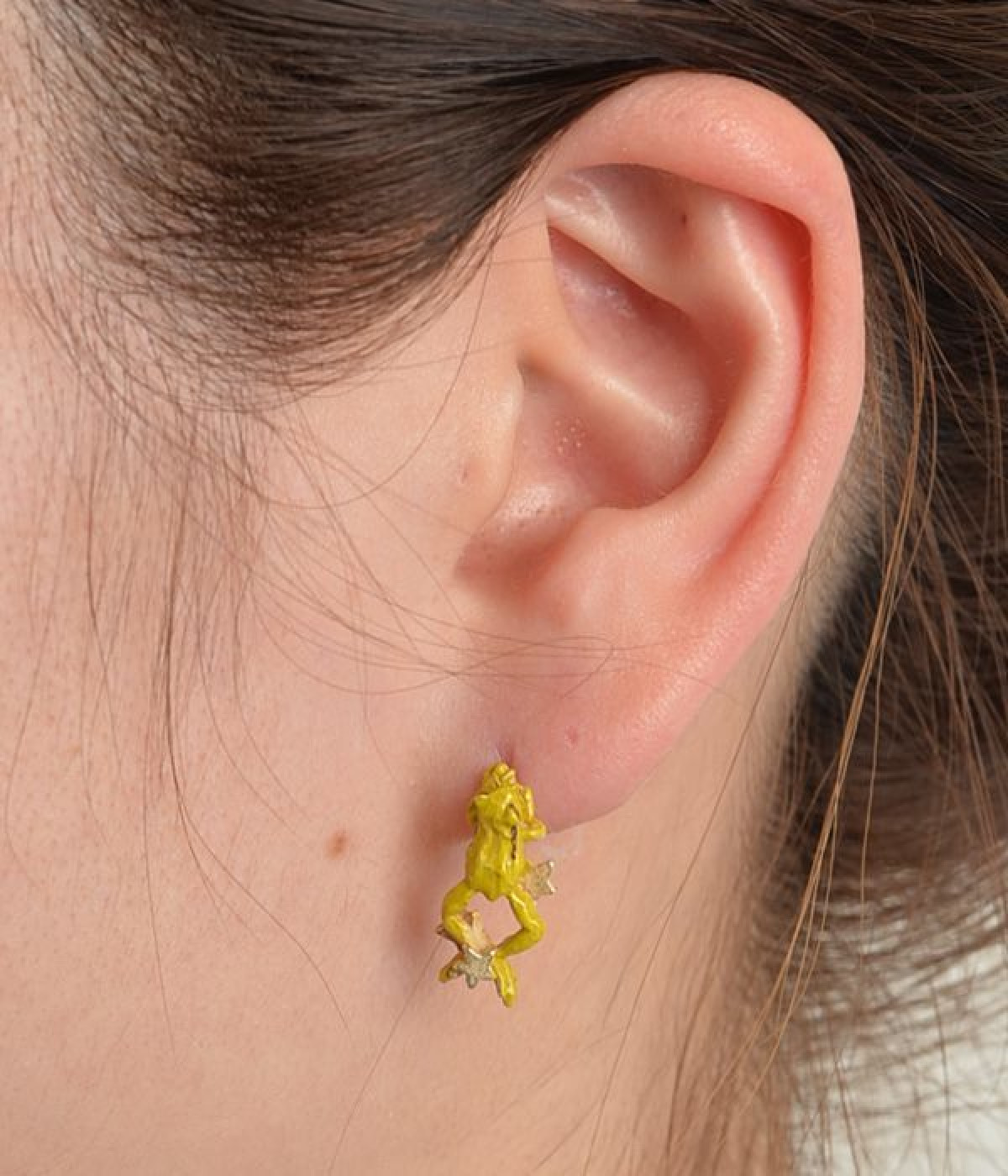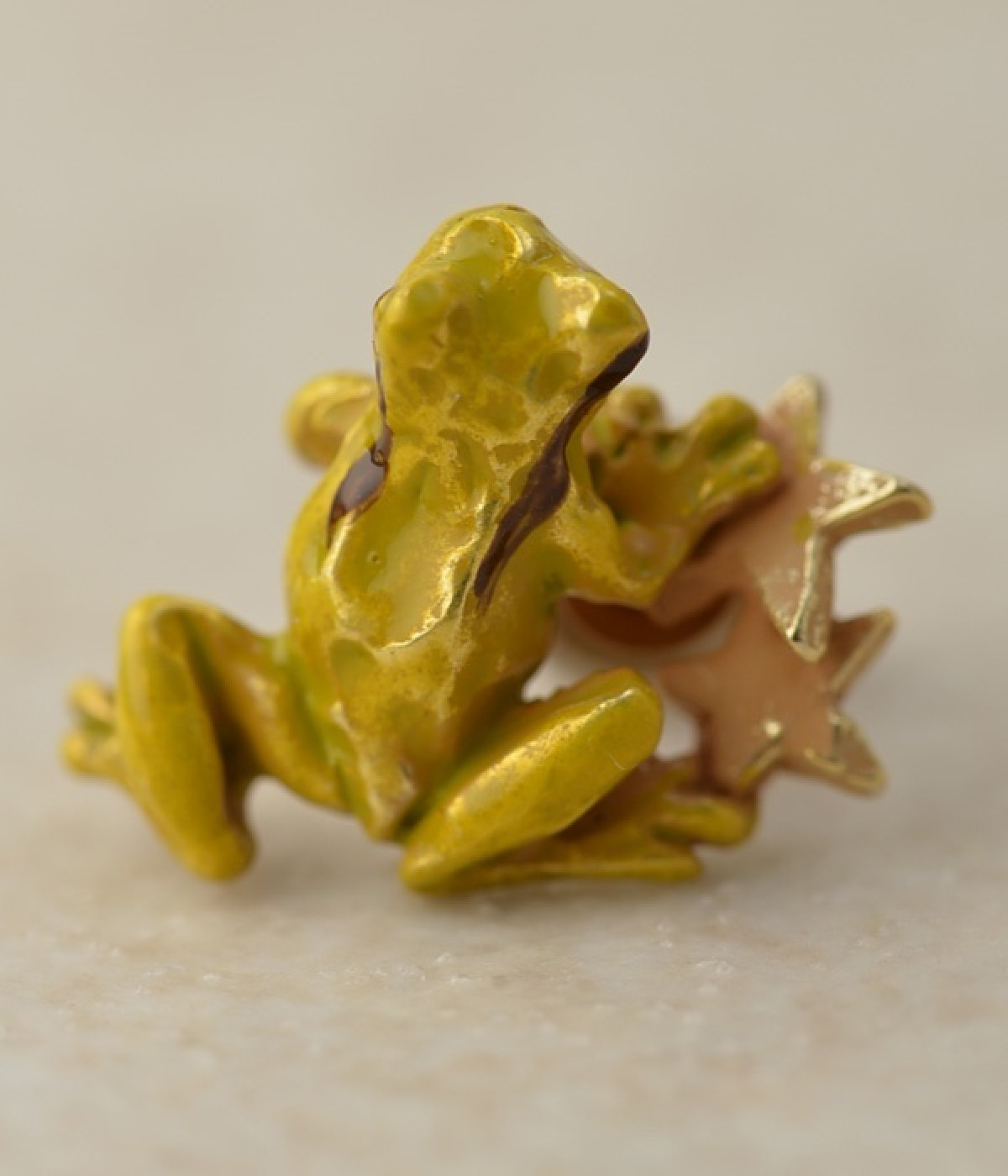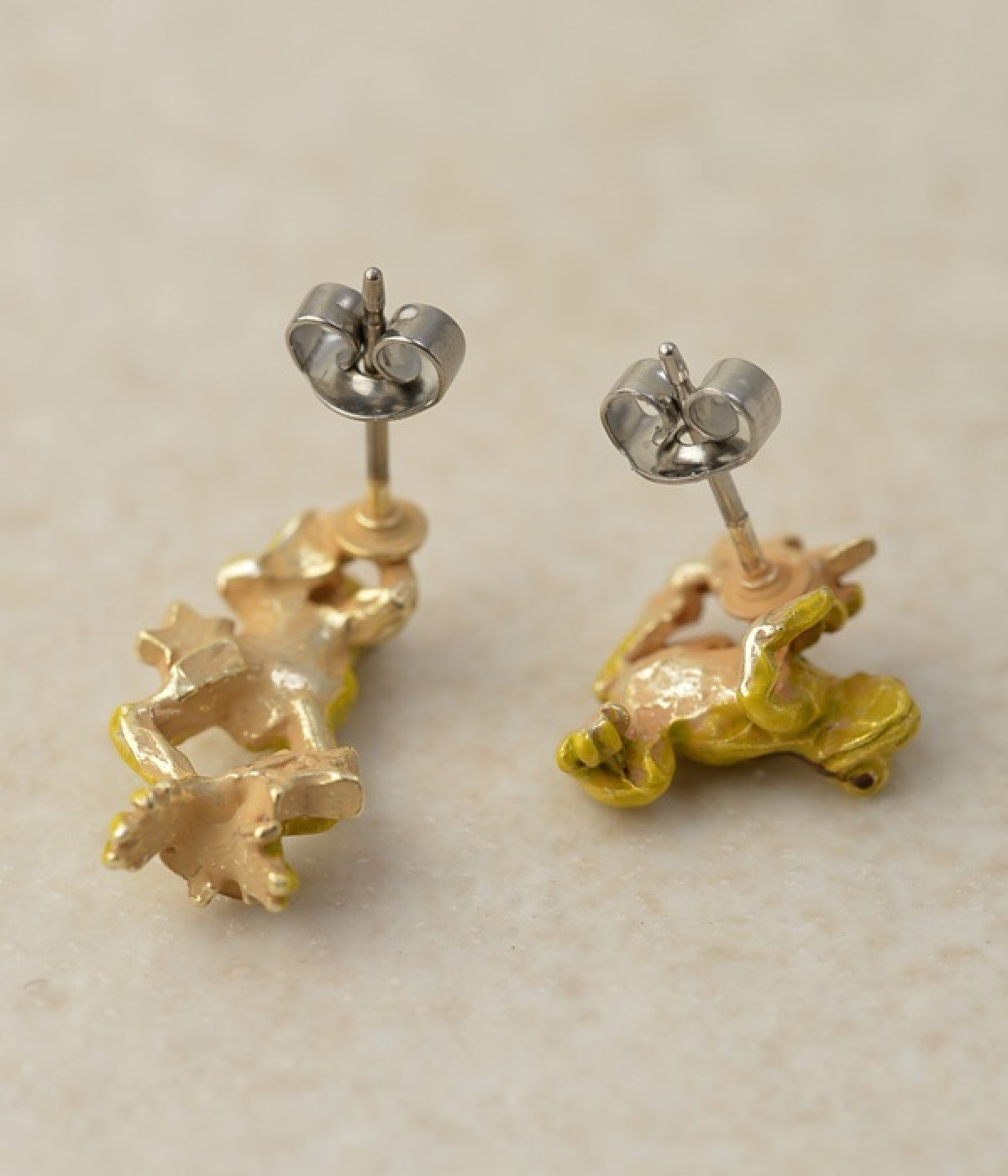 あたたかくなり長い冬眠から身を覚ましたかえるをモチーフにしたキュートなピアスです。耳元にくっついたり飛んだり、活動的な二匹の姿が愛らしいアイテム。リアルな躍動感と、美しい造形が魅力です。小さくきらめく星もさりげないポイントに。シンプルになりがちなコーディネートを楽しく彩ってくれる、遊び心を感じる一品です。