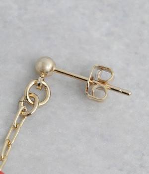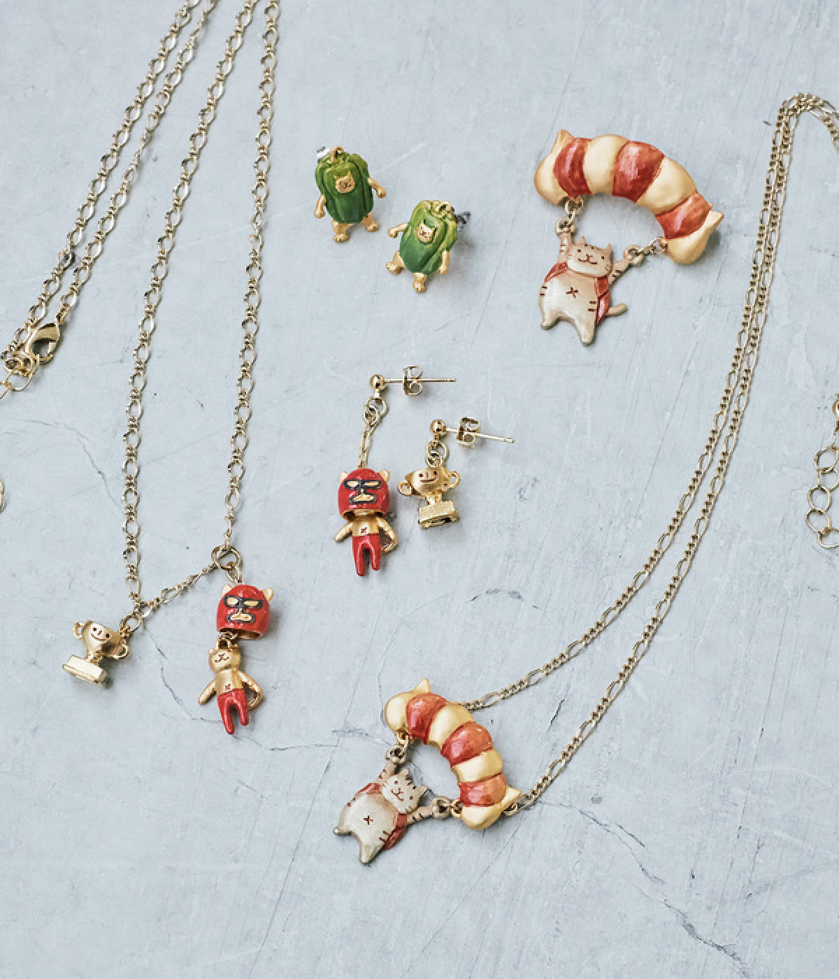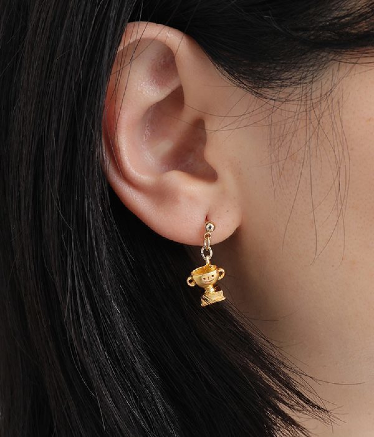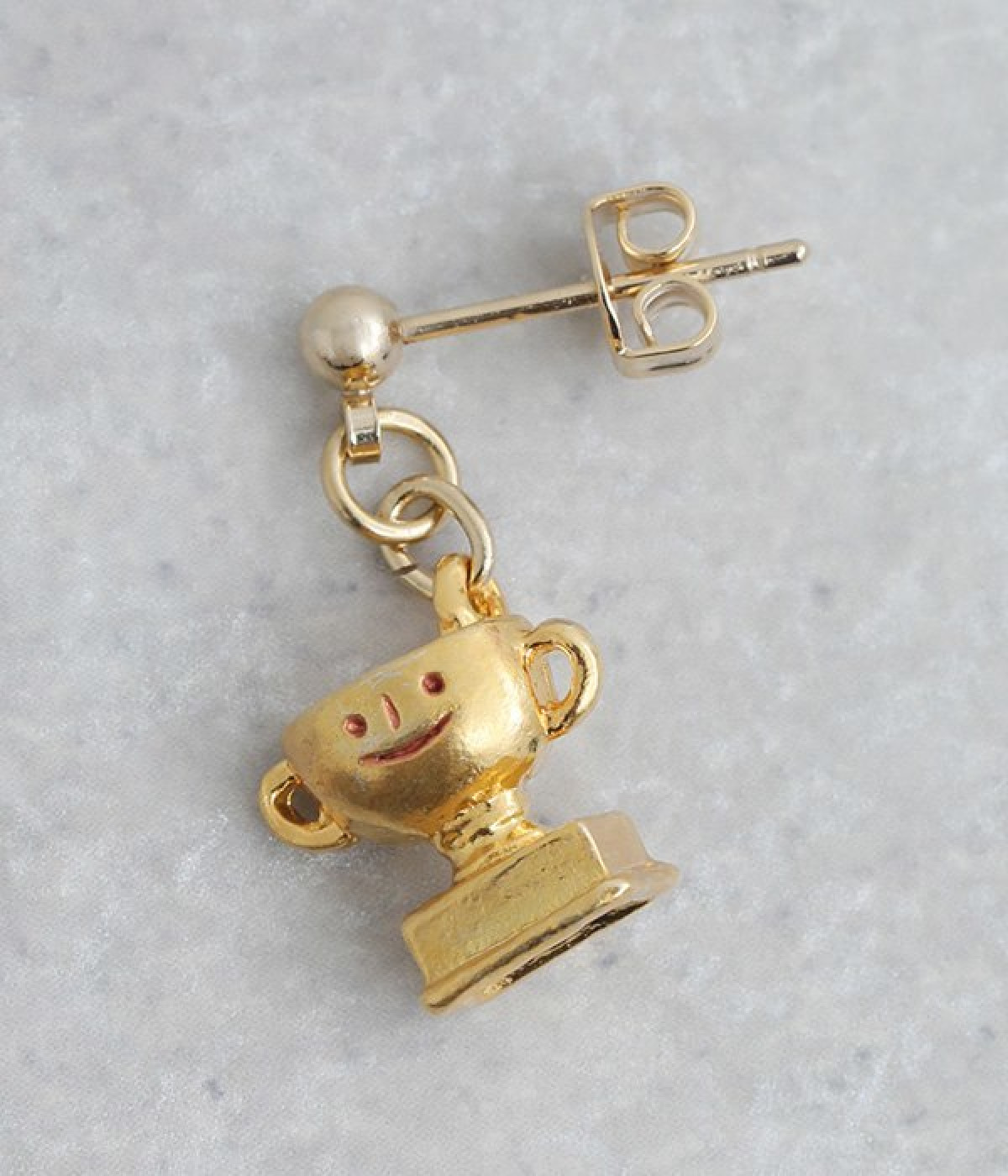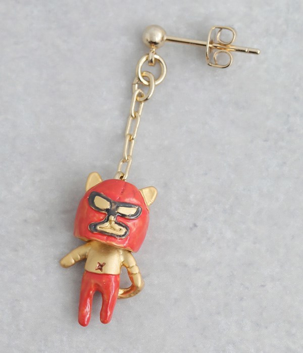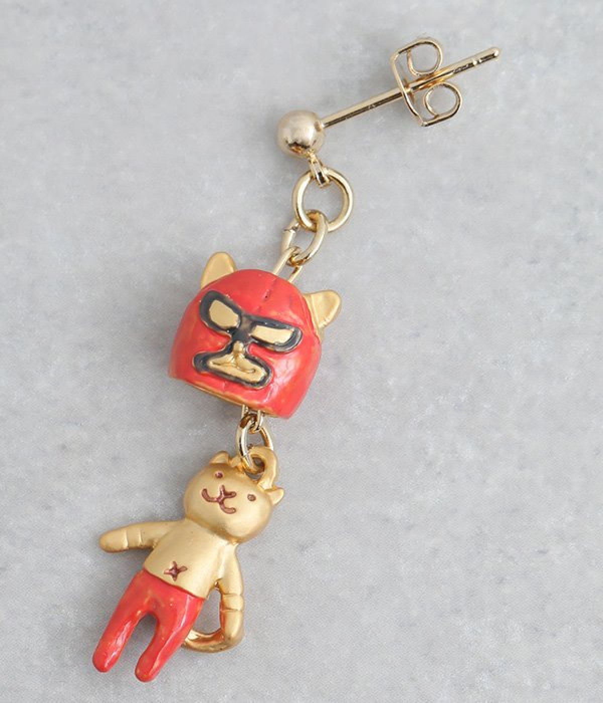 ネコレスラーの優勝記念を祝うかのような遊び心満載のスタッドピアスが登場しました。両耳でデザインが異なり、片方は赤い覆面をかぶった猫、もう片方は優勝カップのチャームを採用したアシンメトリーの仕様です。覆面部分をずらすとかわいい素顔が見られるユニークなギミックつき。耳元にユーモア溢れるアクセントを添えたいときにおすすめの一品です。