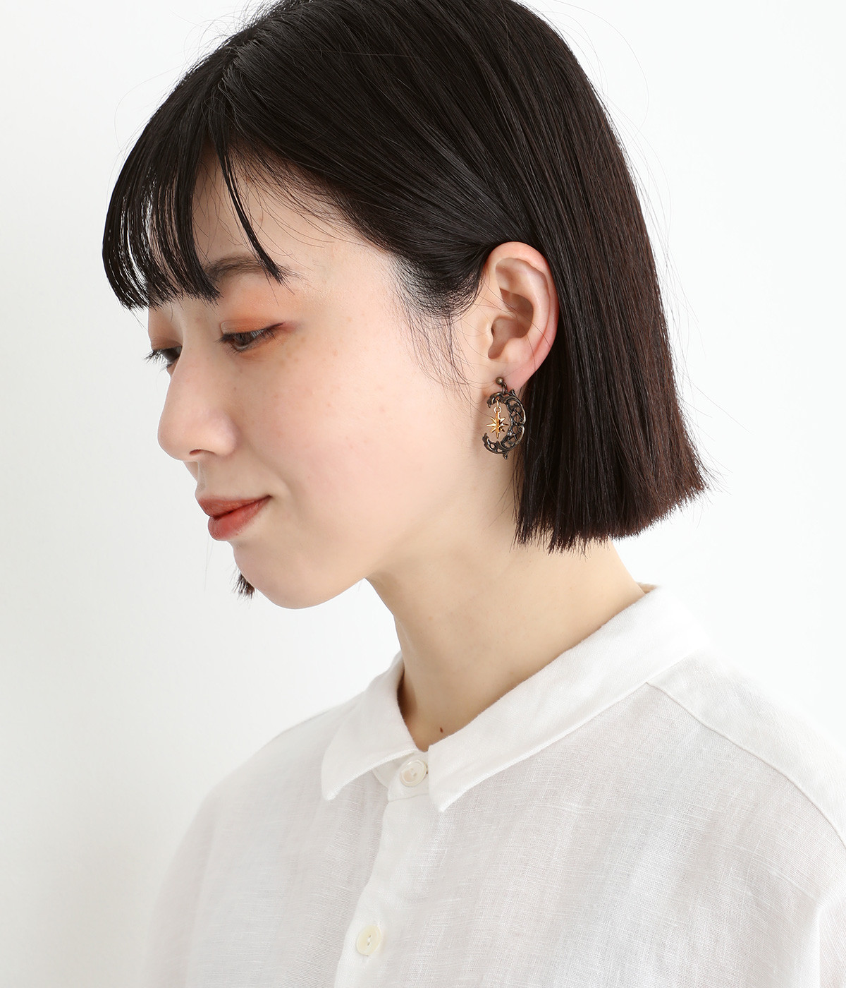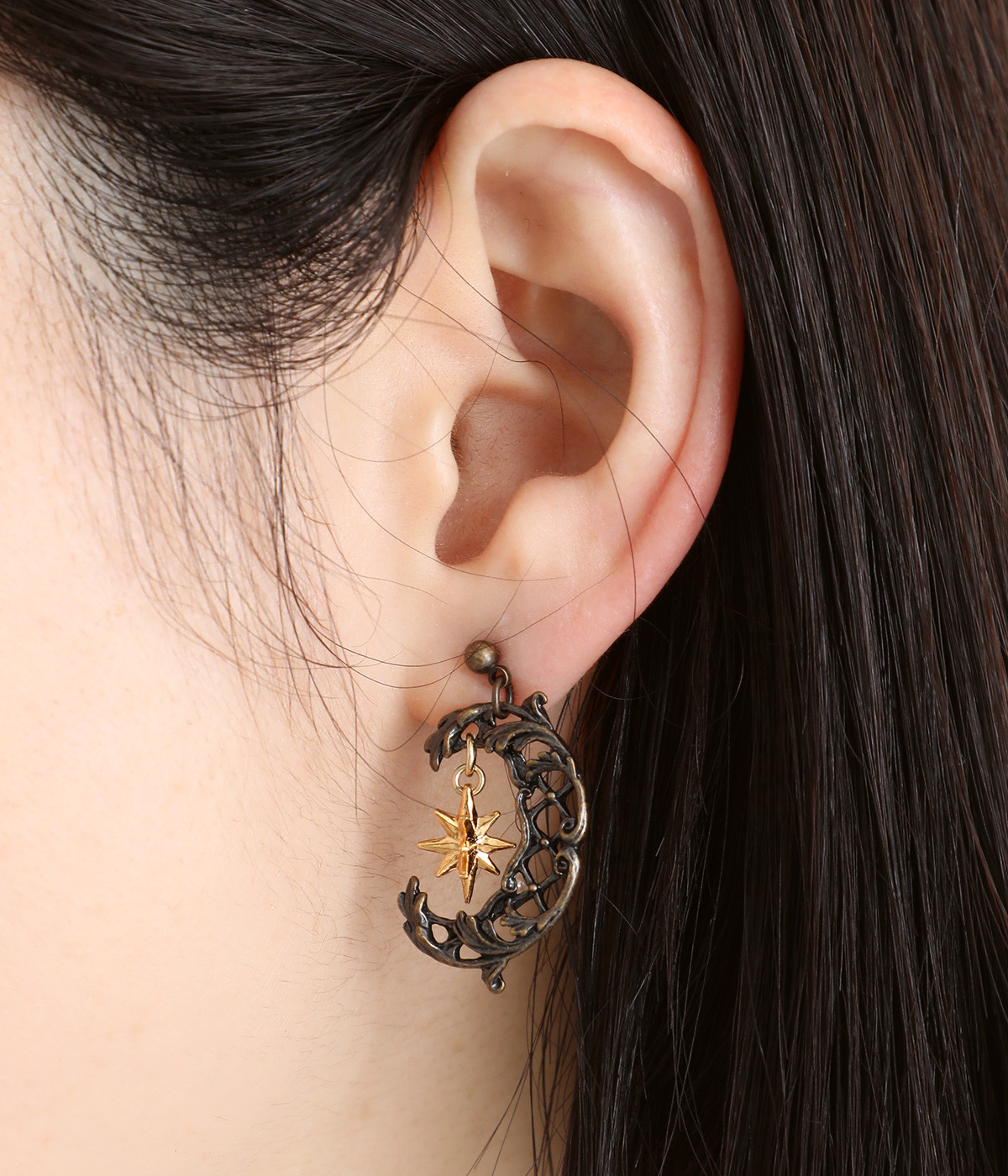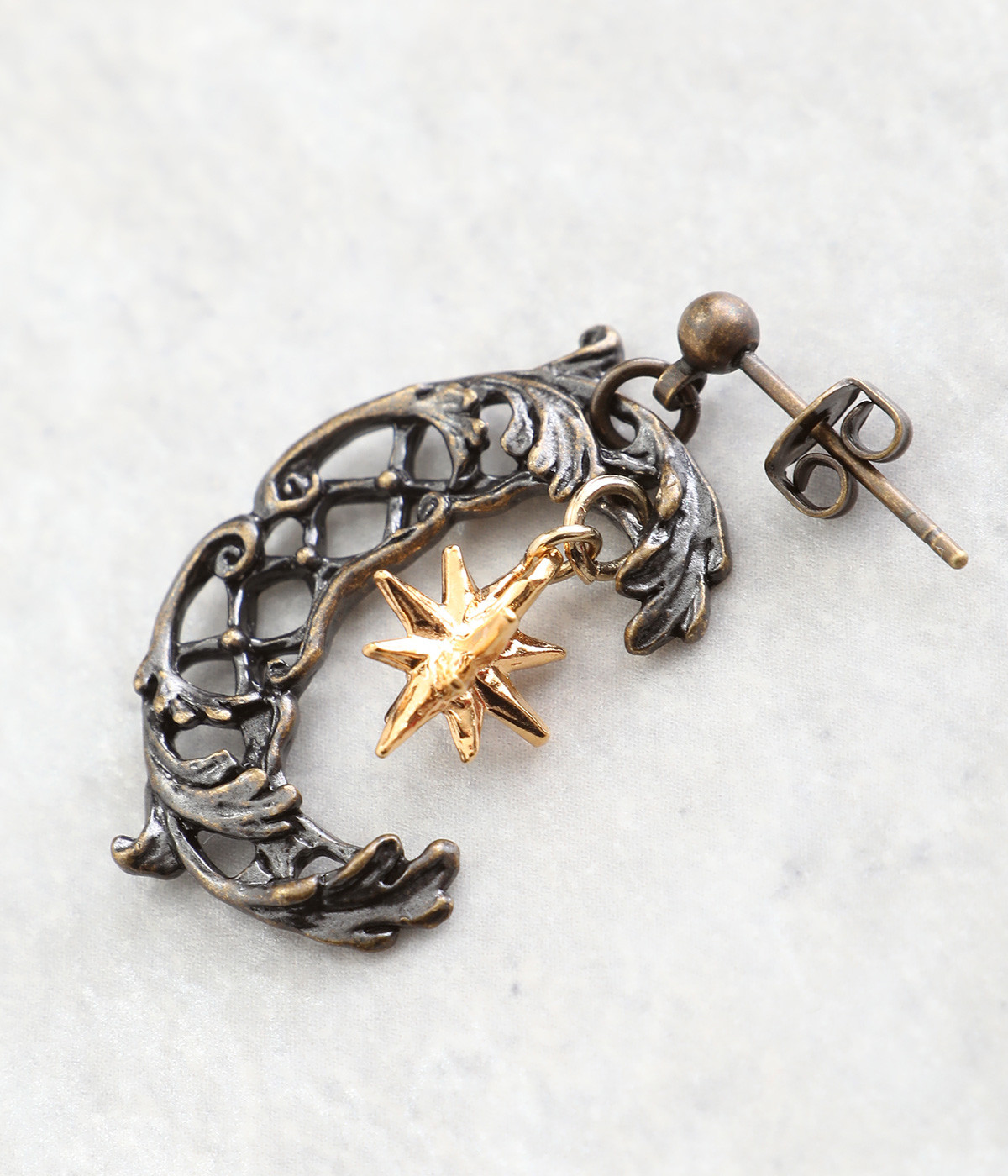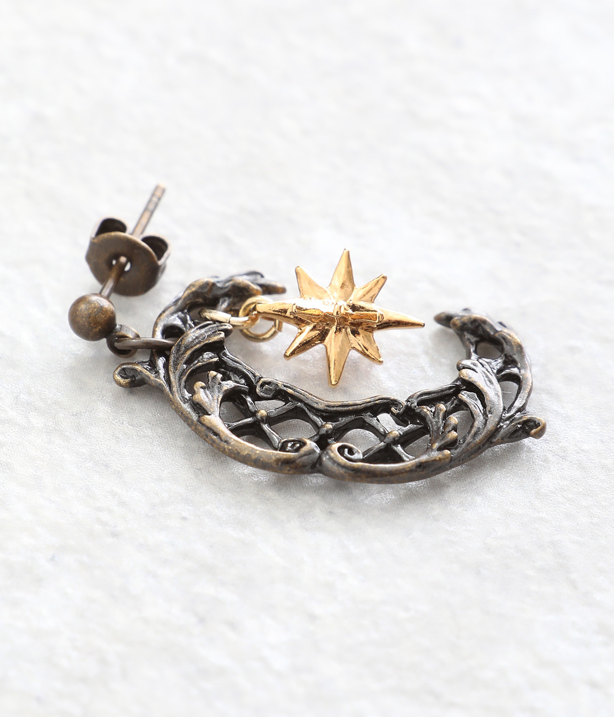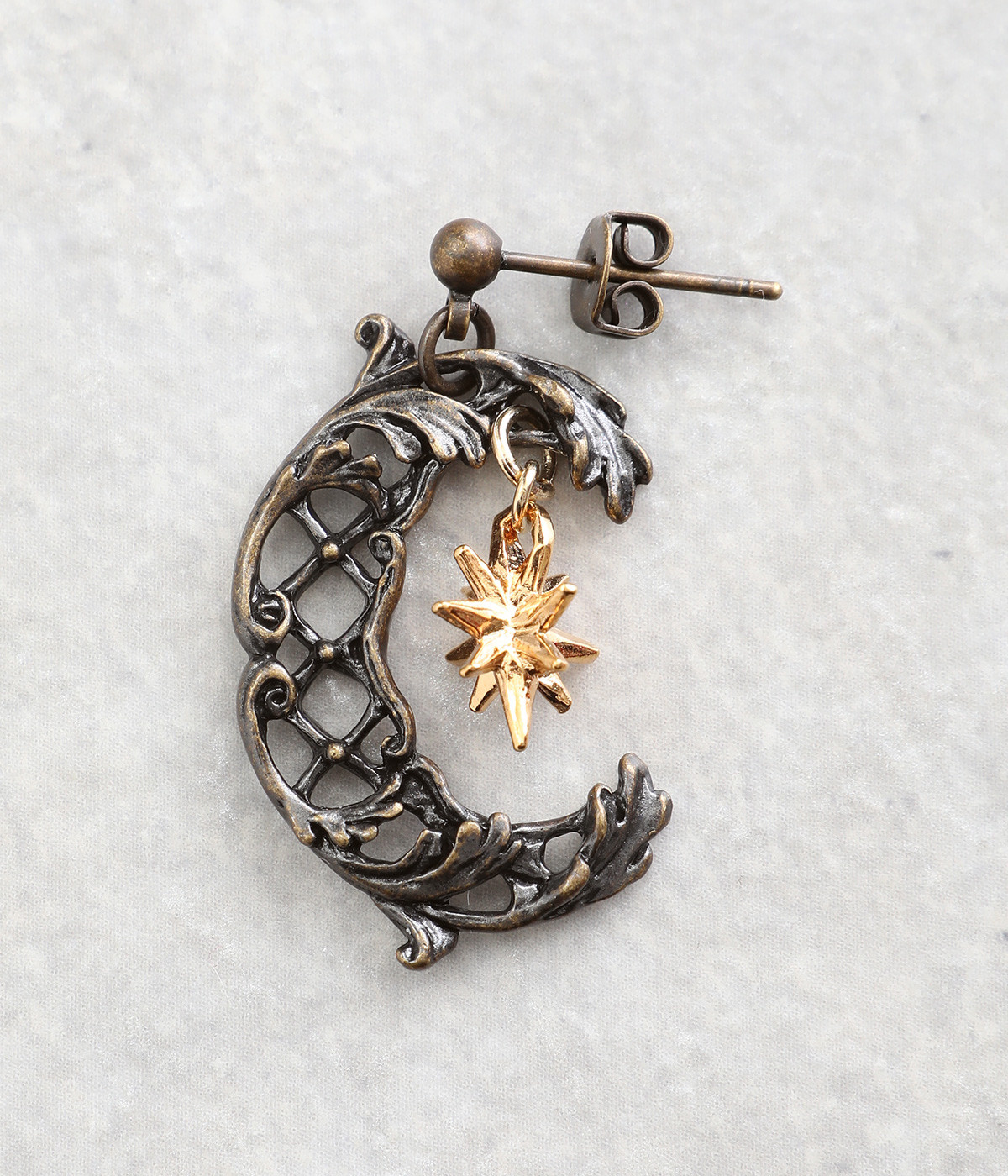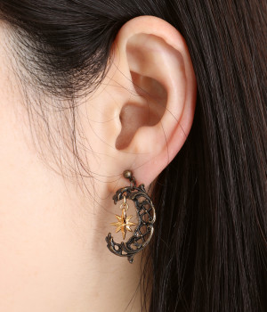 ルネサンス期に流行した文様を組み合わせてデザインされた三日月のピアス。「フランボワイアン様式」から着想を得た格子状をベースに、植物の美しい装飾「アカンサス文様」を取り入れたアンティーク風の一品です。耳元に落ち着きのあるニュアンスを添えてくれます。