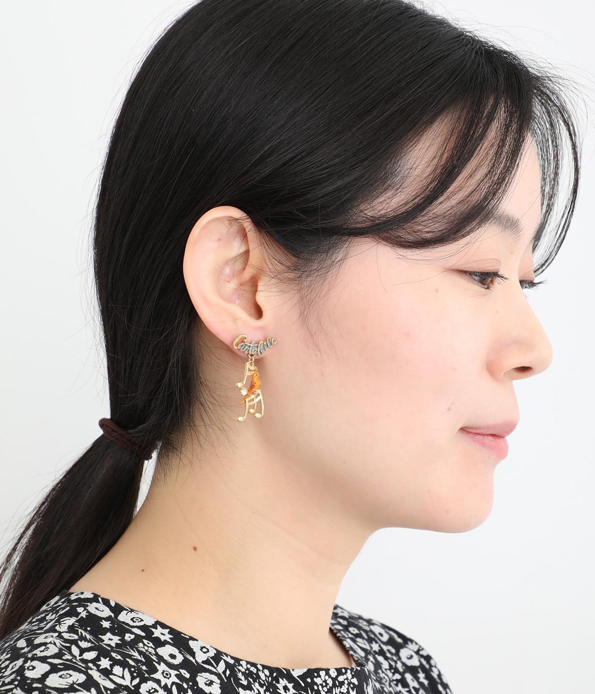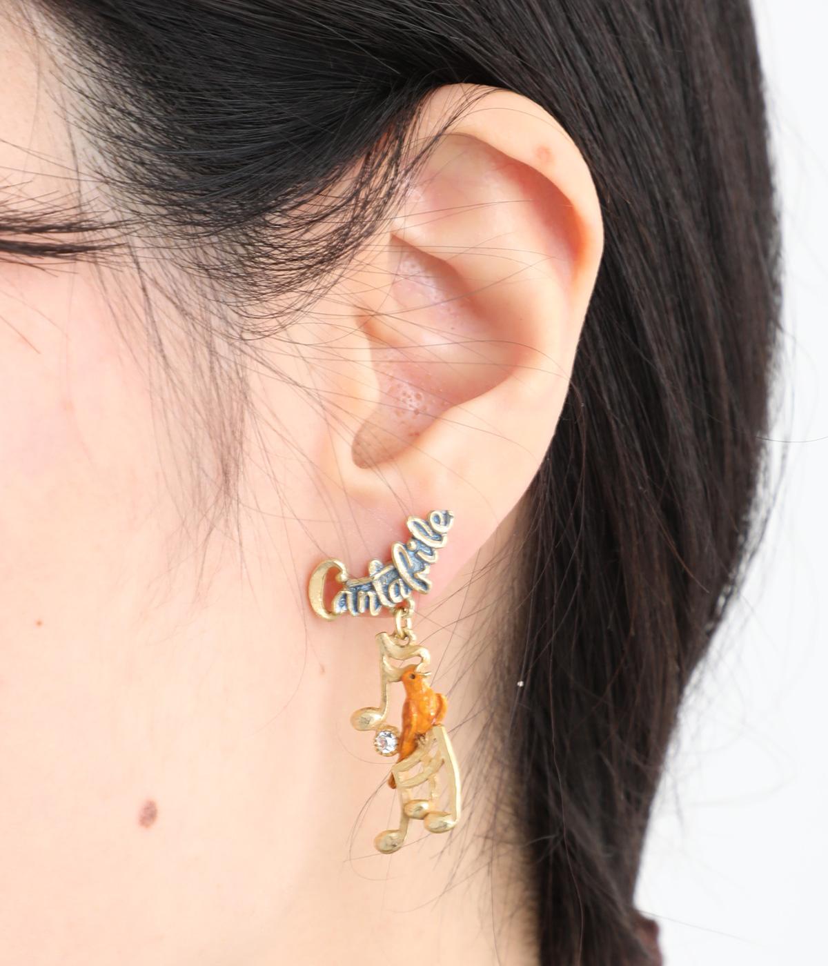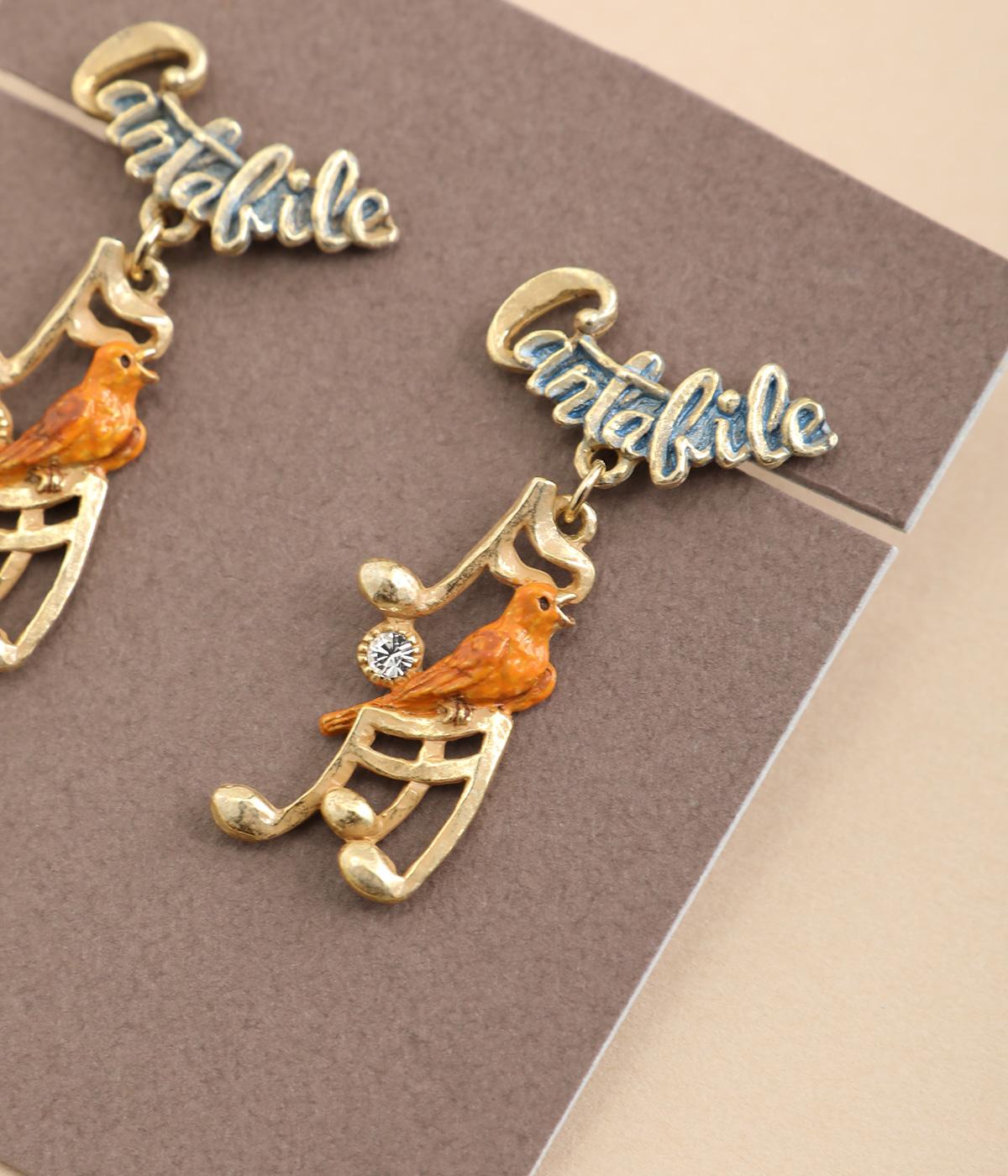 音の表現方法を示す発想記号のひとつで、「歌うように」を意味するCantabileから着想を得たピアスです。楽しげに歌うカナリアと、リズムに合わせて揺れる音符をあしらいました。中央にはカットガラスを配し、さりげないきらめきを添えています。