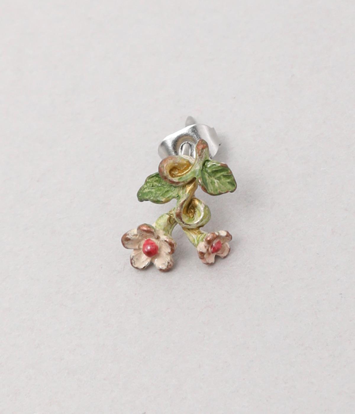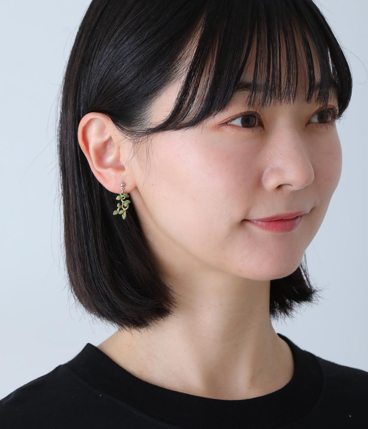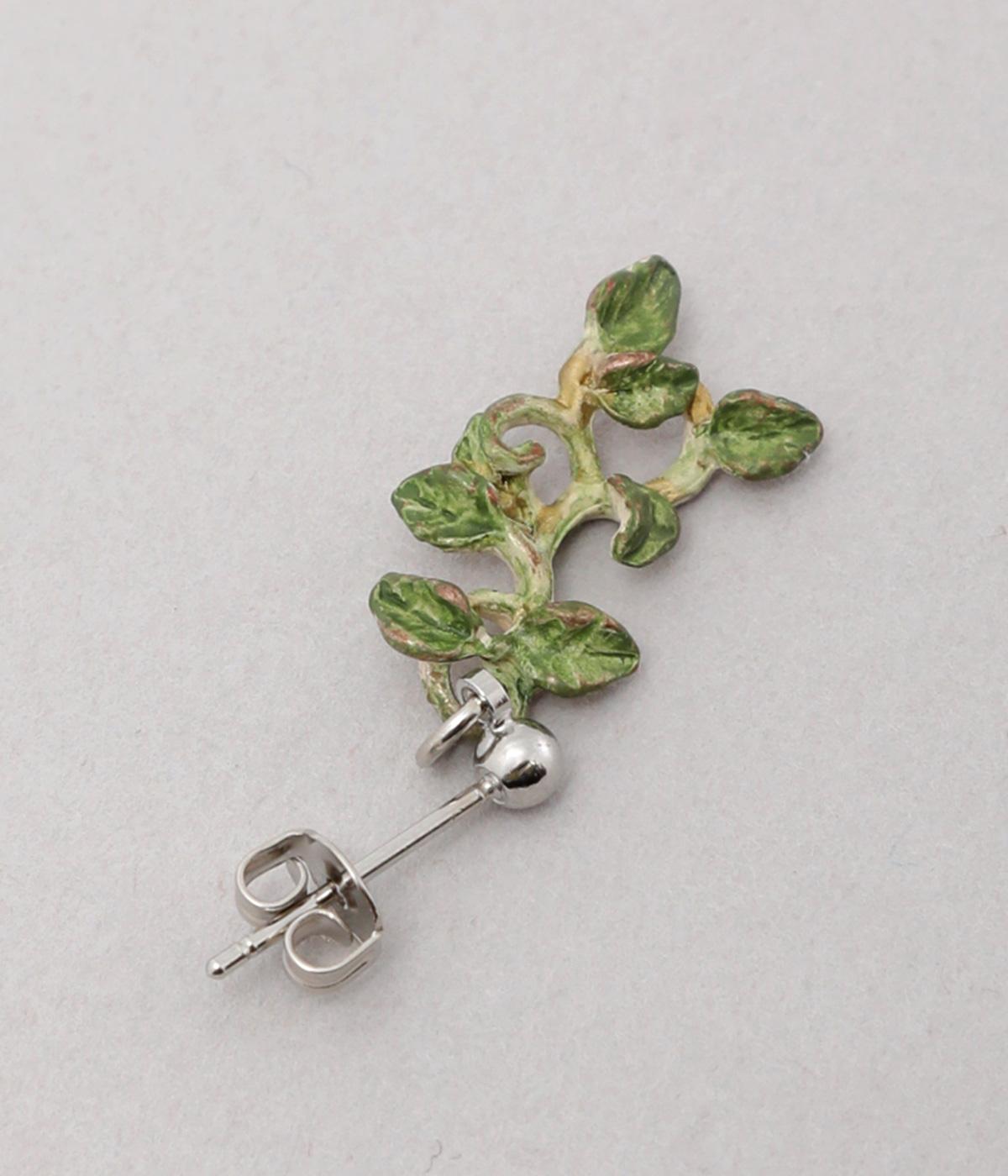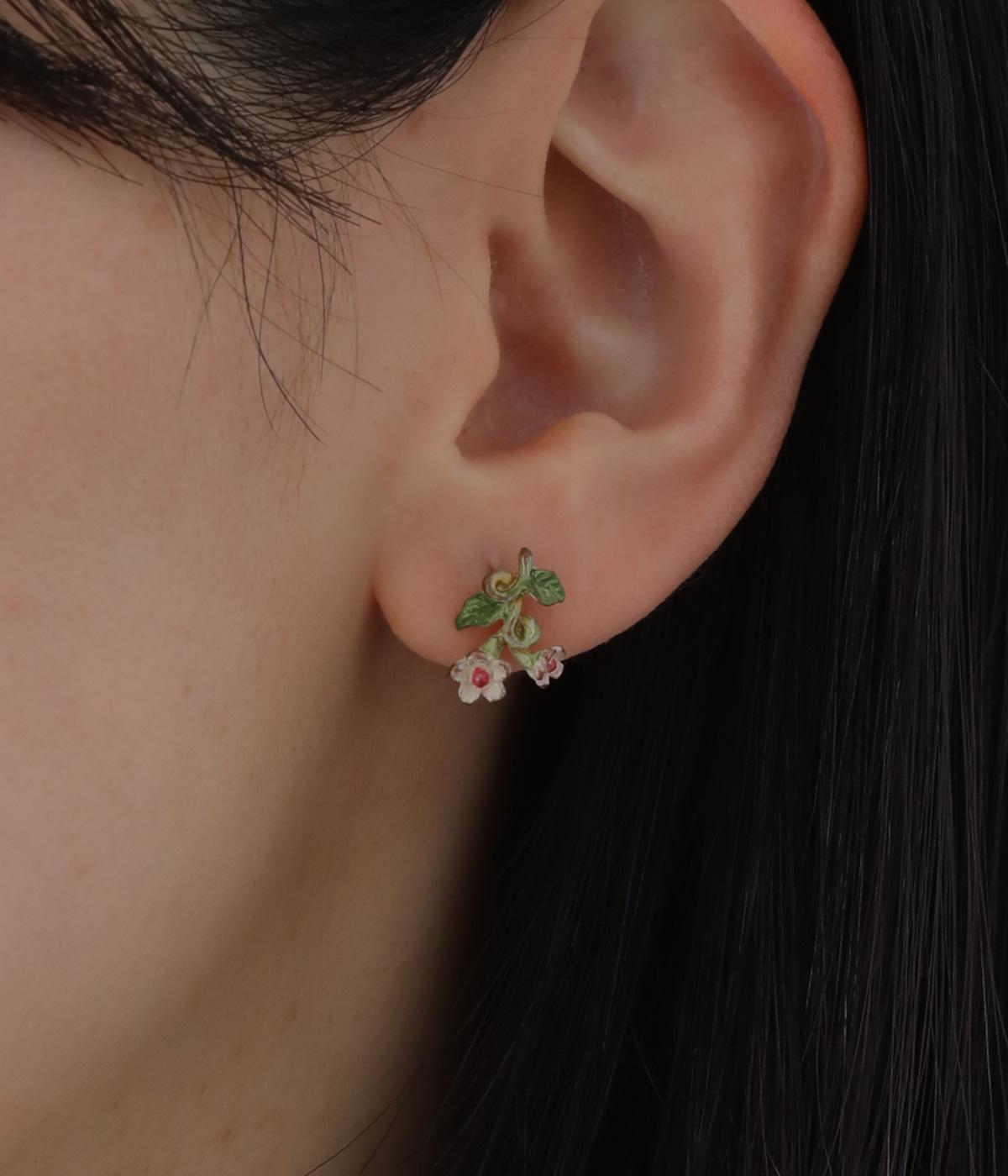 ゆるやかなツルのラインが優雅なサネカズラのピアス。左右で異なるシルエットで描かれたアシンメトリーデザインで、左には小さな花がふたつ、右にはゆらゆらと揺れるツタがあしらわれています。耳元に、可憐で可愛らしい印象を添えてくれます。