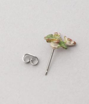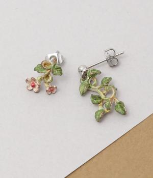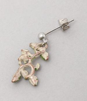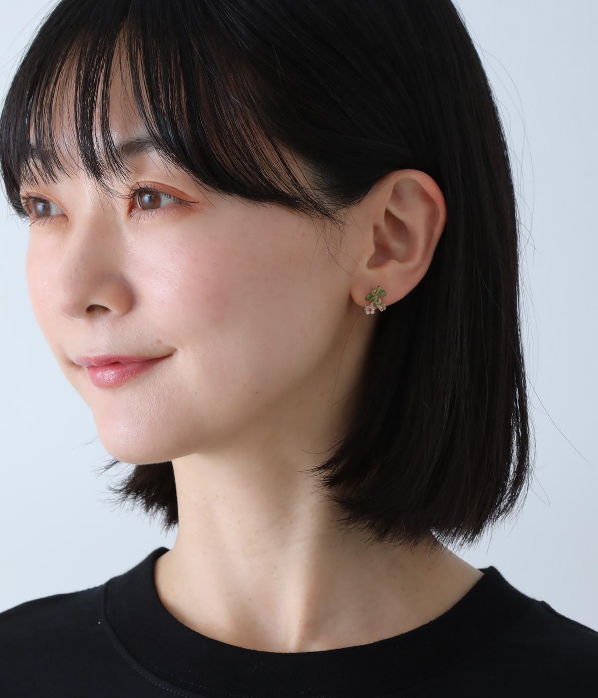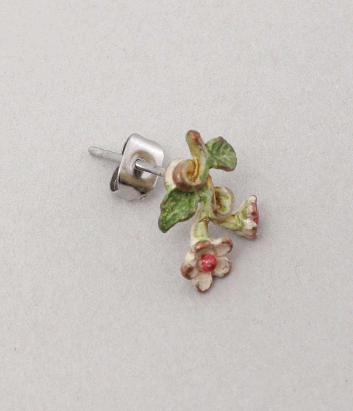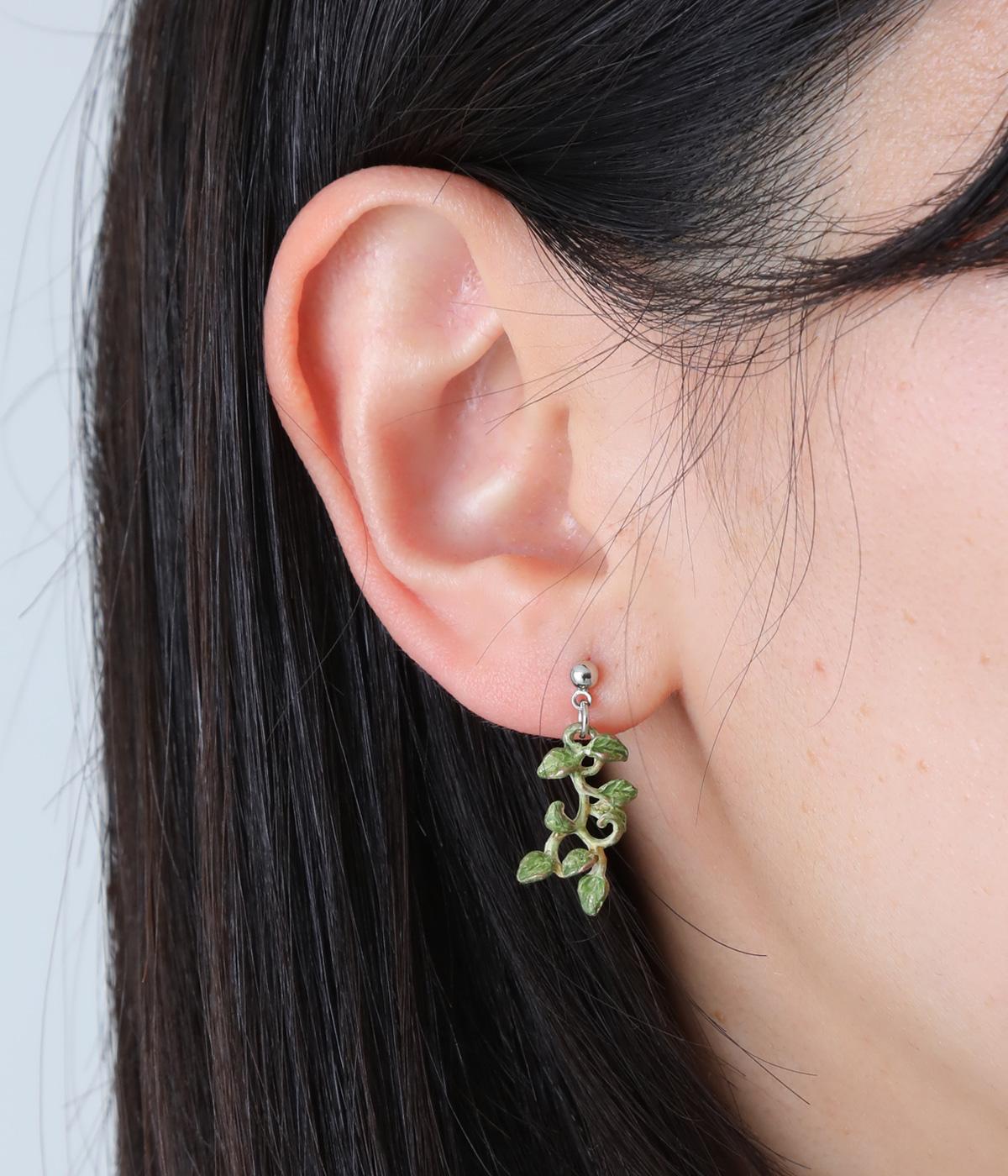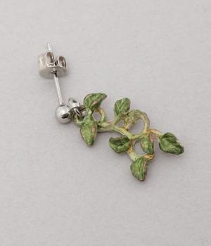ゆるやかなツルのラインが優雅なサネカズラのピアス。左右で異なるシルエットで描かれたアシンメトリーデザインで、左には小さな花がふたつ、右にはゆらゆらと揺れるツタがあしらわれています。耳元に、可憐で可愛らしい印象を添えてくれます。