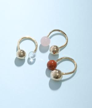 きらりとした輝きを放つ真鍮素材のリングに、つややかな水晶やローズクォーツ、レッドジャスパーといった天然石をデザインしています。