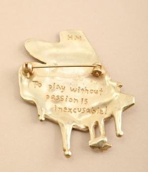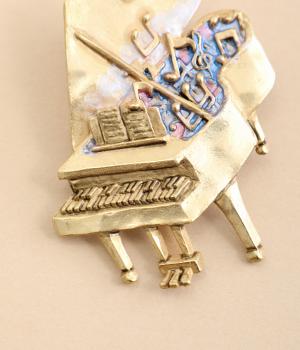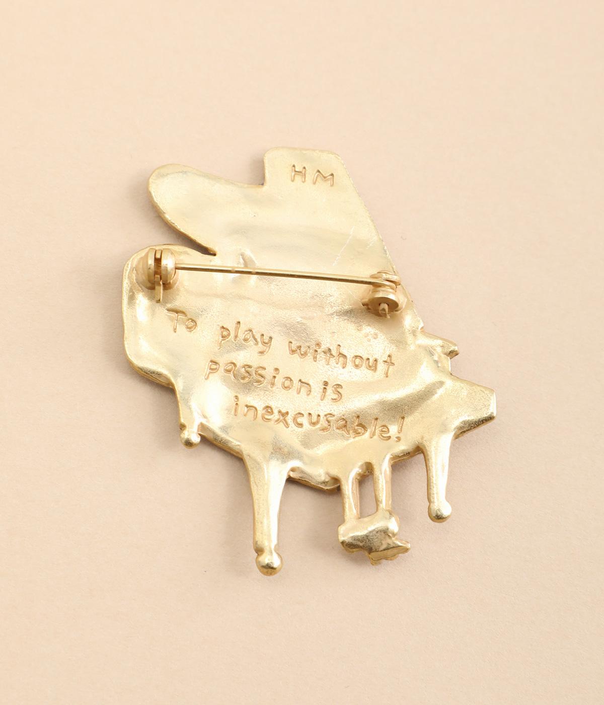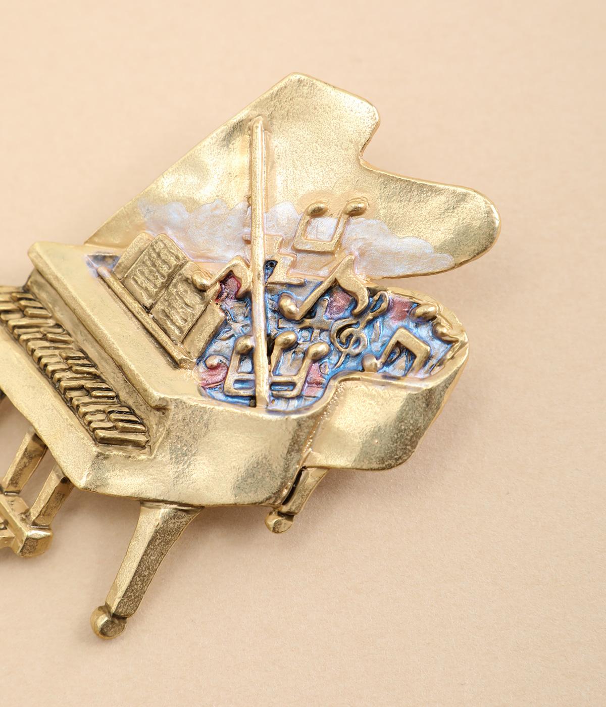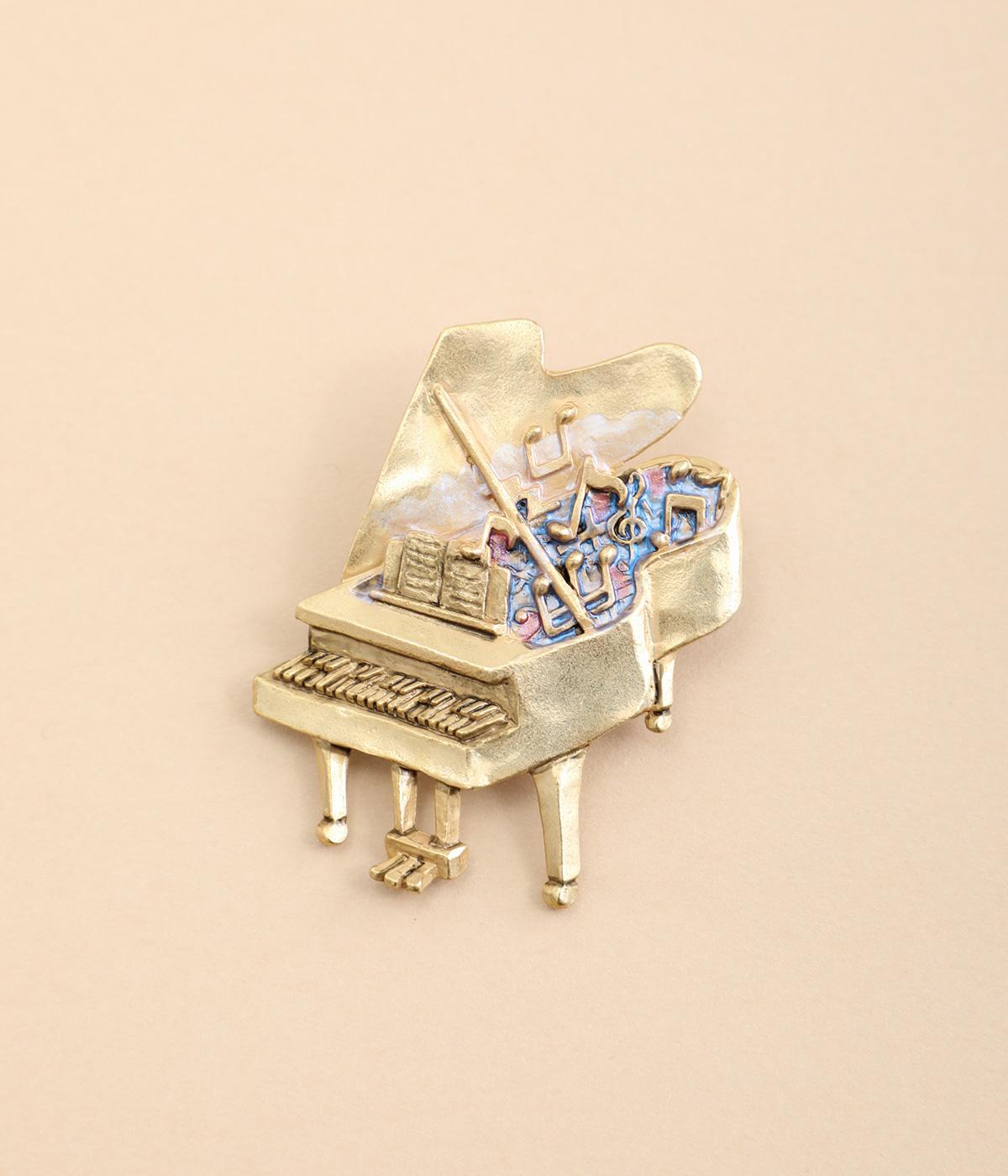 グランドピアノをかたどったブローチです。ピアノから音楽があふれ出すように音符や記号を散りばめ、楽しげに演奏する情景を表現しました。さまざまなアクセサリーと組み合わせて、お気に入りの曲を奏でているかのようなコーディネートが楽しめるアイテムです。