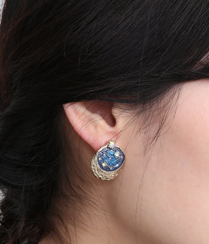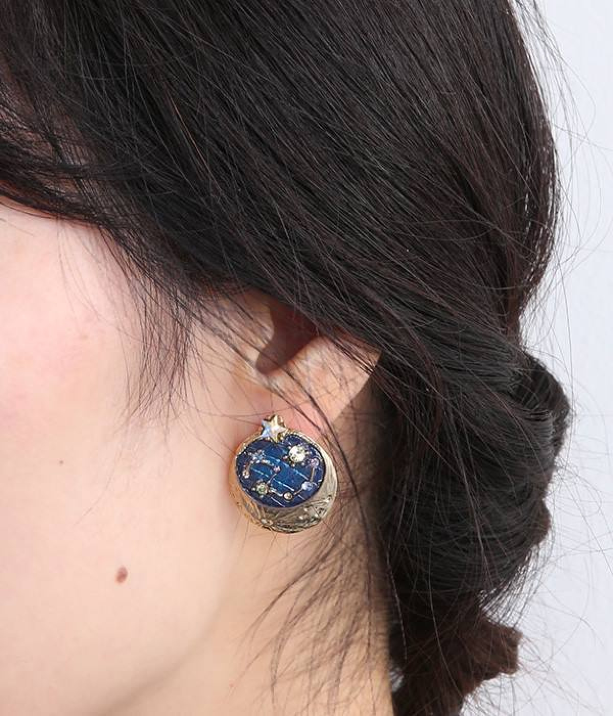 月と夜空をモチーフにしたピアス。北極星と北斗七星の瞬く幻想的な夜、月と星が夜空を照らしてかすかに明るくなる様子が表現された美しいデザインです。耳元に添えるだけで顔まわりがぐっと華やかになります。きれいめワンピースはもちろん、あえてカジュアルスタイルに合わせてアクセサリーを引き立てた使い方もおすすめ。見た目以上に軽量で疲れにくいのもうれしいポイントです。