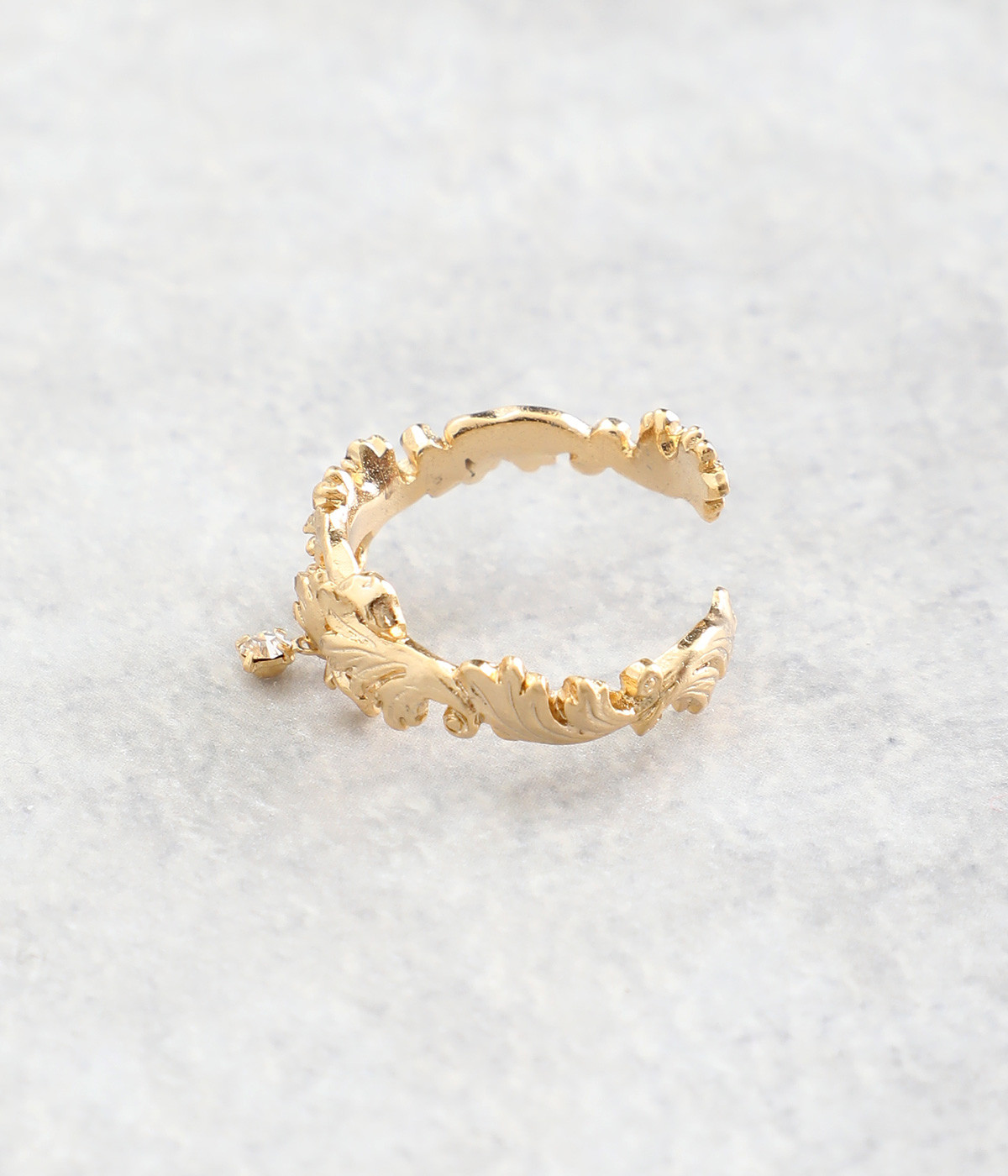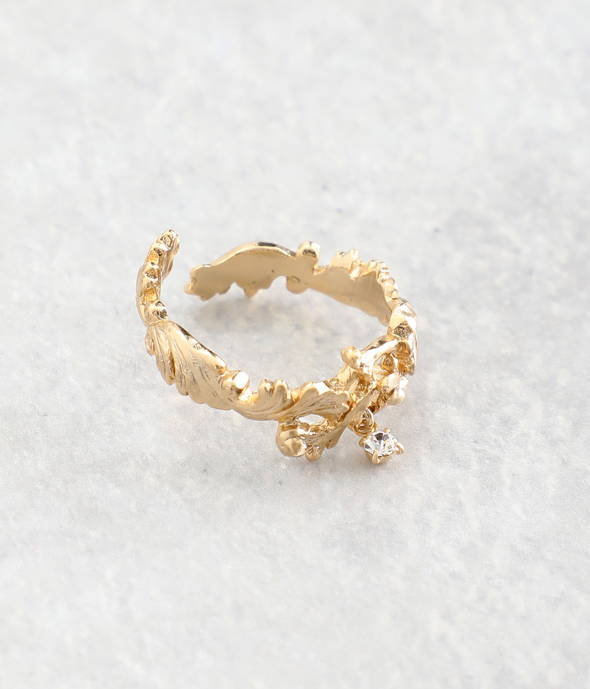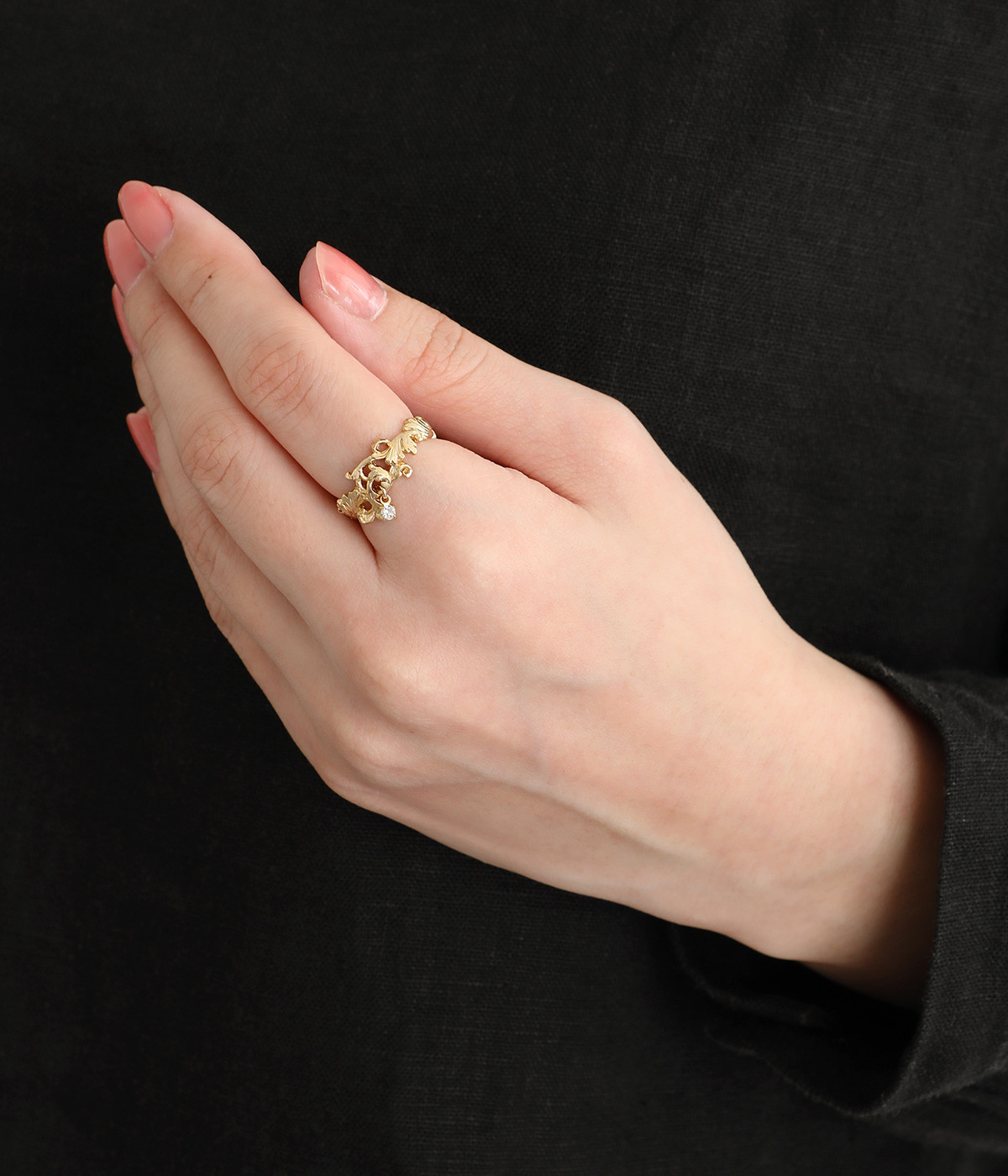 中世ヨーロッパを連想させるアカンサス文様を落とし込んだリングです。古代ローマ時代に流行した装飾性の強いデザインをモチーフにしています。動くたびにカットガラスが小さく揺れて、気品の溢れるアクセントに。シンプルなカラーで身につけやすく、普段使いにもぴったりです。