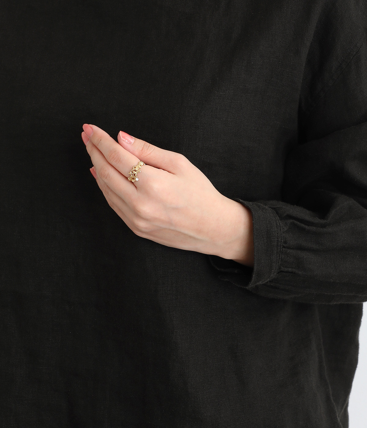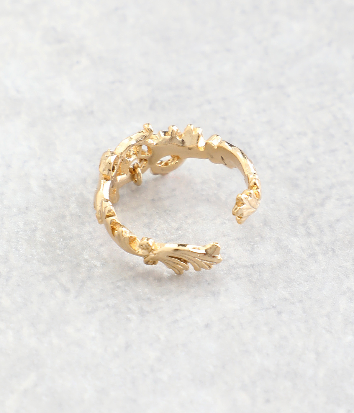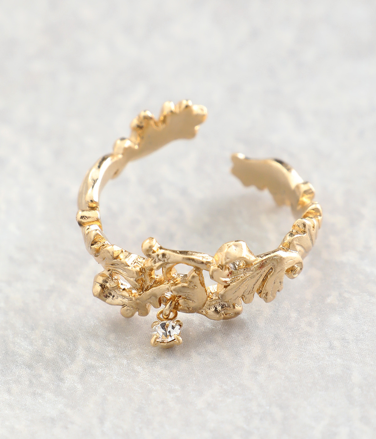 中世ヨーロッパを連想させるアカンサス文様を落とし込んだリングです。古代ローマ時代に流行した装飾性の強いデザインをモチーフにしています。動くたびにカットガラスが小さく揺れて、気品の溢れるアクセントに。シンプルなカラーで身につけやすく、普段使いにもぴったりです。