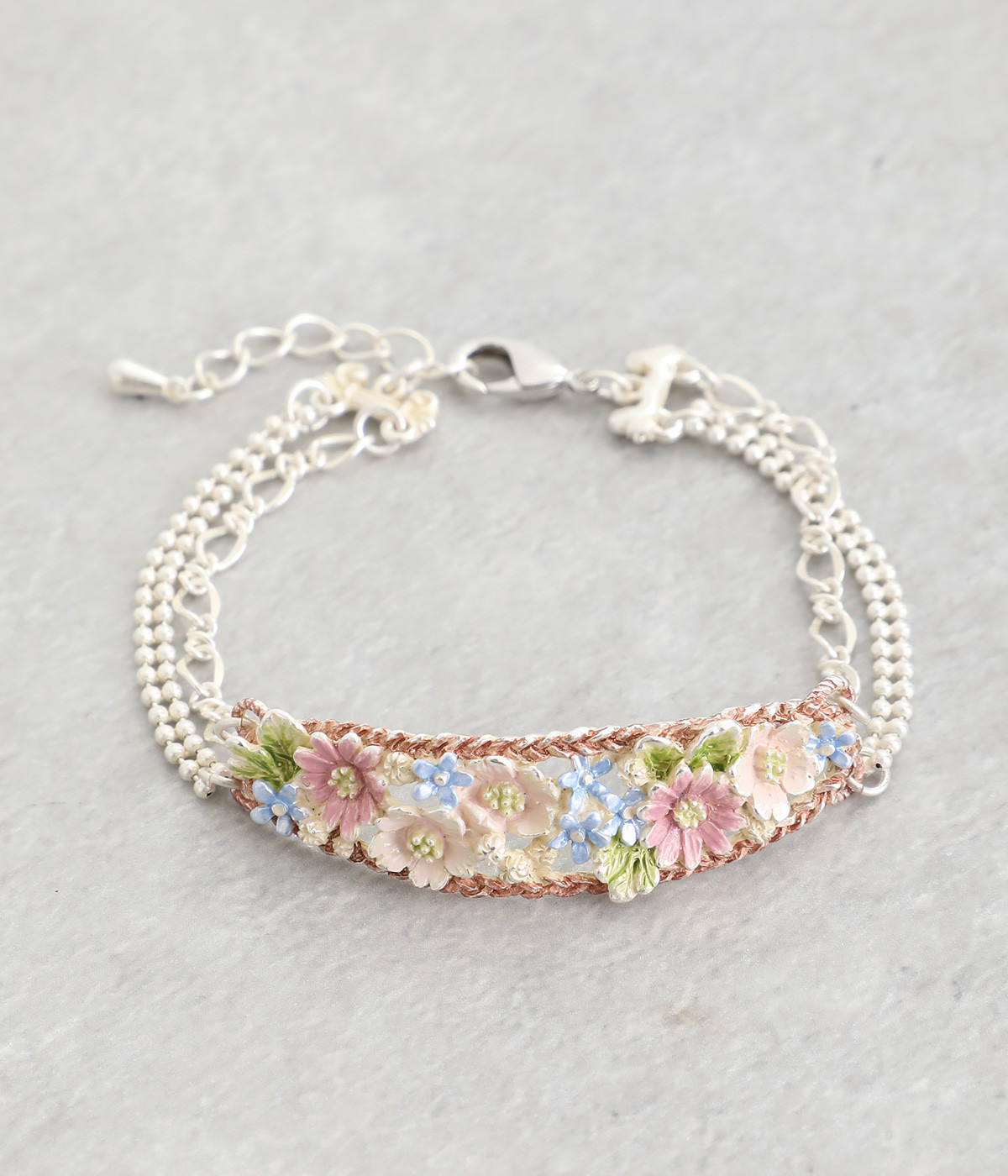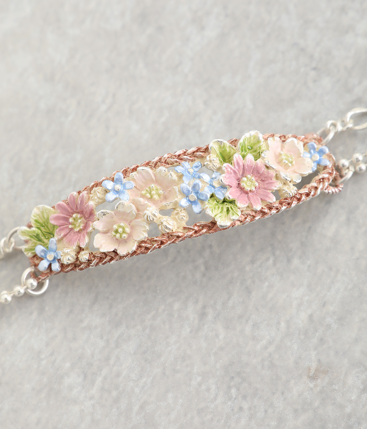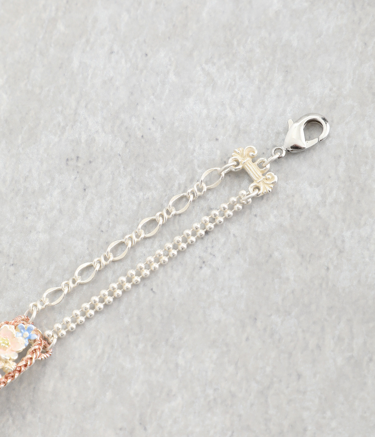 ぎゅっと花々を詰め込んだバスケットがモチーフのブレスレット。花束が飾り付けられたバスケットの中を上から覗き込んだようなデザインになっています。花々の間には透かしを多く入れ、軽やかな印象に。チェーン仕様になっているので、サイズ感の調節が可能です。