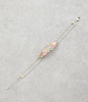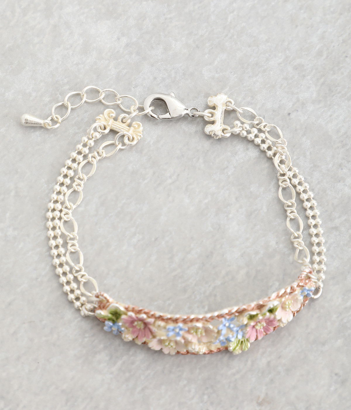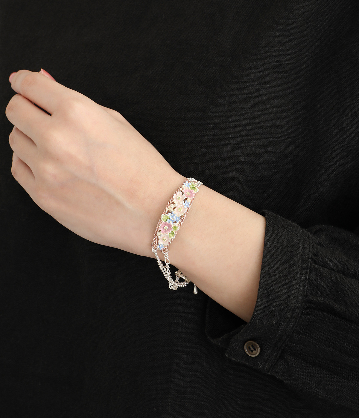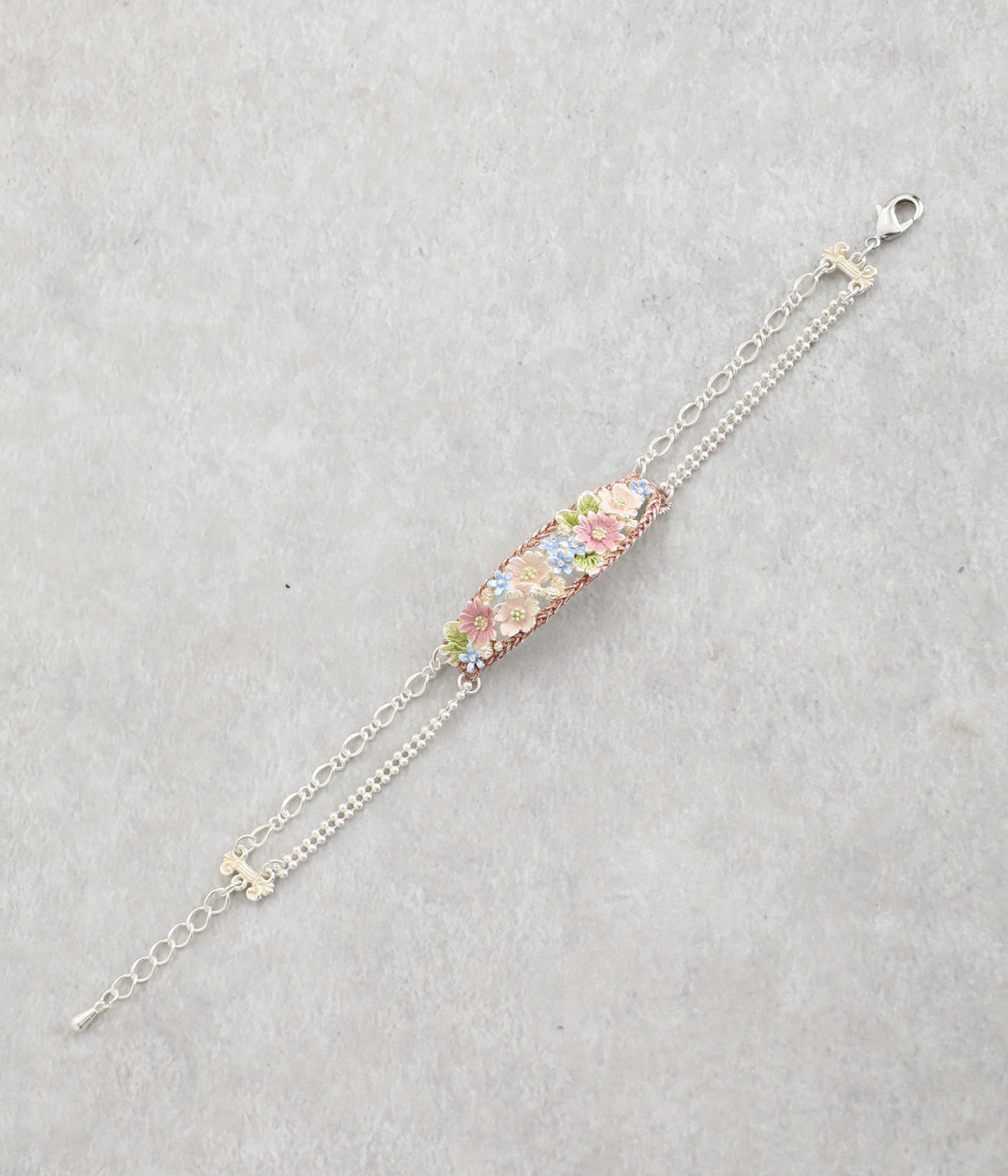 ぎゅっと花々を詰め込んだバスケットがモチーフのブレスレット。花束が飾り付けられたバスケットの中を上から覗き込んだようなデザインになっています。花々の間には透かしを多く入れ、軽やかな印象に。チェーン仕様になっているので、サイズ感の調節が可能です。