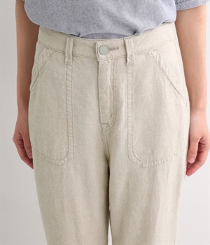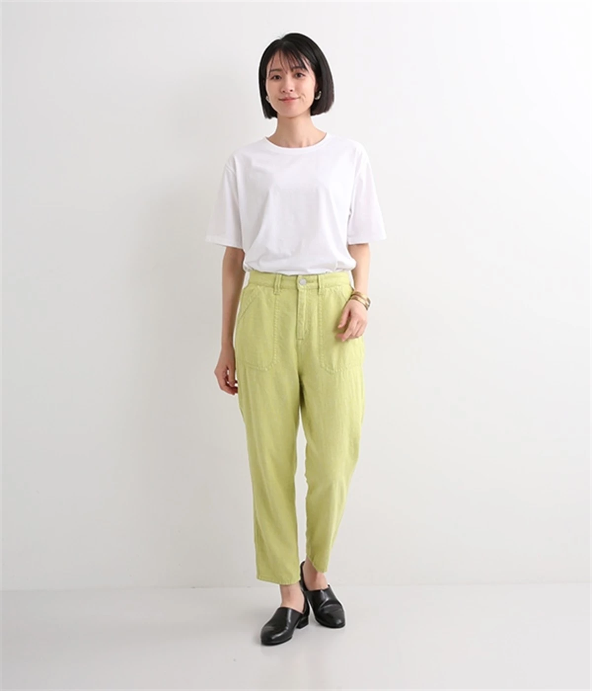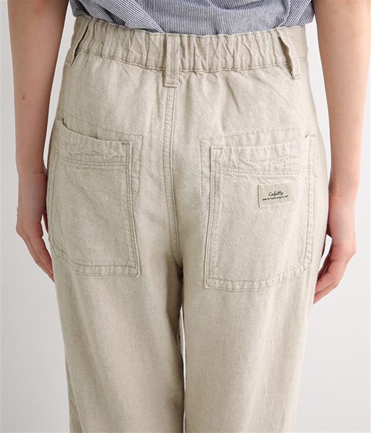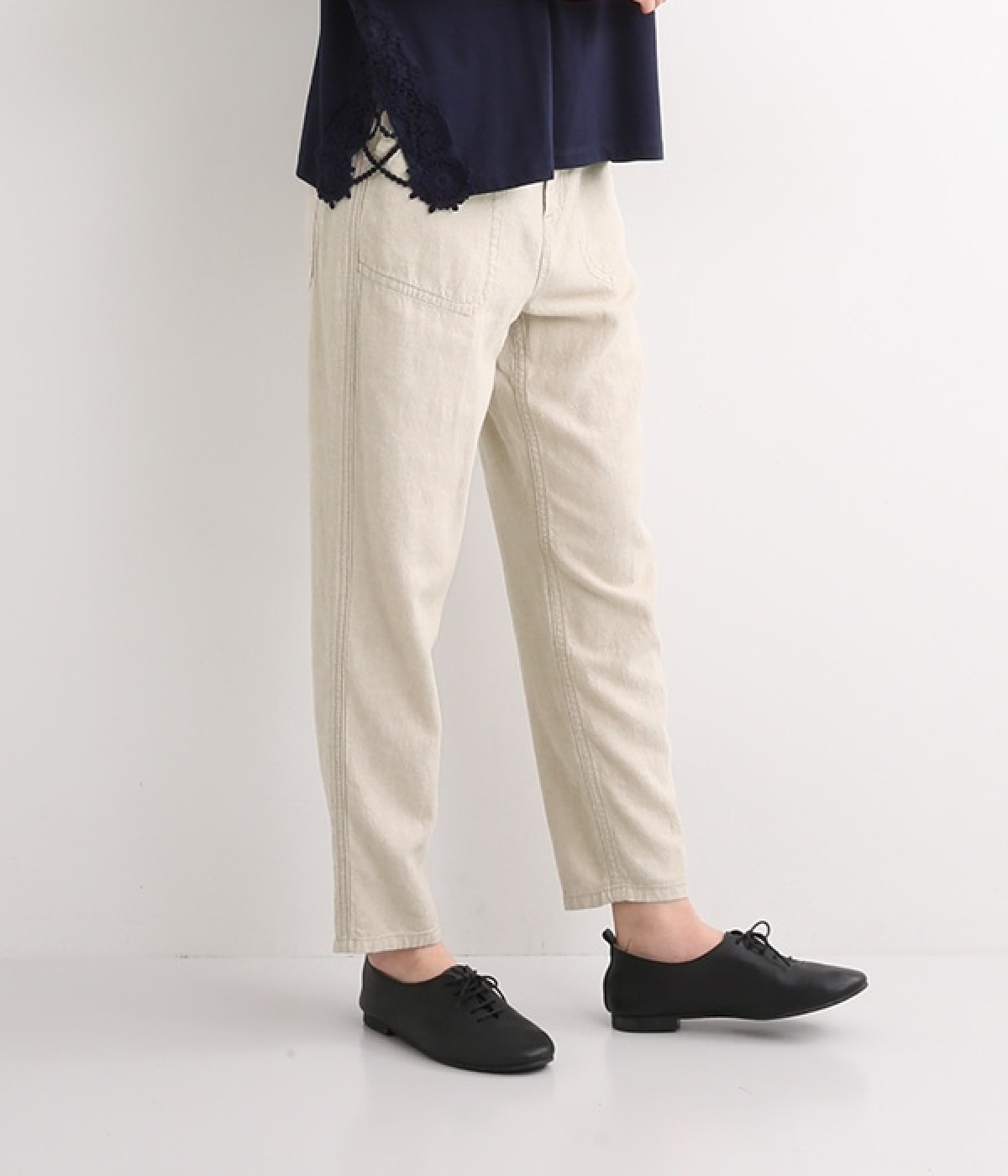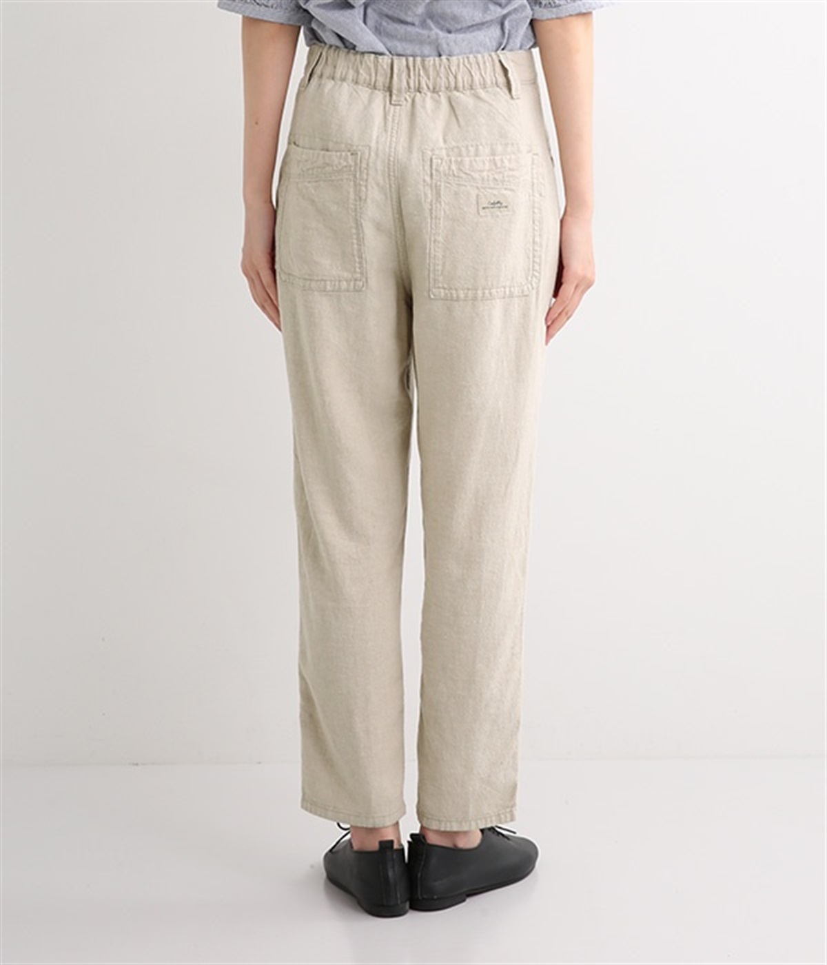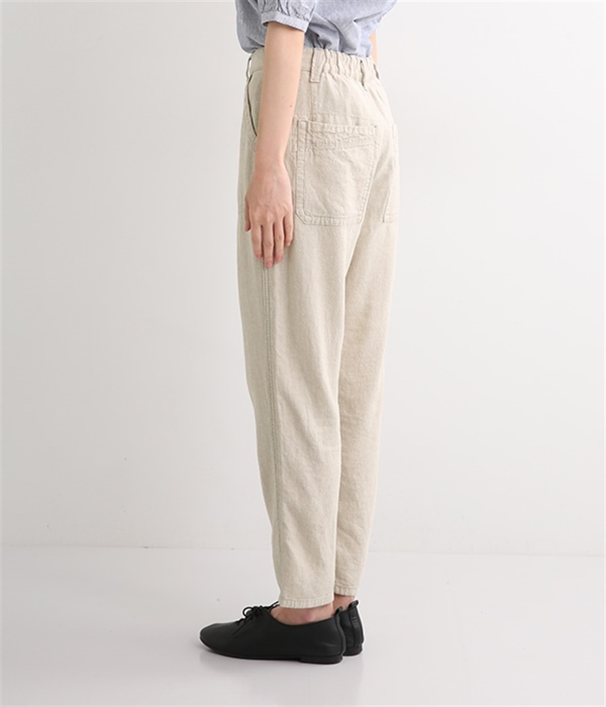 ヒップの丸みをなくし、すっきりシルエットに仕立てたテーパードパンツです。ベイカーパンツがデザインソースで、前の貼りポケットをステッチワークで表現しています。後ろにゴムを入れたウエストは、窮屈感なく着用できます。太めのループをつけているので、ベルトでウエストマークした着こなしも◎。