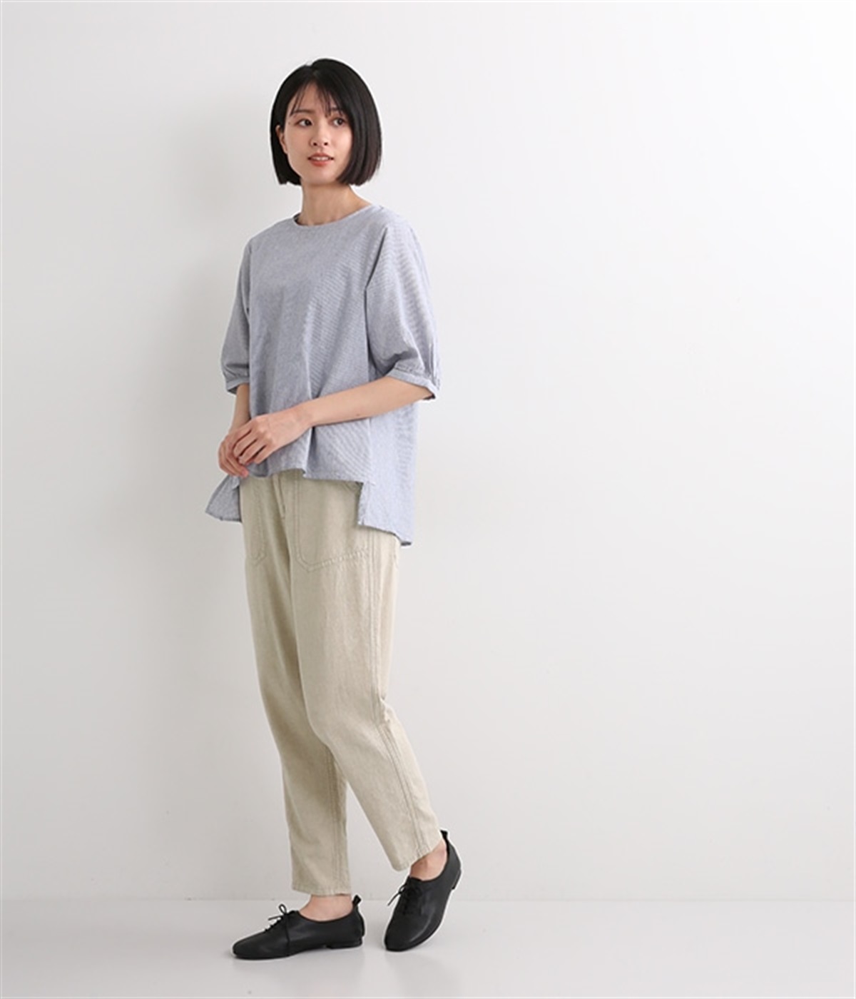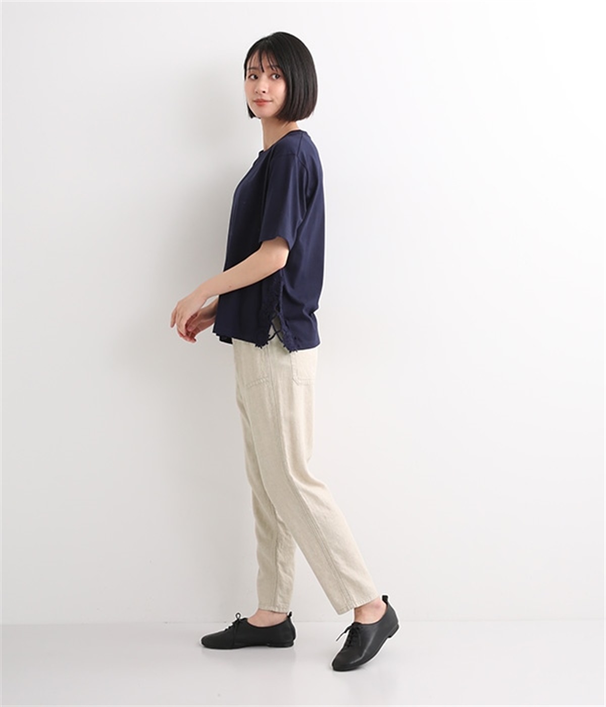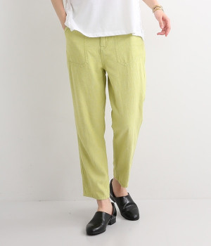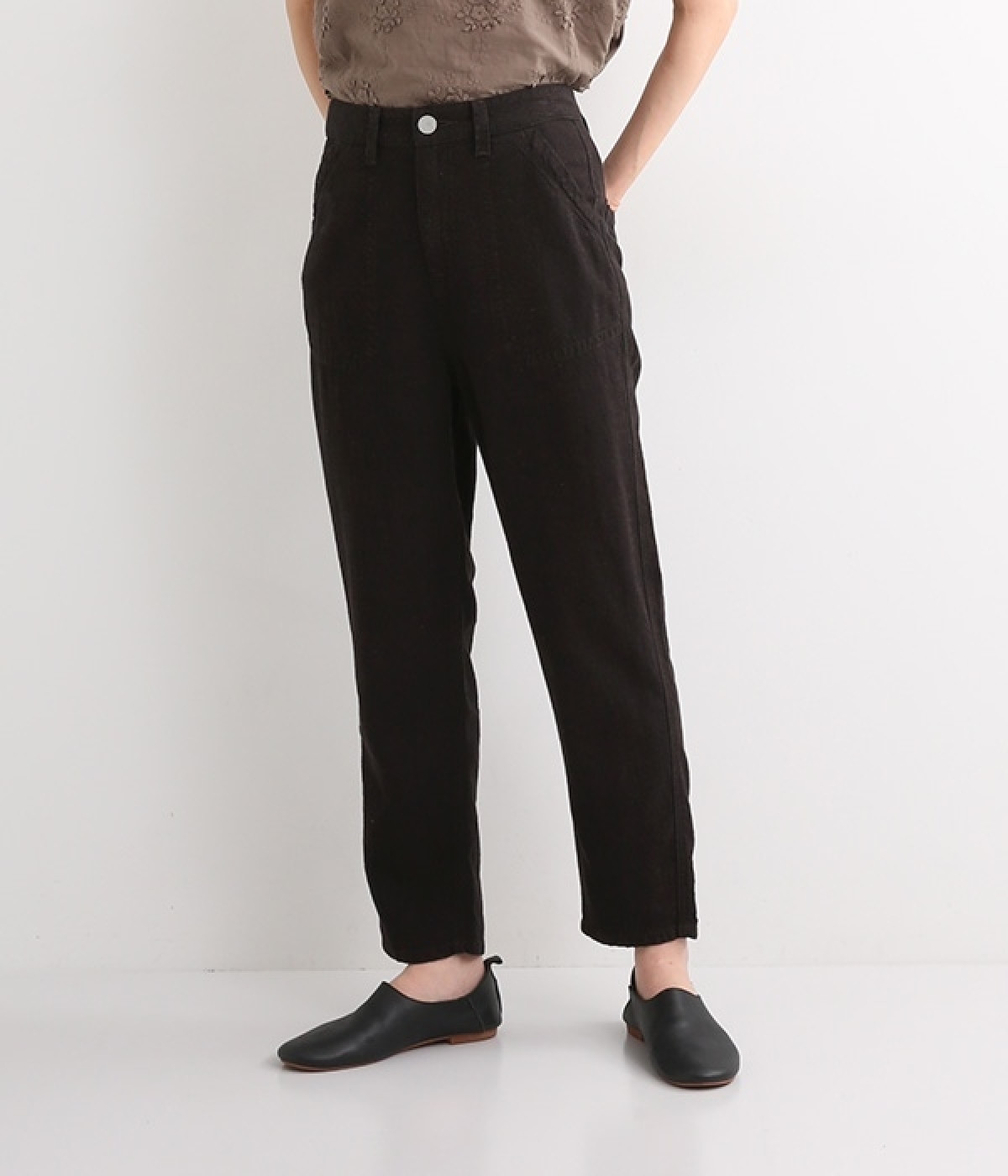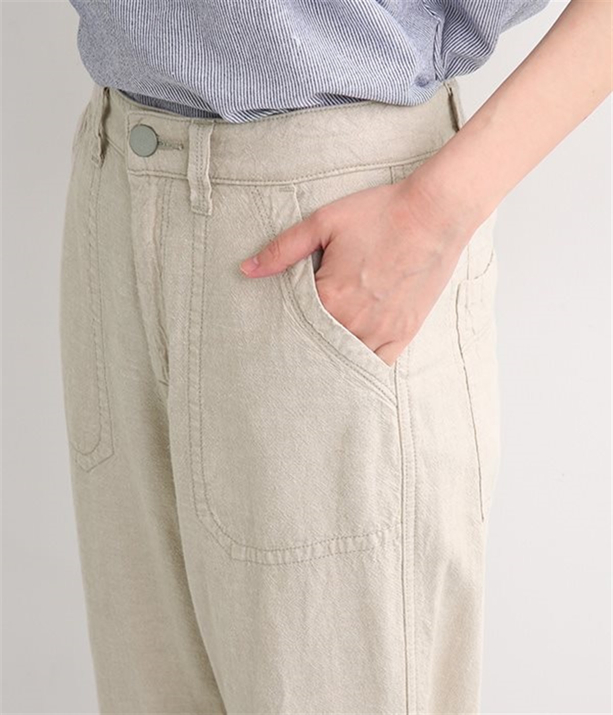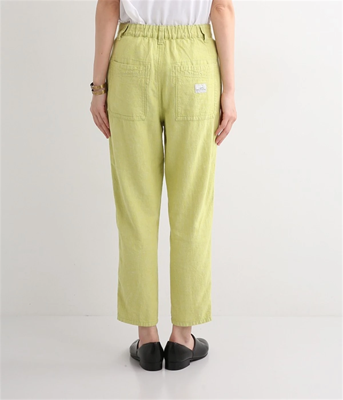 ヒップの丸みをなくし、すっきりシルエットに仕立てたテーパードパンツです。ベイカーパンツがデザインソースで、前の貼りポケットをステッチワークで表現しています。後ろにゴムを入れたウエストは、窮屈感なく着用できます。太めのループをつけているので、ベルトでウエストマークした着こなしも◎。