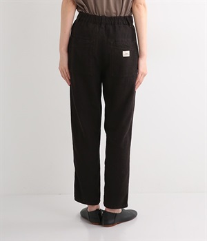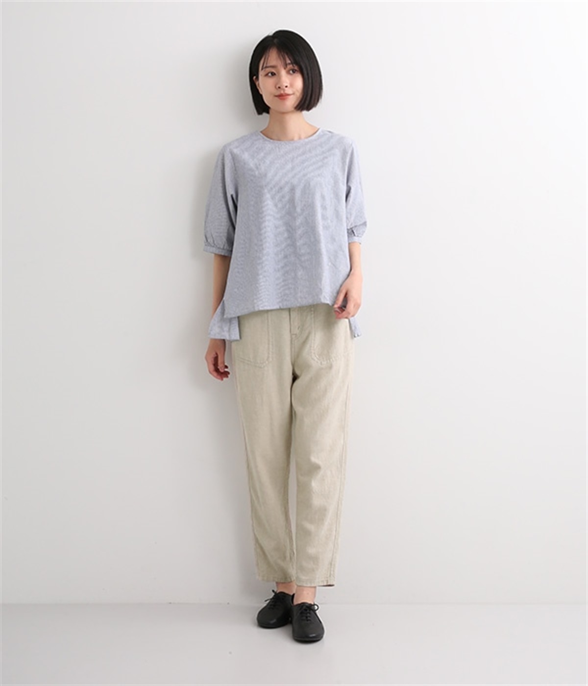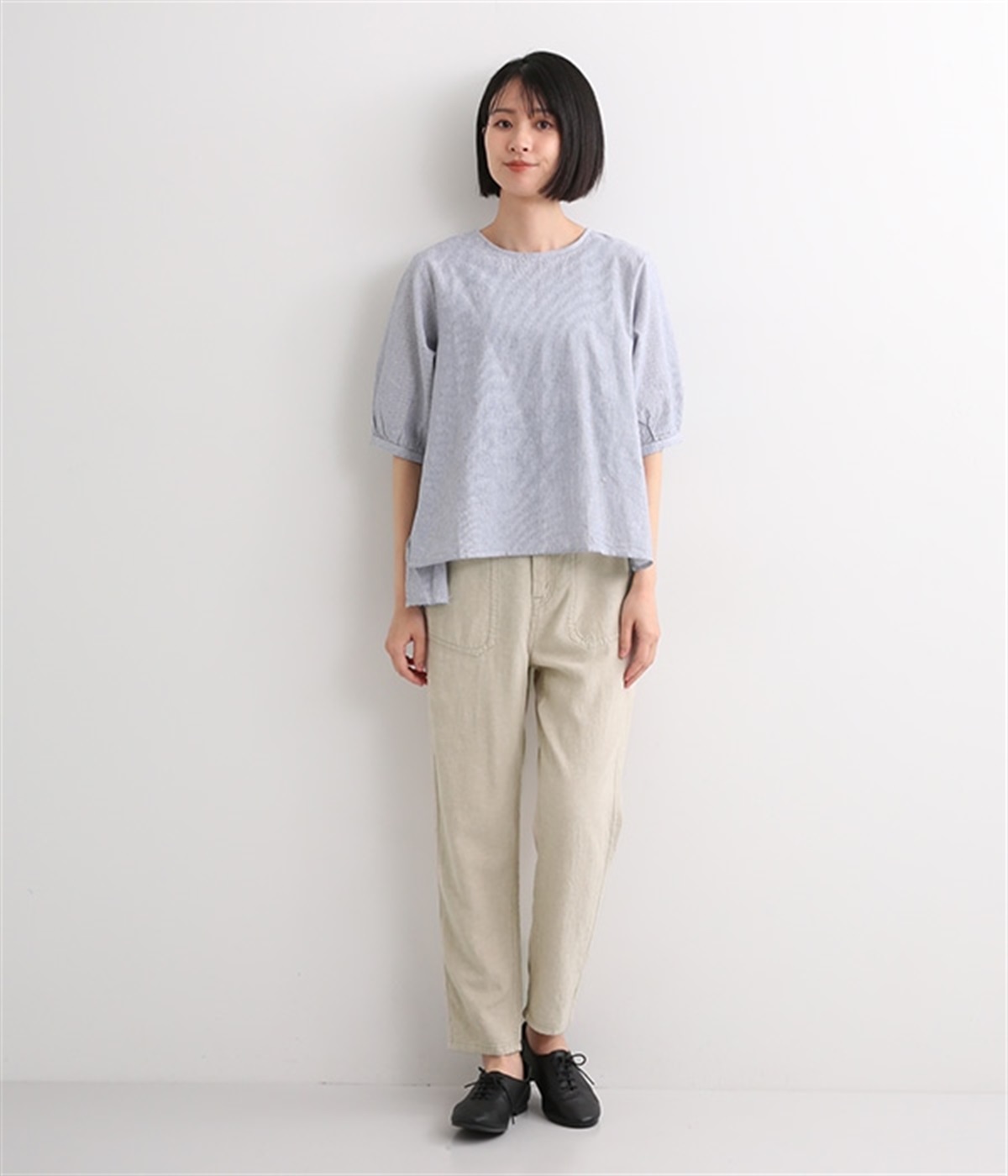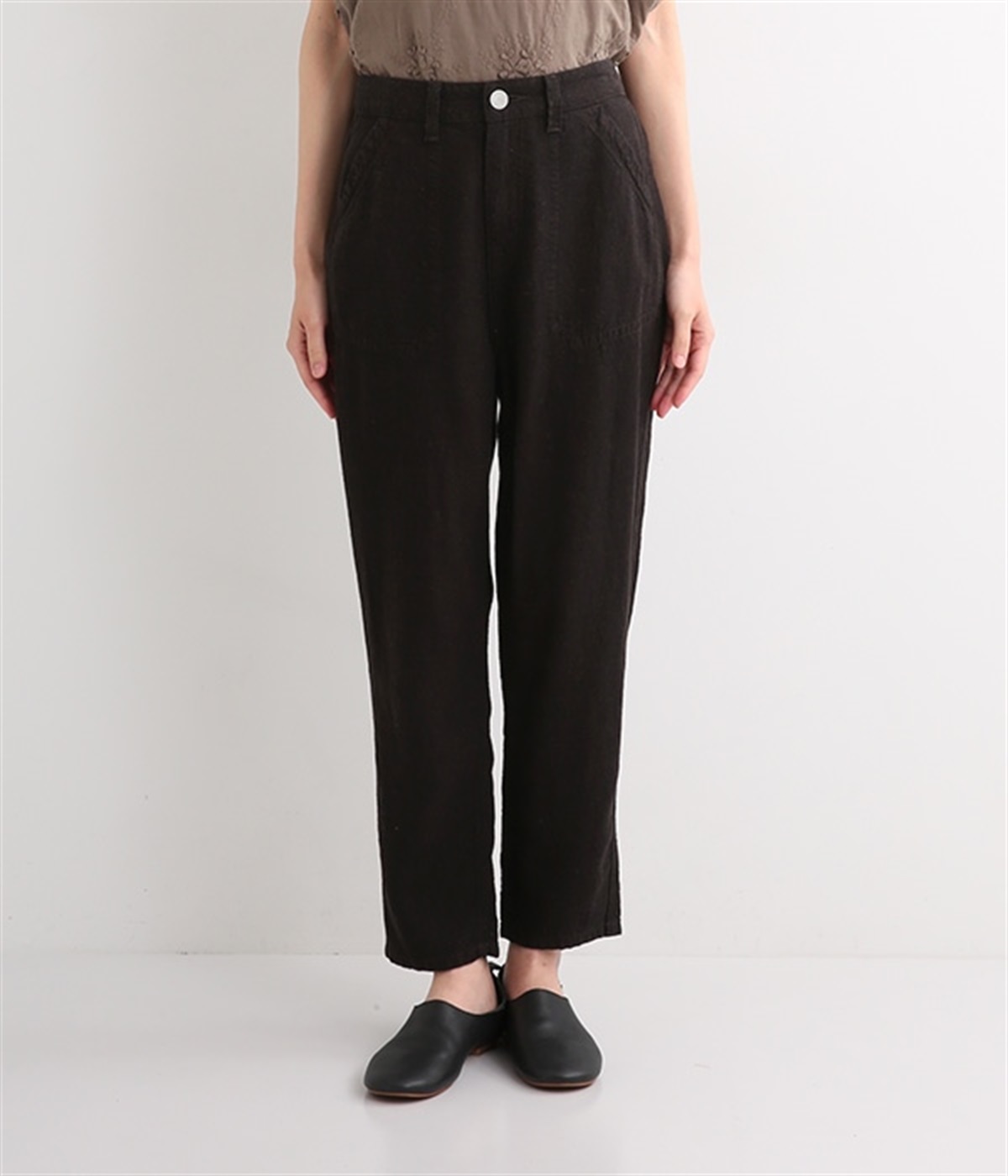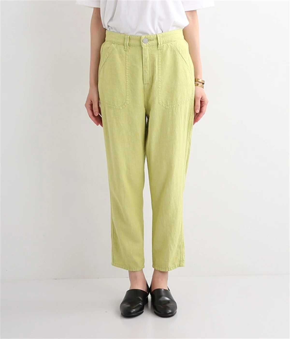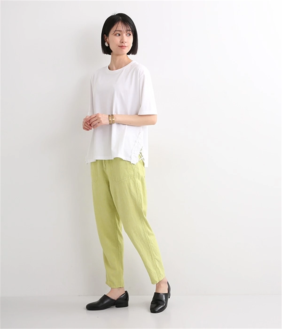 ヒップの丸みをなくし、すっきりシルエットに仕立てたテーパードパンツです。ベイカーパンツがデザインソースで、前の貼りポケットをステッチワークで表現しています。後ろにゴムを入れたウエストは、窮屈感なく着用できます。太めのループをつけているので、ベルトでウエストマークした着こなしも◎。