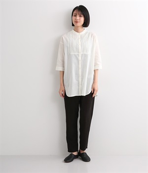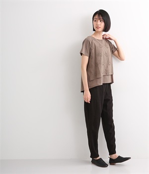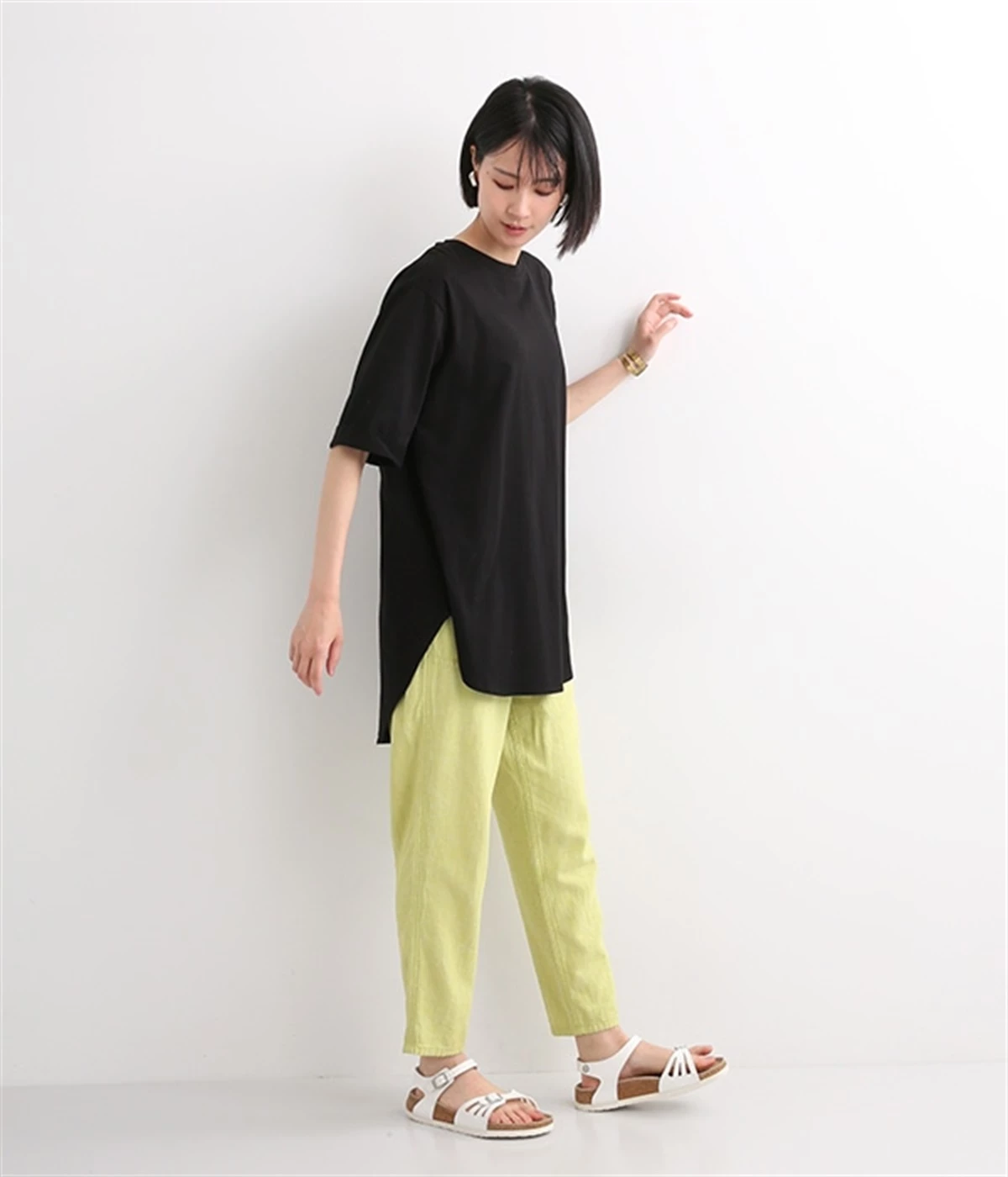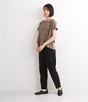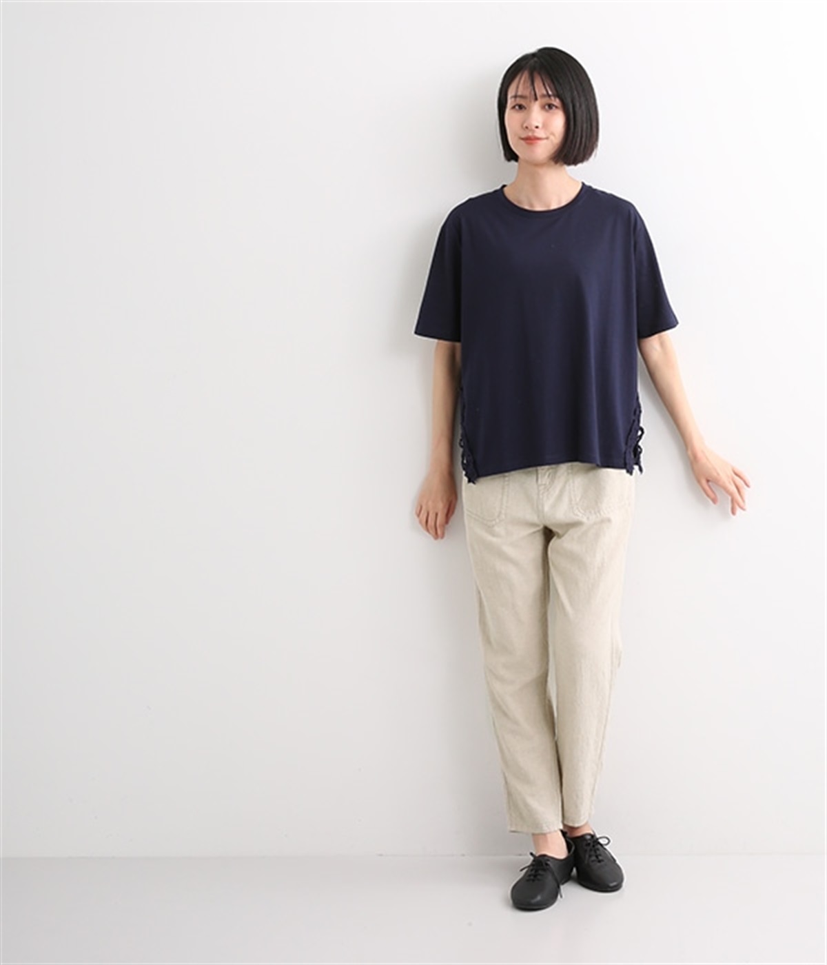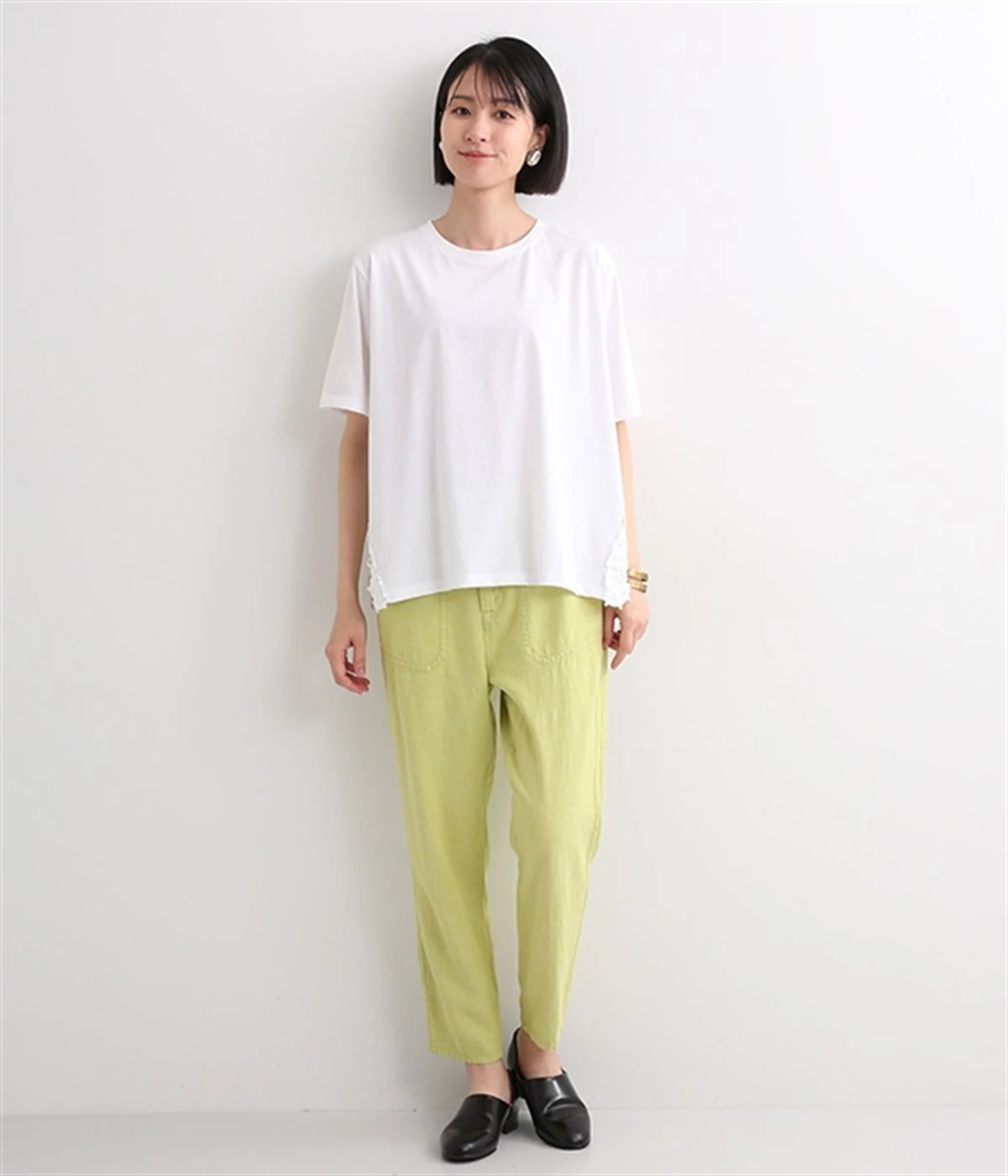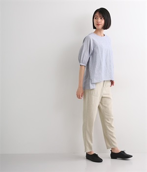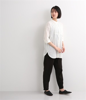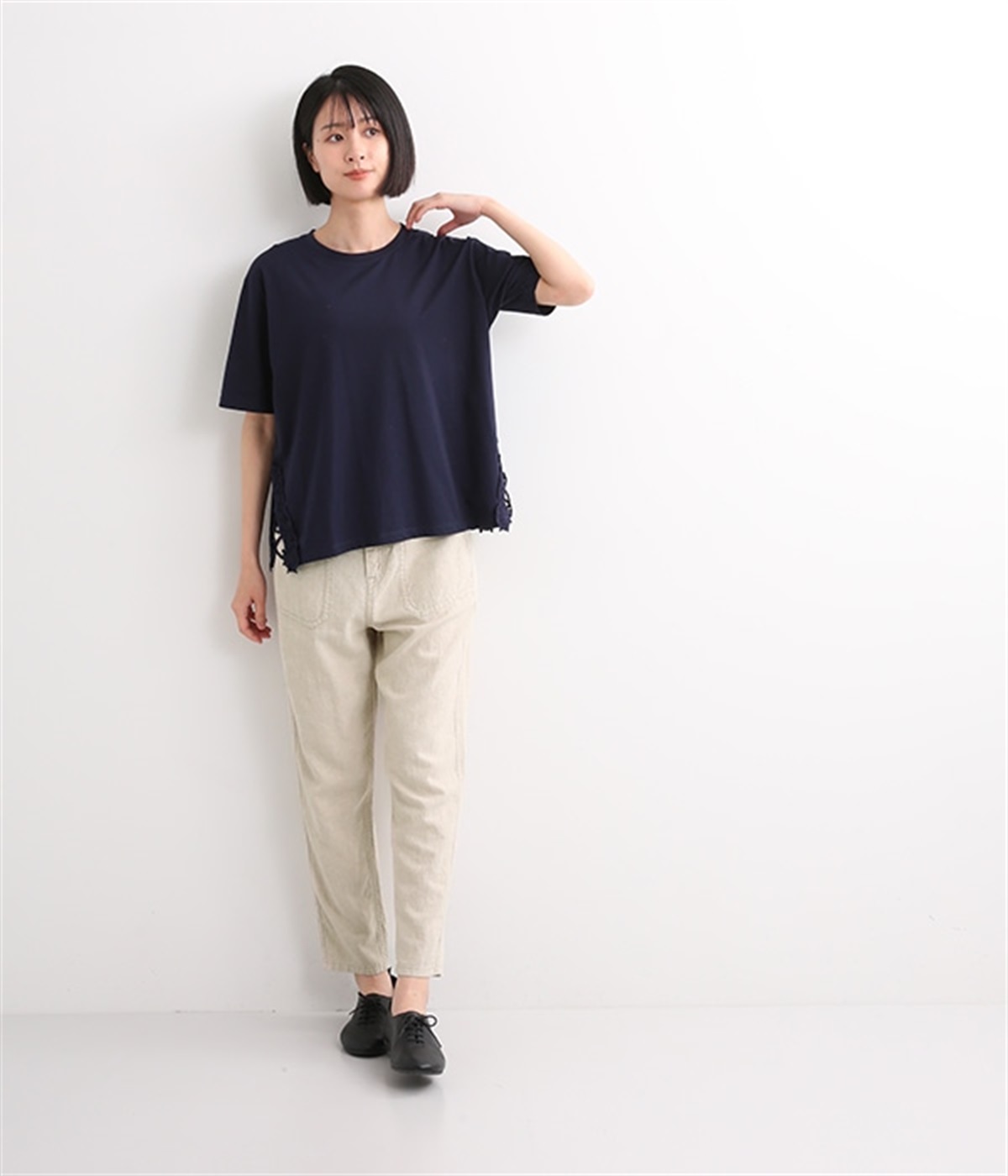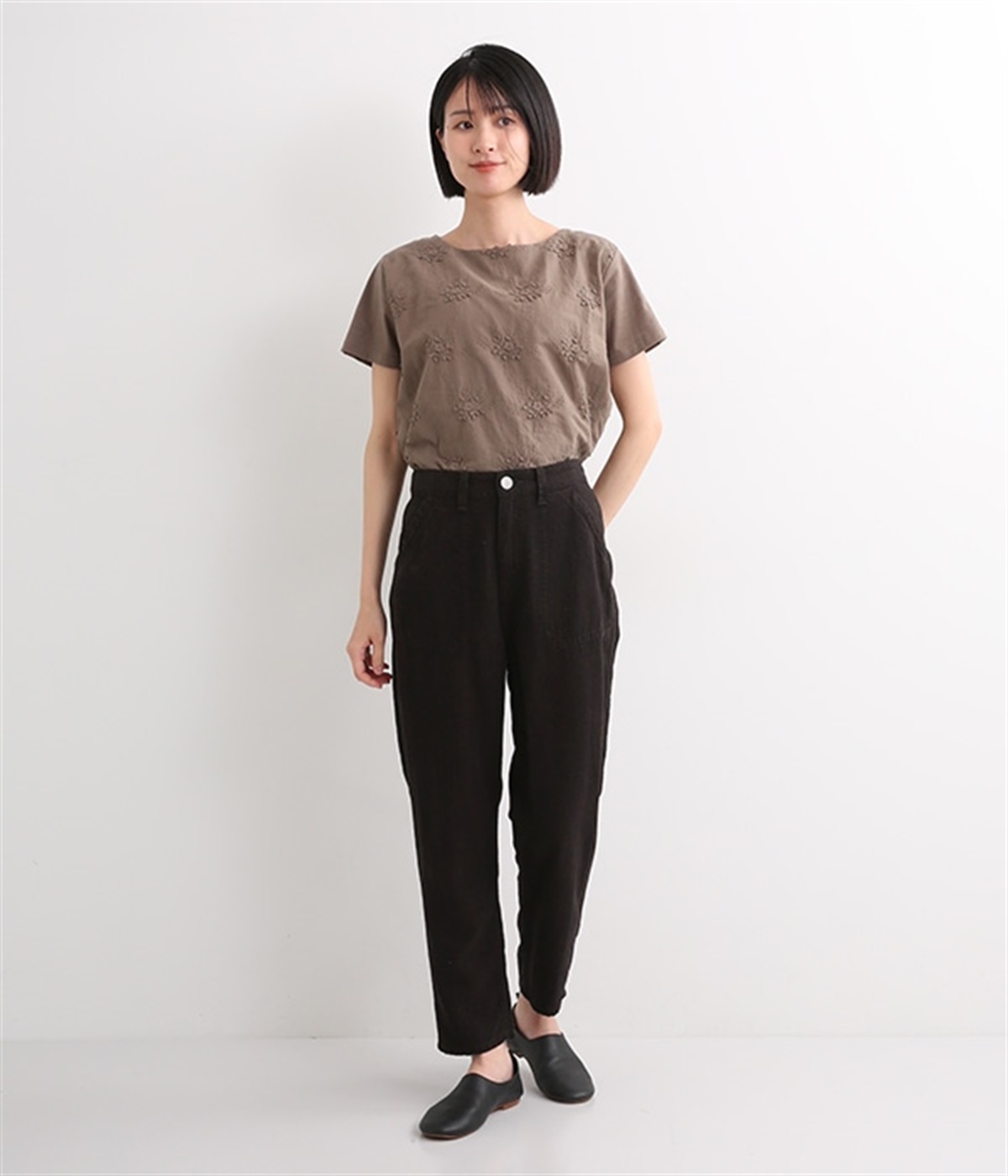ヒップの丸みをなくし、すっきりシルエットに仕立てたテーパードパンツです。ベイカーパンツがデザインソースで、前の貼りポケットをステッチワークで表現しています。後ろにゴムを入れたウエストは、窮屈感なく着用できます。太めのループをつけているので、ベルトでウエストマークした着こなしも◎。