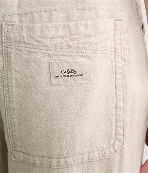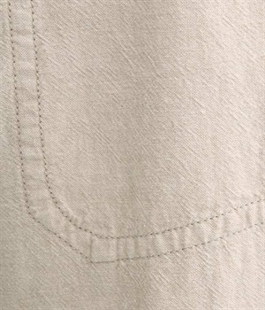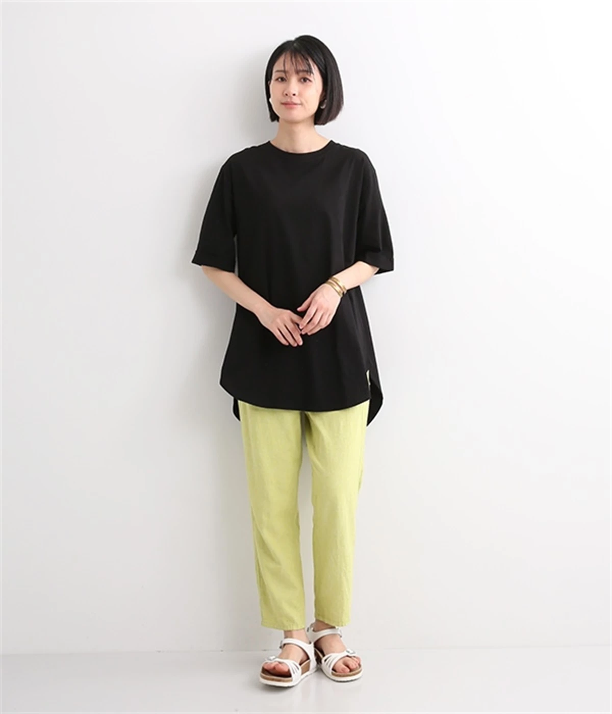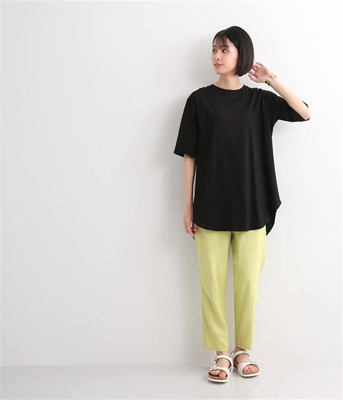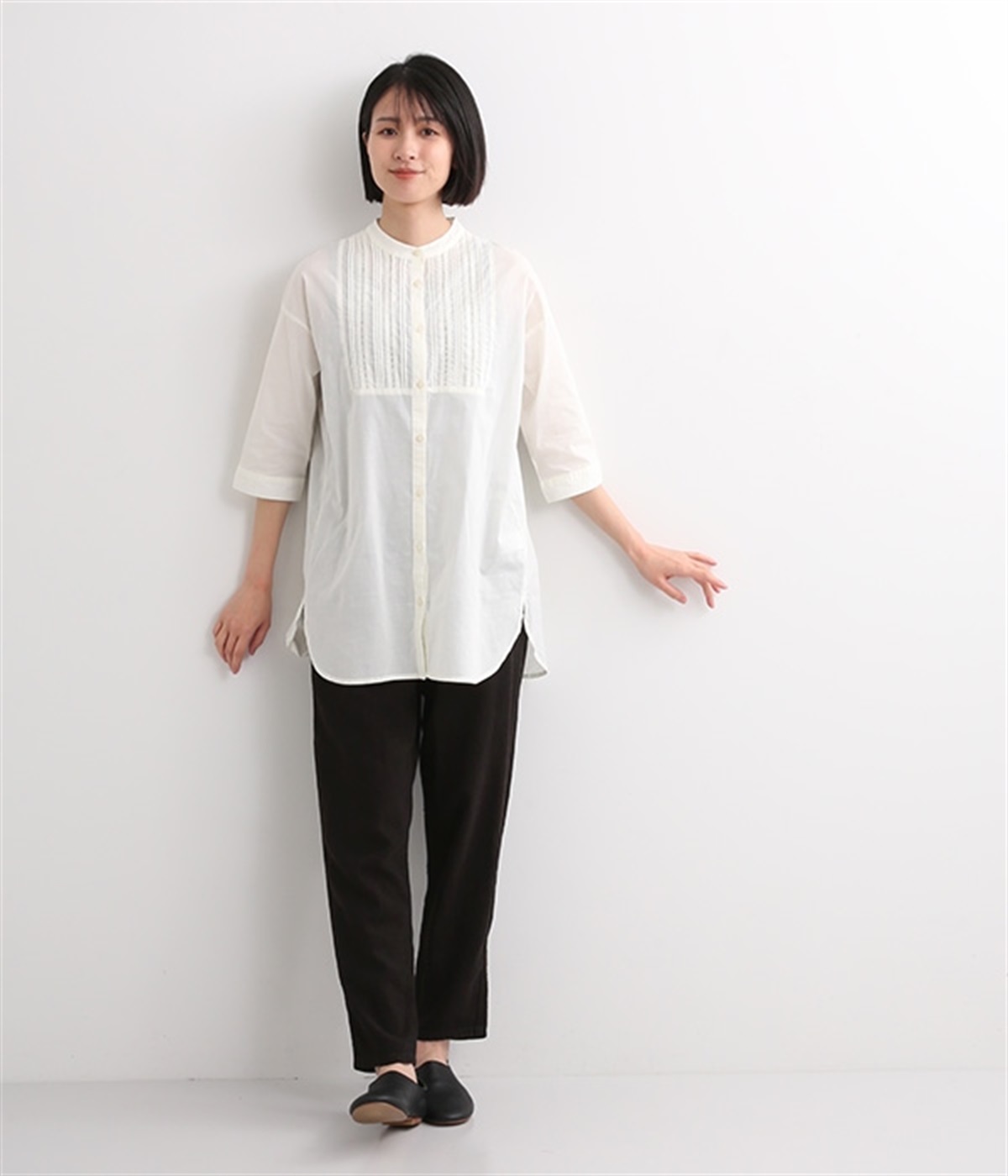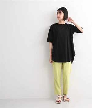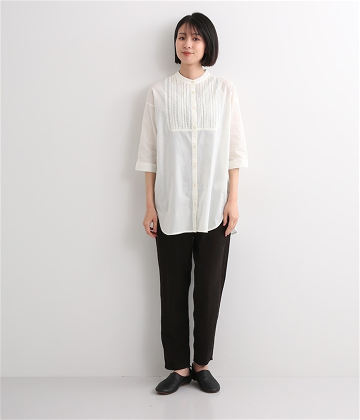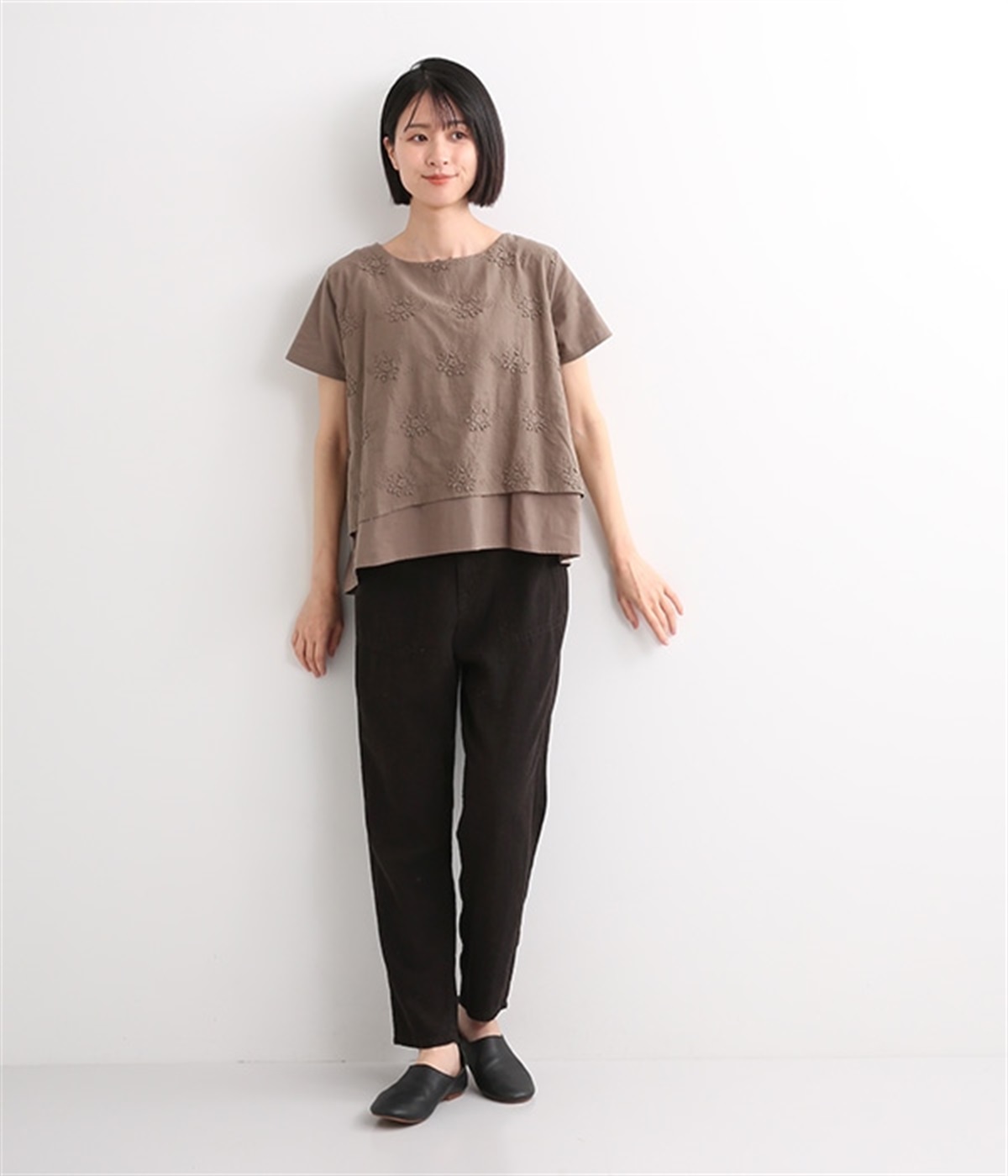 ヒップの丸みをなくし、すっきりシルエットに仕立てたテーパードパンツです。ベイカーパンツがデザインソースで、前の貼りポケットをステッチワークで表現しています。後ろにゴムを入れたウエストは、窮屈感なく着用できます。太めのループをつけているので、ベルトでウエストマークした着こなしも◎。
