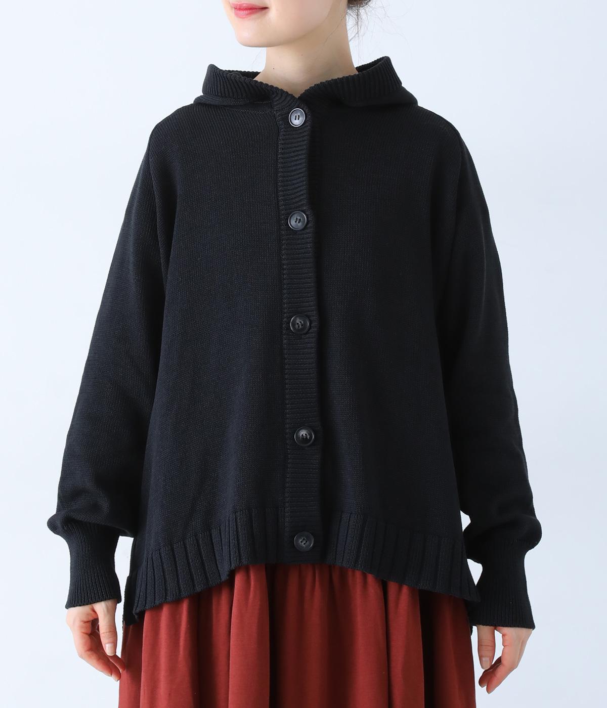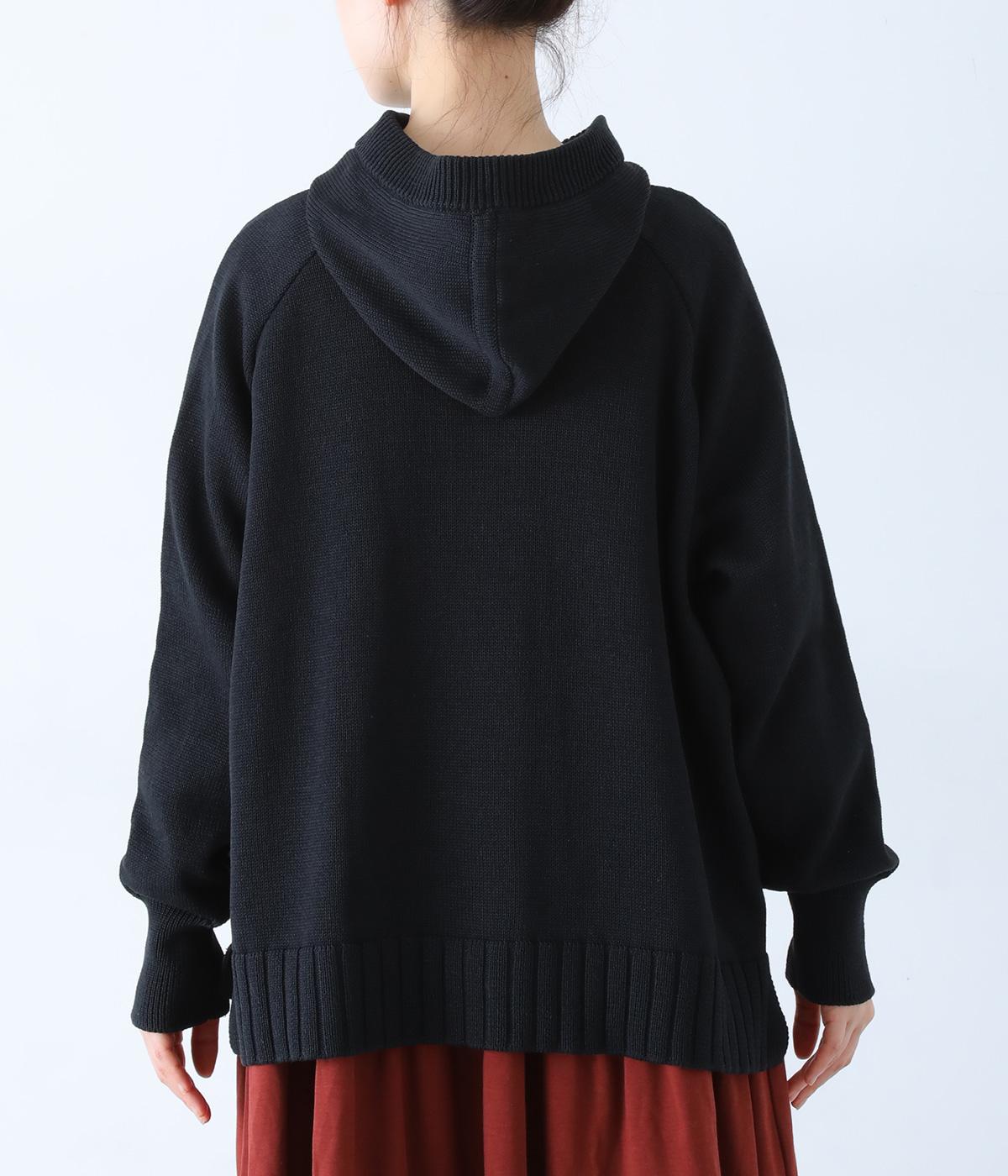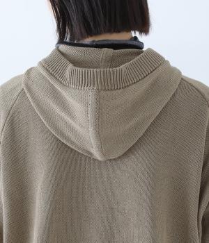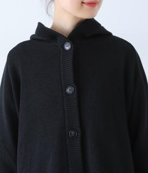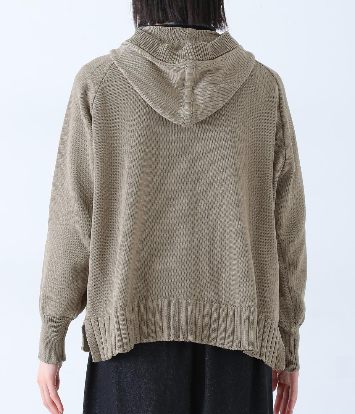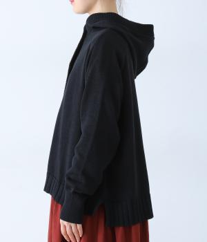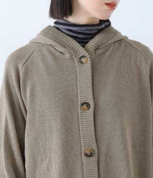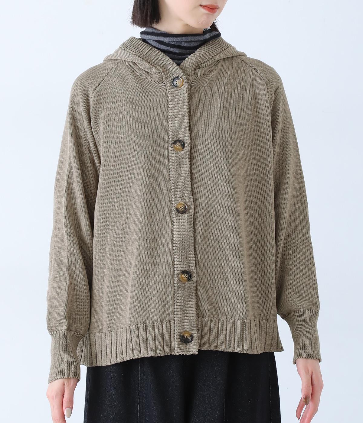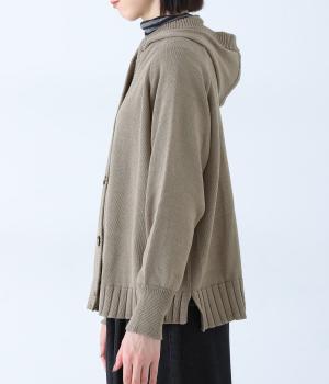 前立てや裾のリブ使いと、フードデザインが特徴のカーディガン。着丈に前後差をつけることでカジュアルさをおさえた大人らしい一着に仕上げました。ラフな印象になりすぎない適度にゆとりを持たせた身幅が◎。ラグランスリーブは肩ラインを女性らしく滑らかに見せてくれます。