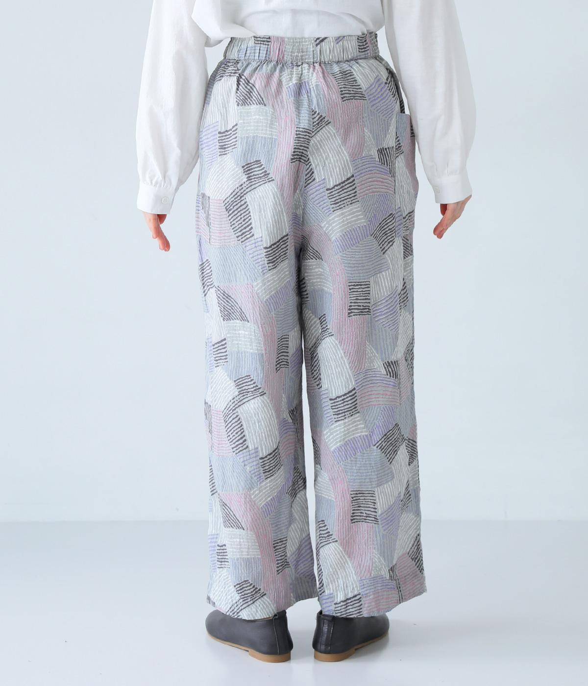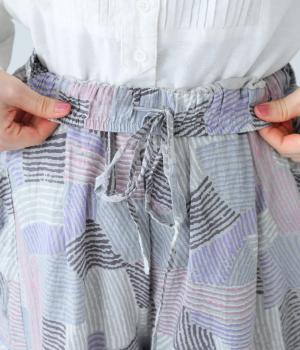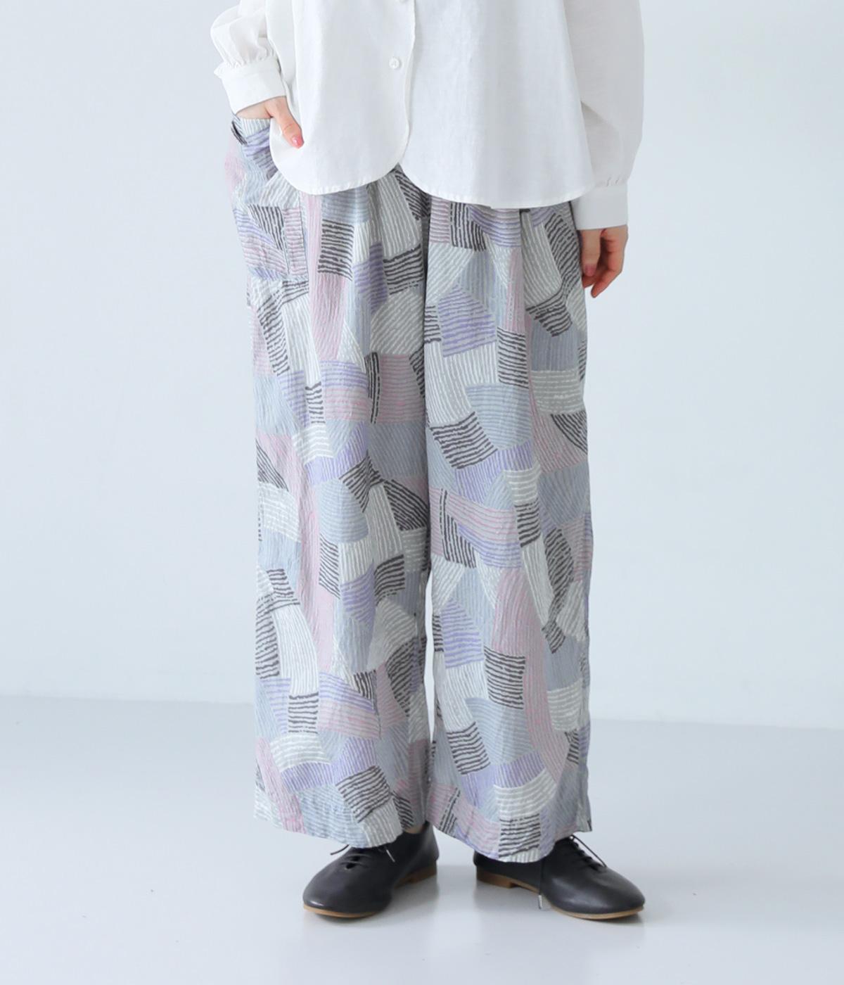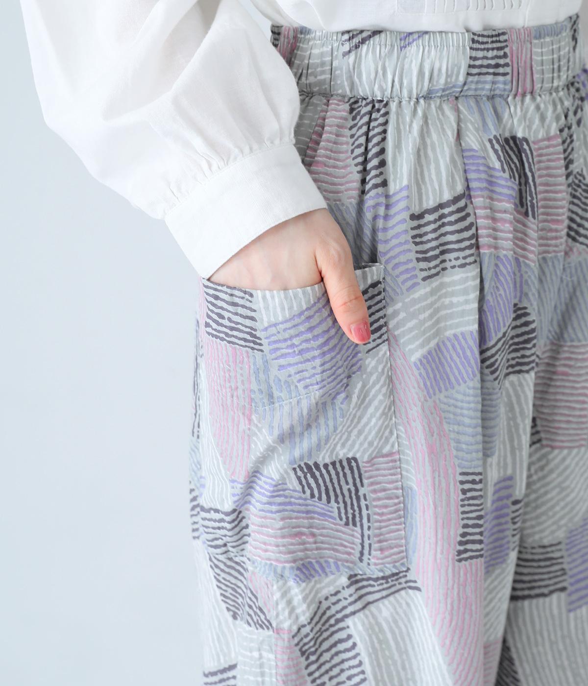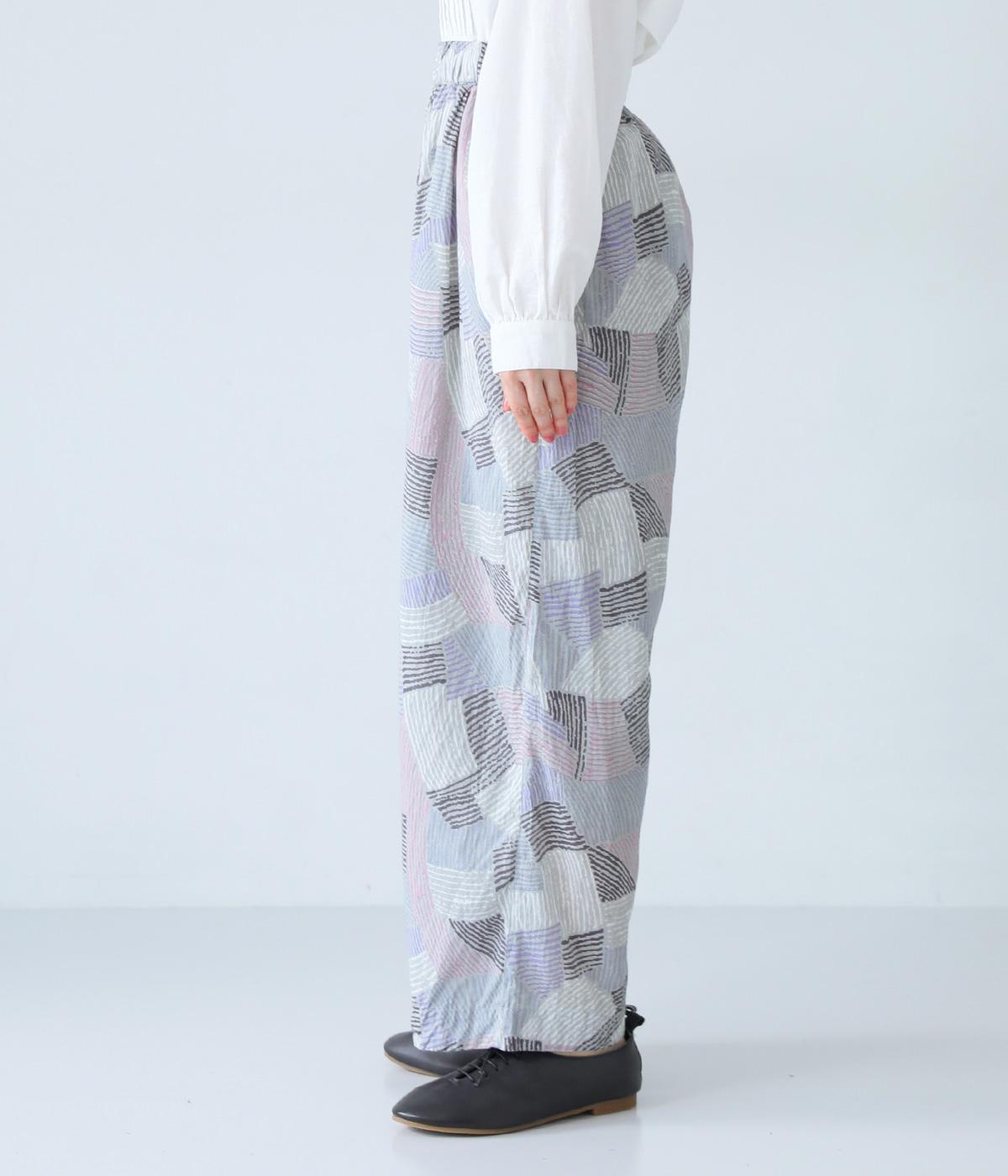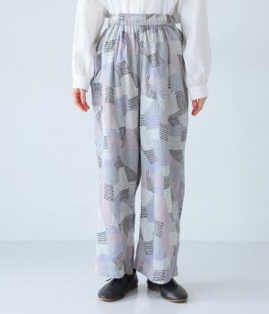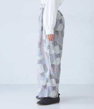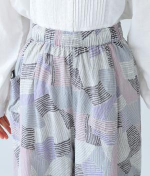 ナチュラルなスタイルにマッチする、ニュアンスカラーの幾何学柄がポイント。腰まわりから裾までゆとりを持たせたリラクシーなシルエットに仕上げています。右サイドには立体感のあるポケットを配してアクセントに。ウエストは総ゴム仕様、内紐つきです。