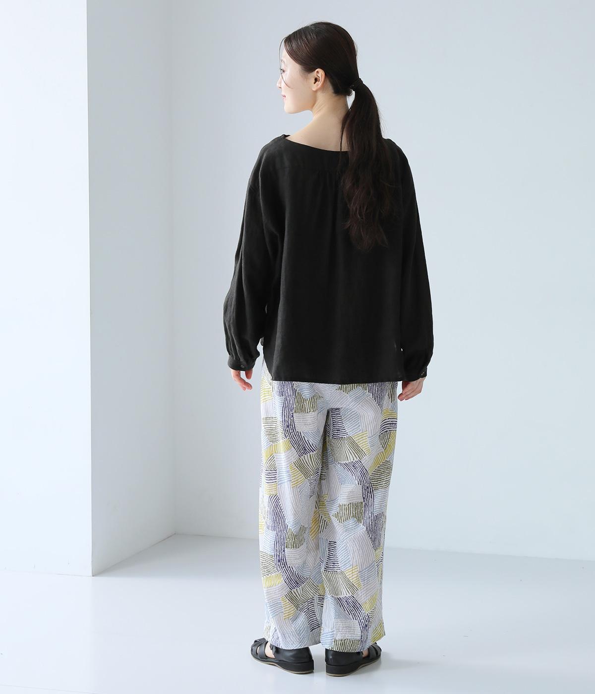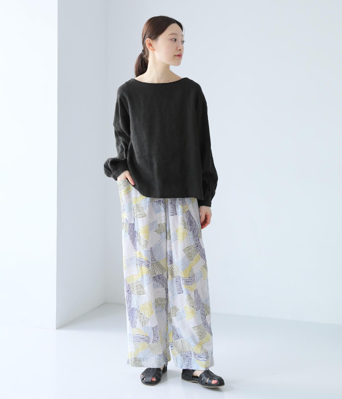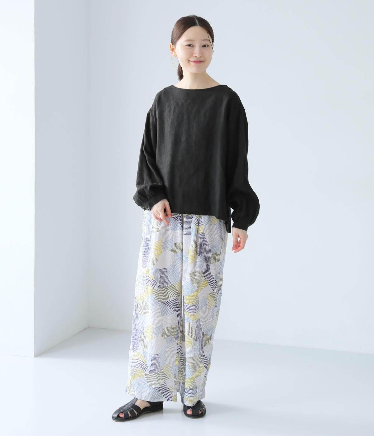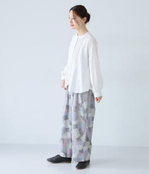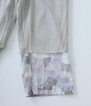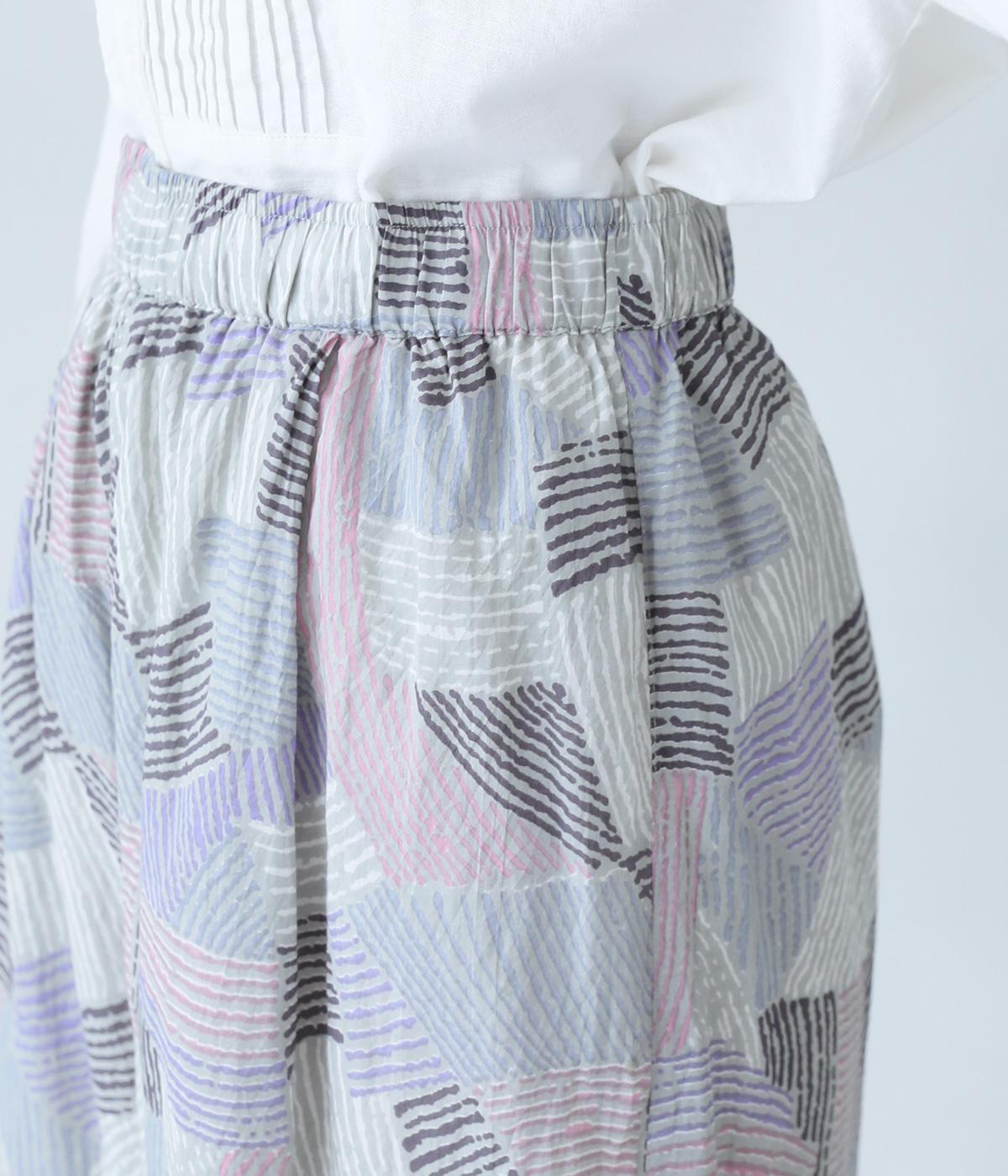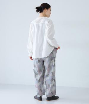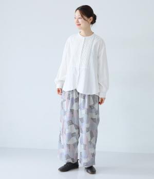 ナチュラルなスタイルにマッチする、ニュアンスカラーの幾何学柄がポイント。腰まわりから裾までゆとりを持たせたリラクシーなシルエットに仕上げています。右サイドには立体感のあるポケットを配してアクセントに。ウエストは総ゴム仕様、内紐つきです。