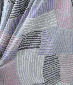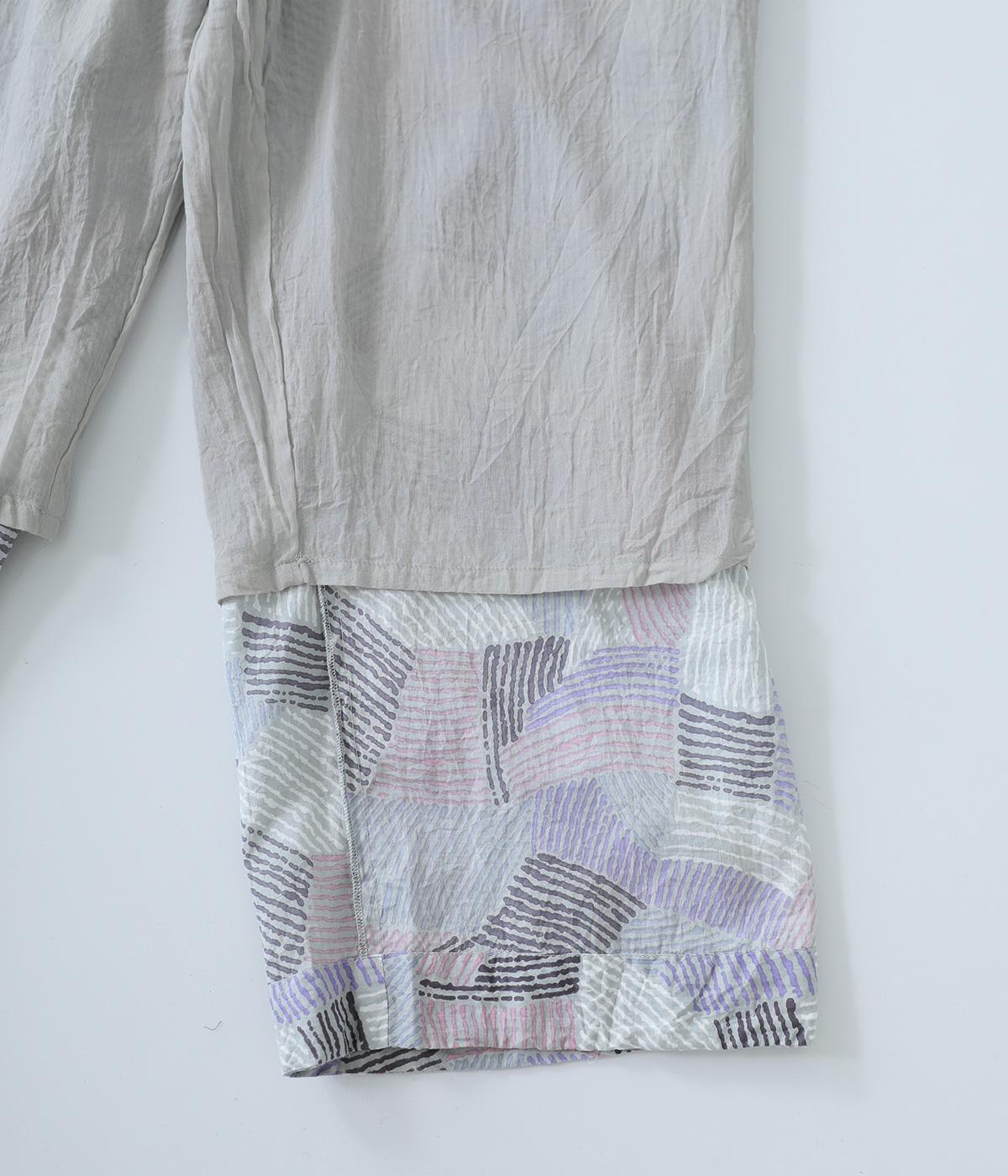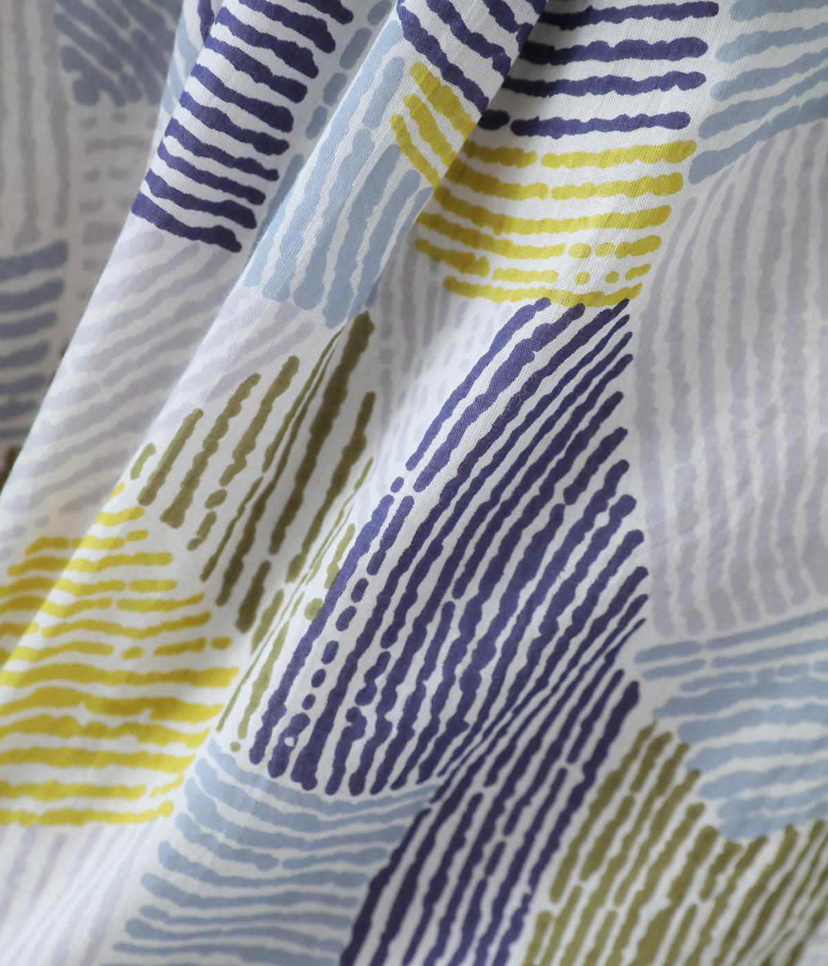 コットンのナチュラルな風合いが特徴のボイル生地を使用しています。薄手で風通しが良く、とても涼しい着用感が魅力。ラフに手書きしたような幾何学柄を全体にあしらっています。
