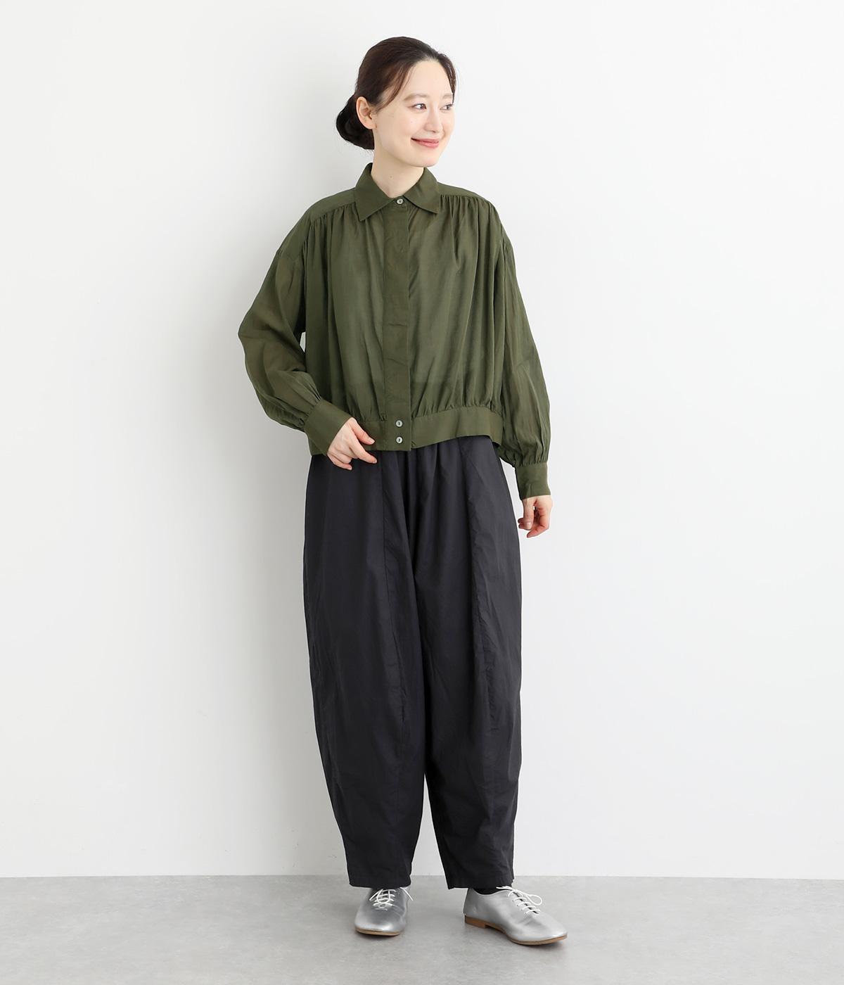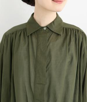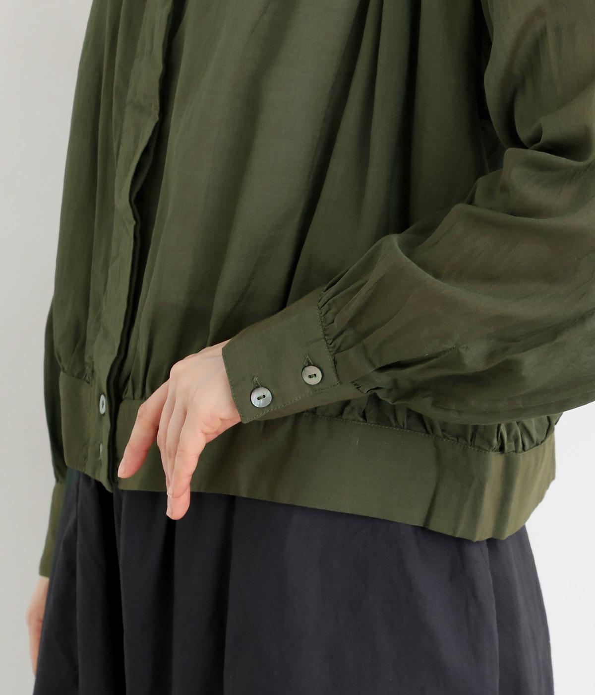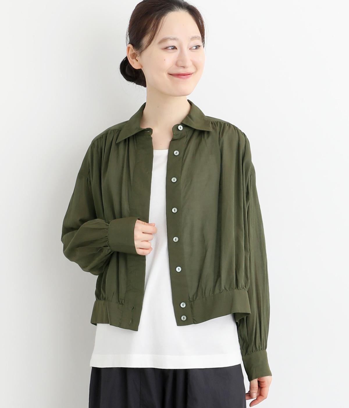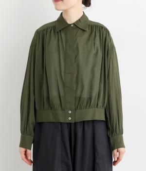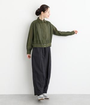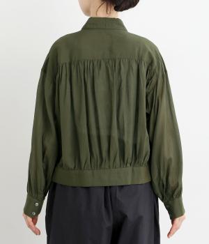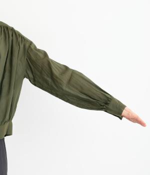 前立てのボタンは比翼仕立てですっきりシンプルに仕上げました。たっぷりのギャザーが女性らしい品を演出します。短めの丈がぬけ感を添え、どんなボトムスにもなじみます。端境期のきちんとしたいときの羽織ものにぴったりです。