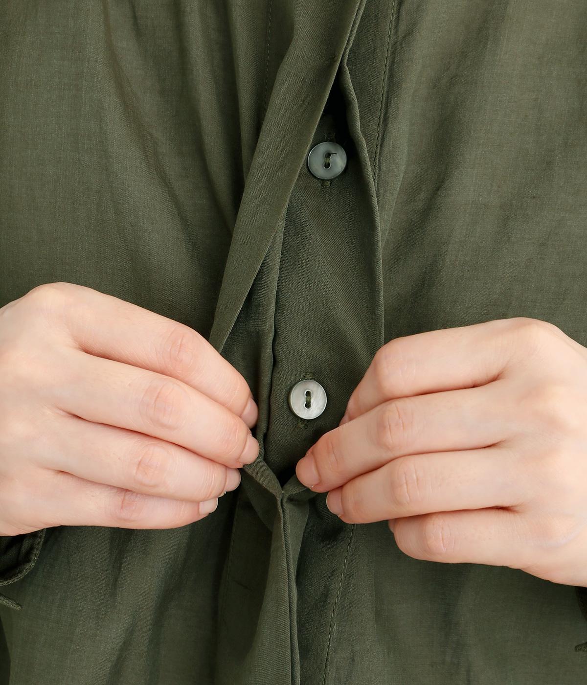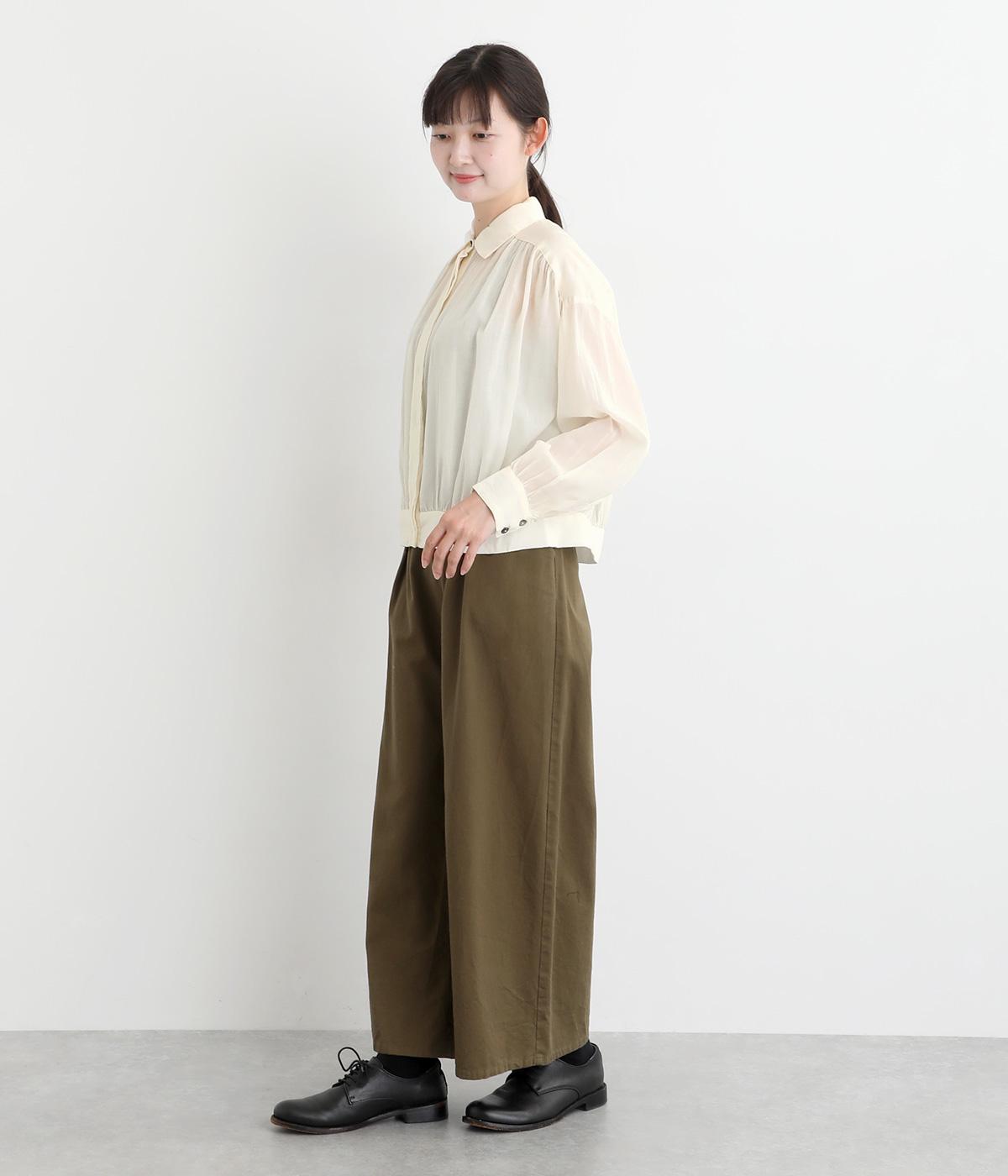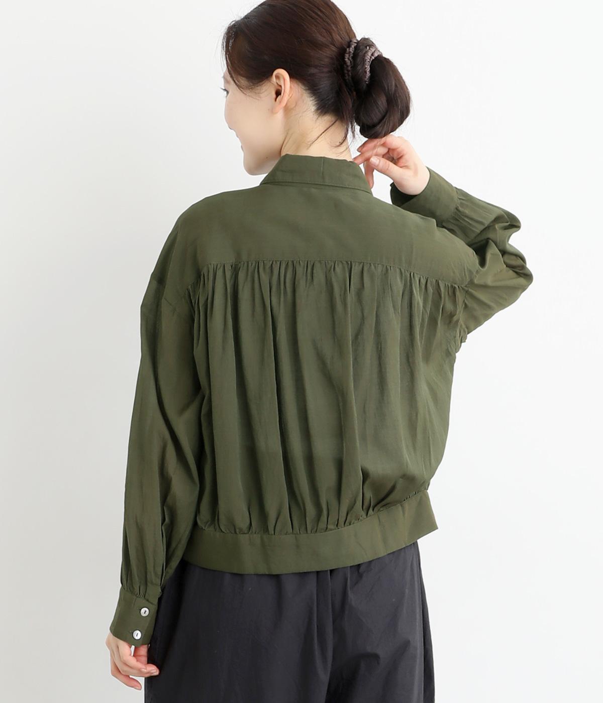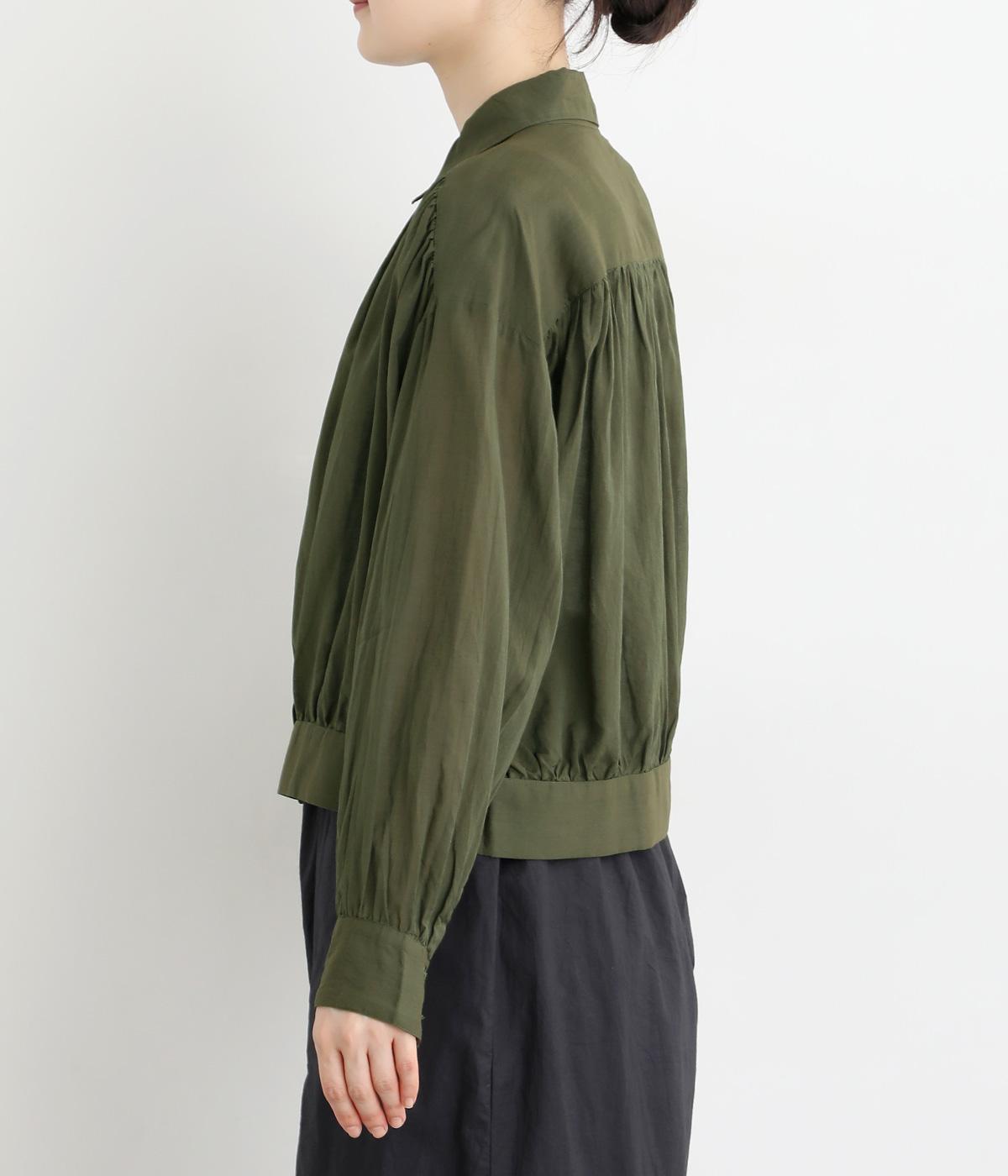 前立てのボタンは比翼仕立てですっきりシンプルに仕上げました。たっぷりのギャザーが女性らしい品を演出します。短めの丈がぬけ感を添え、どんなボトムスにもなじみます。端境期のきちんとしたいときの羽織ものにぴったりです。