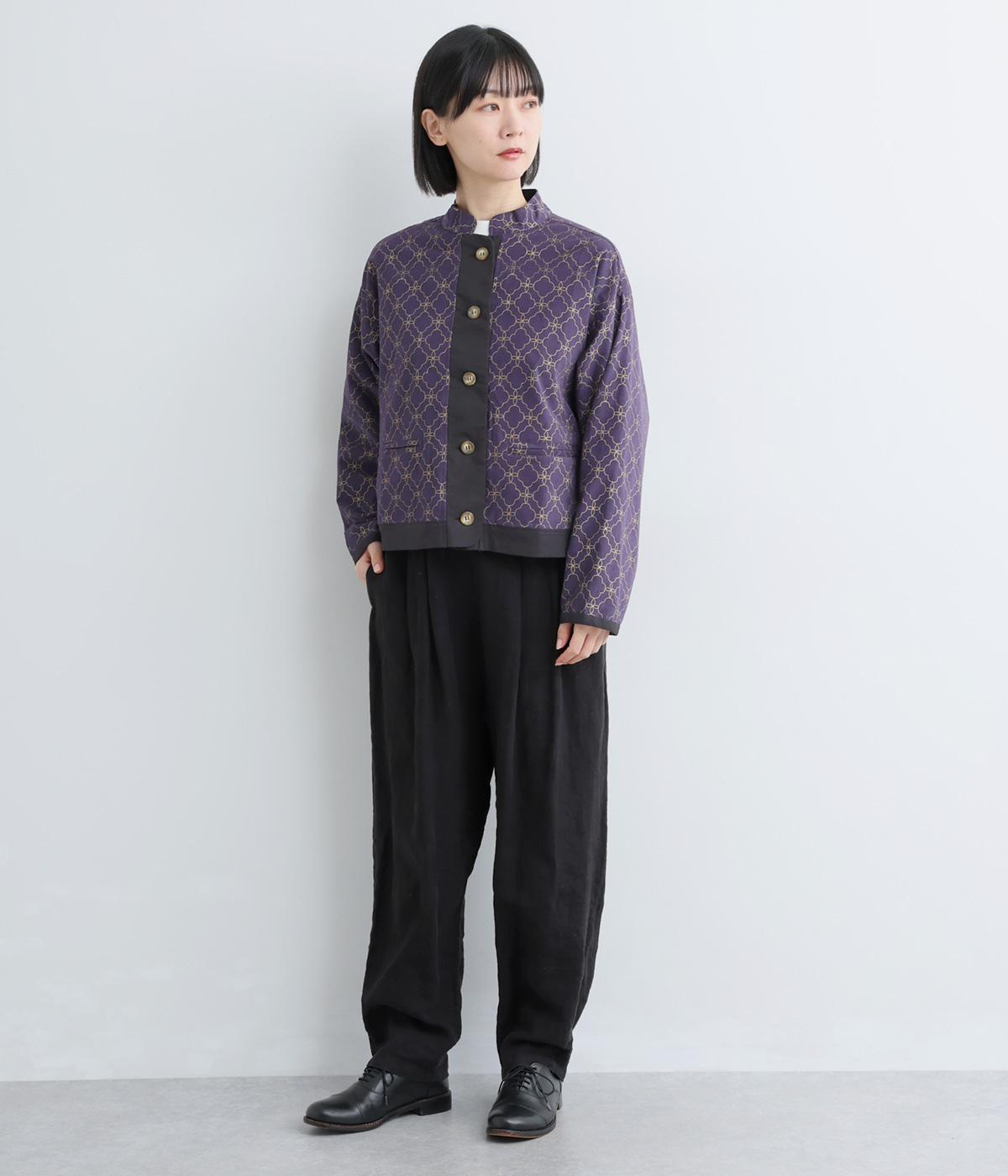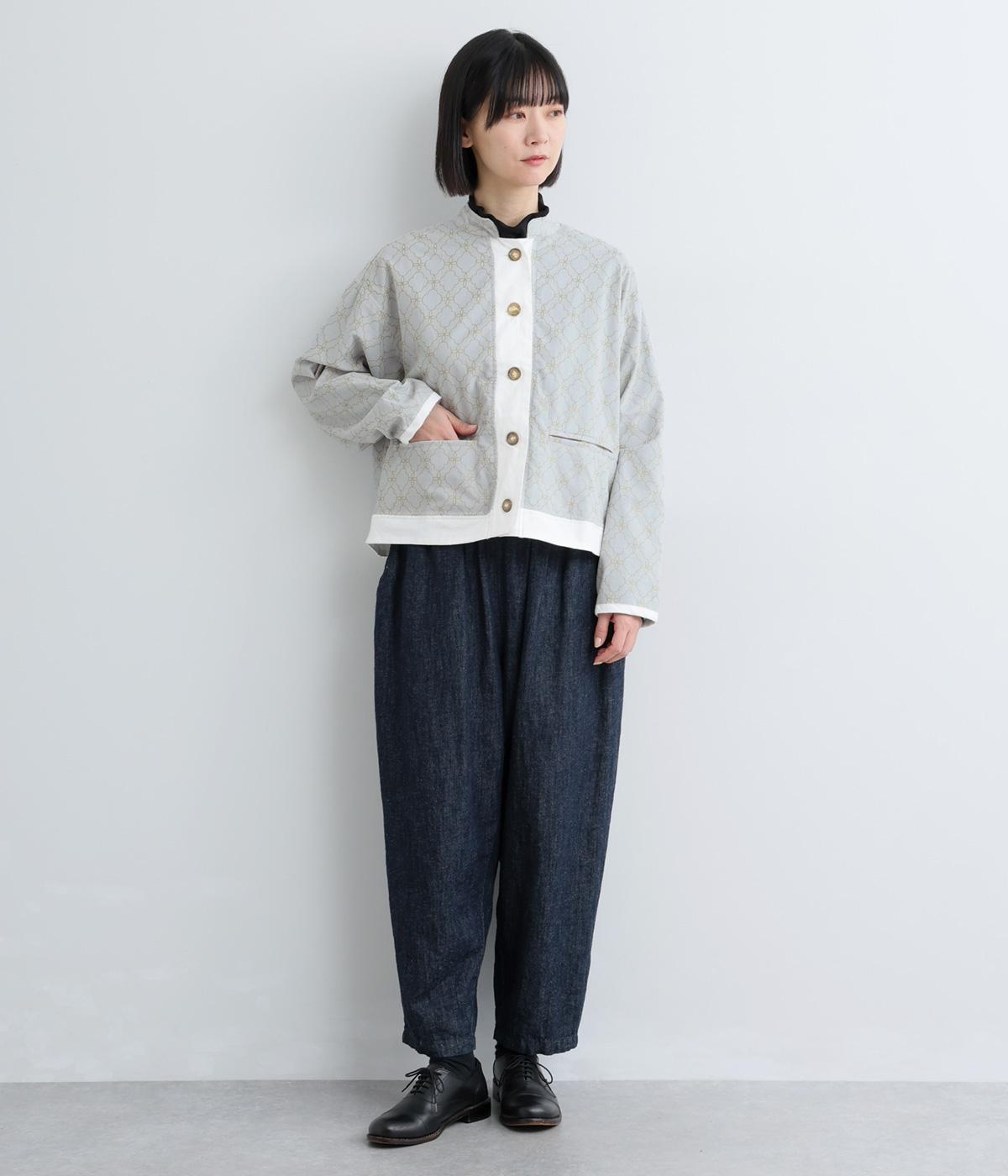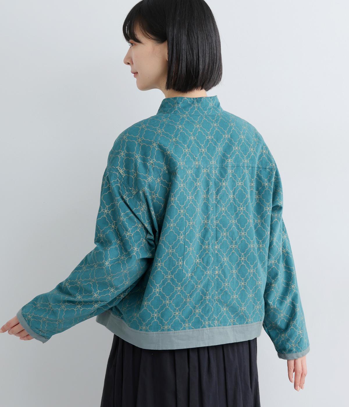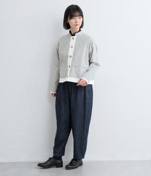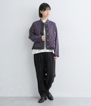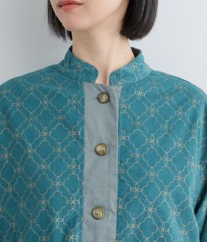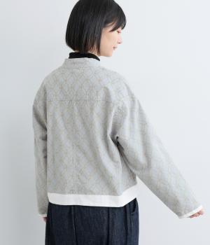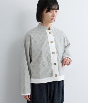 エキゾチックなムードのモロッカンプリントが目を引くシャツジャケット。前立てや裾は無地にして柄を引き立てつつ、バランスよく仕上げました。285gと軽量ながらきちんと感も備え、トップスにもライトアウターにも使える一枚です。