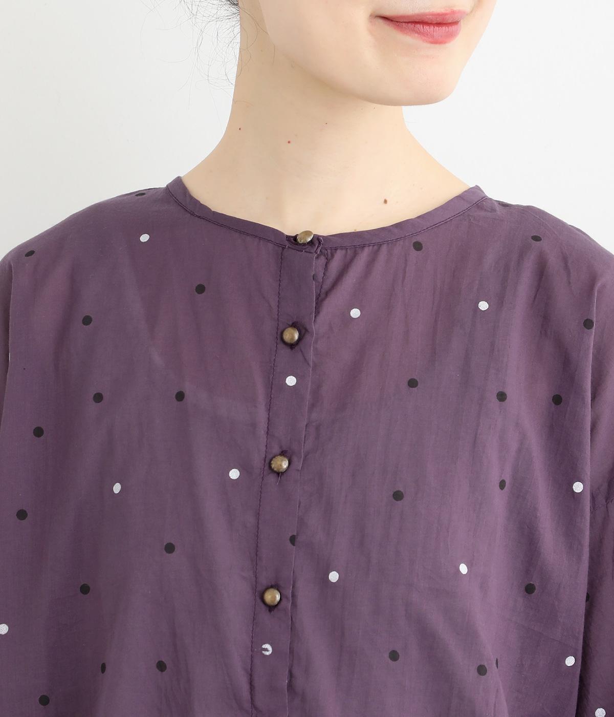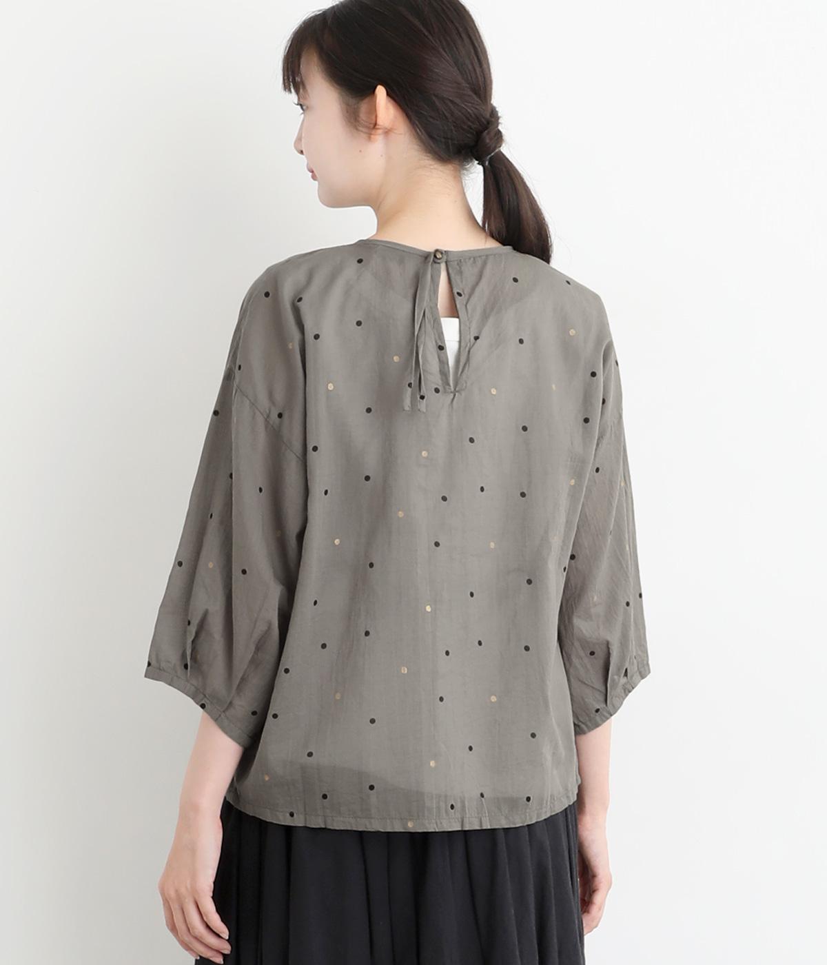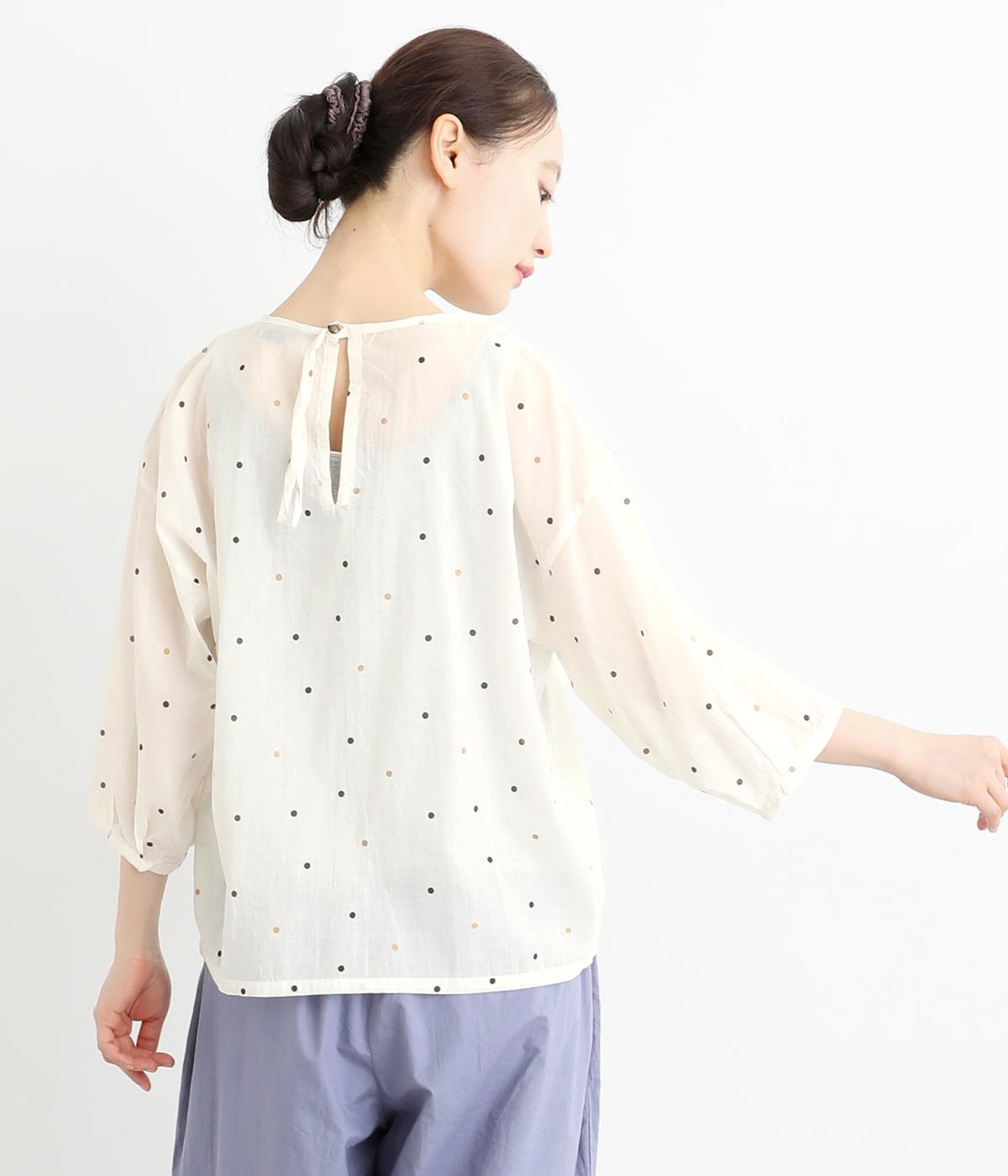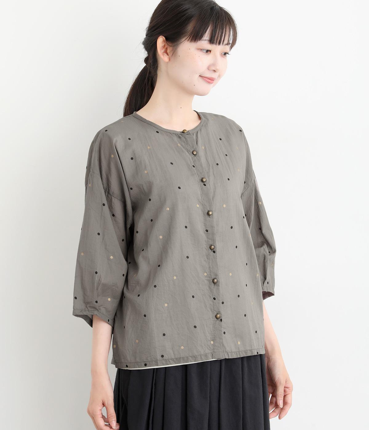 ドットのところどころに箔プリントをほどこし、華やかさのあるブラウスです。うしろネックは涙あきで脱ぎ着しやすく、添えられたボタンと紐がかわいらしいアクセントに。ノーカラーと七分袖ですっきりとした着心地を叶えます。