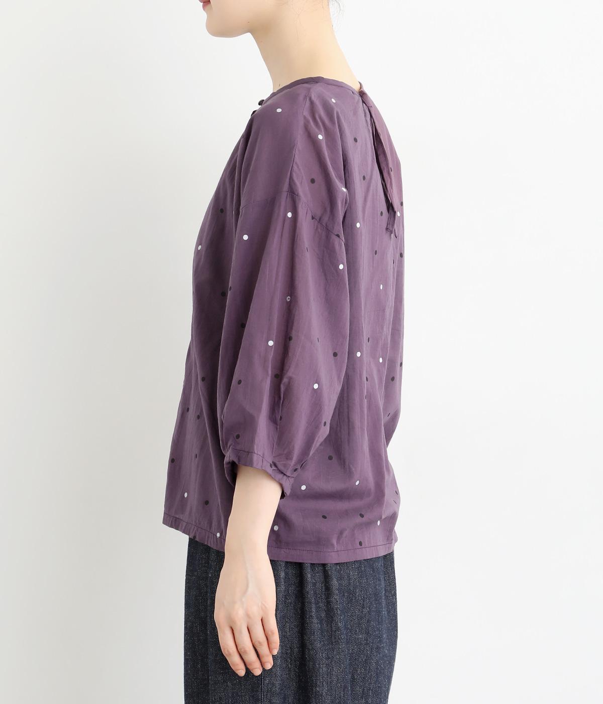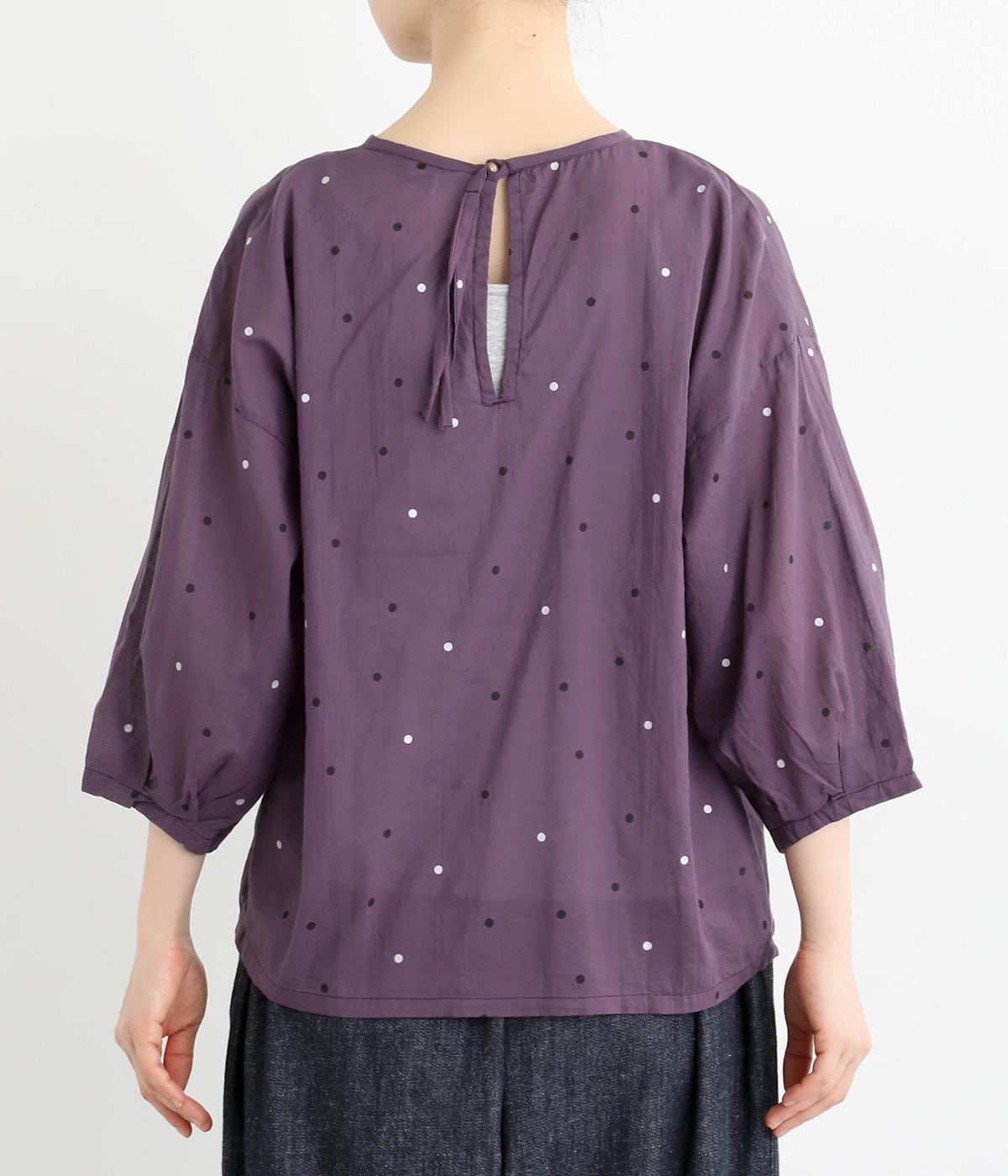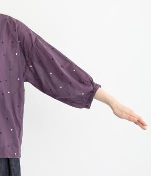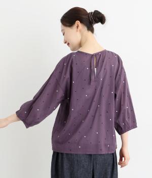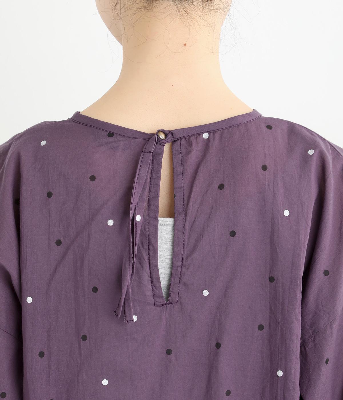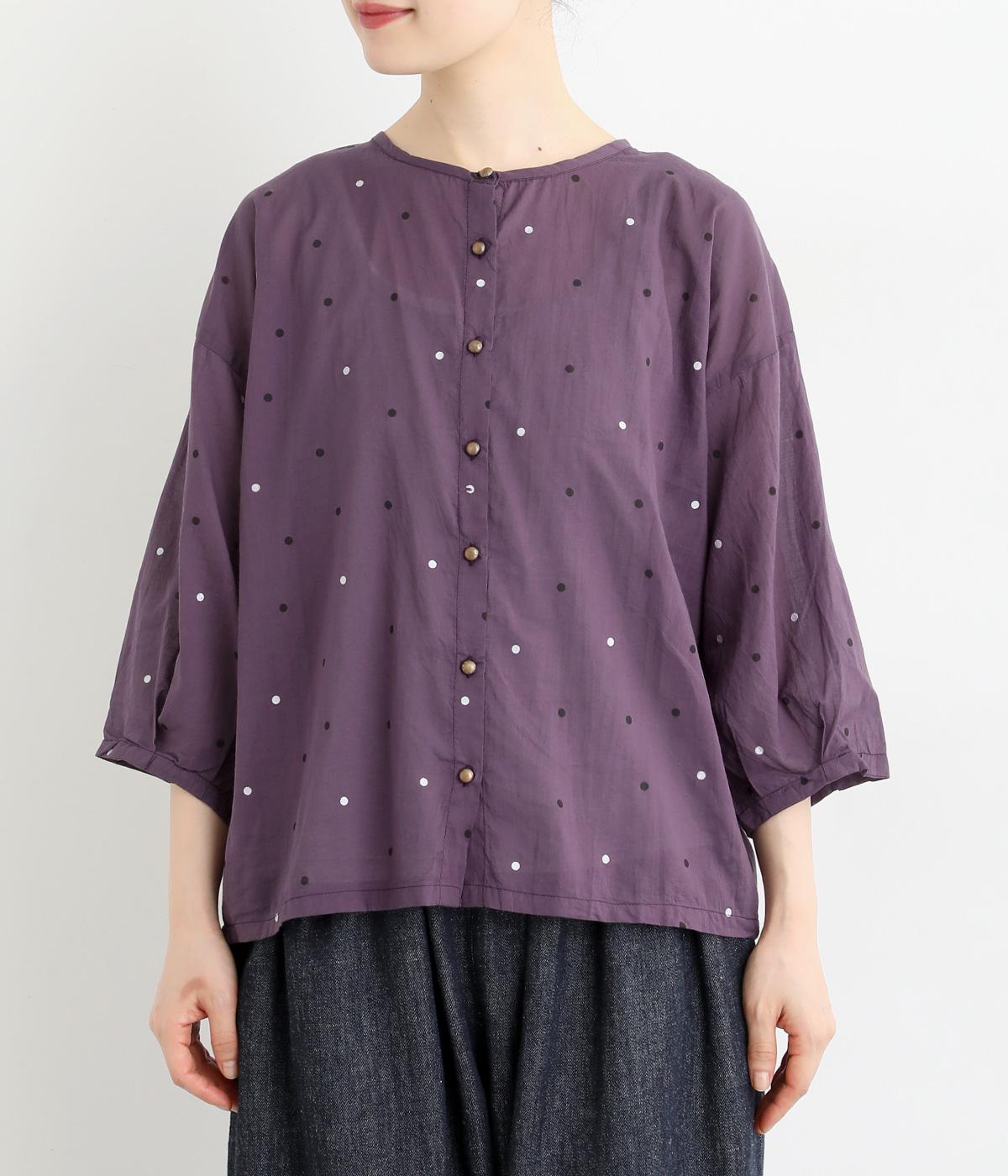 ドットのところどころに箔プリントをほどこし、華やかさのあるブラウスです。うしろネックは涙あきで脱ぎ着しやすく、添えられたボタンと紐がかわいらしいアクセントに。ノーカラーと七分袖ですっきりとした着心地を叶えます。