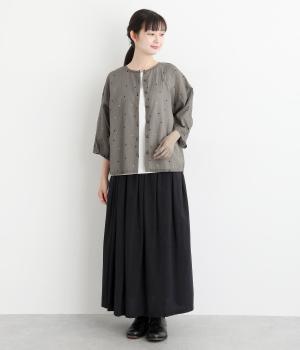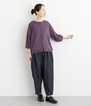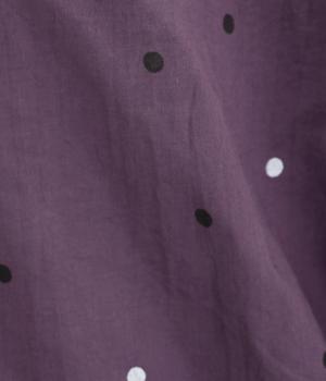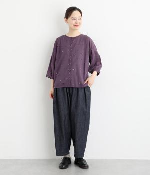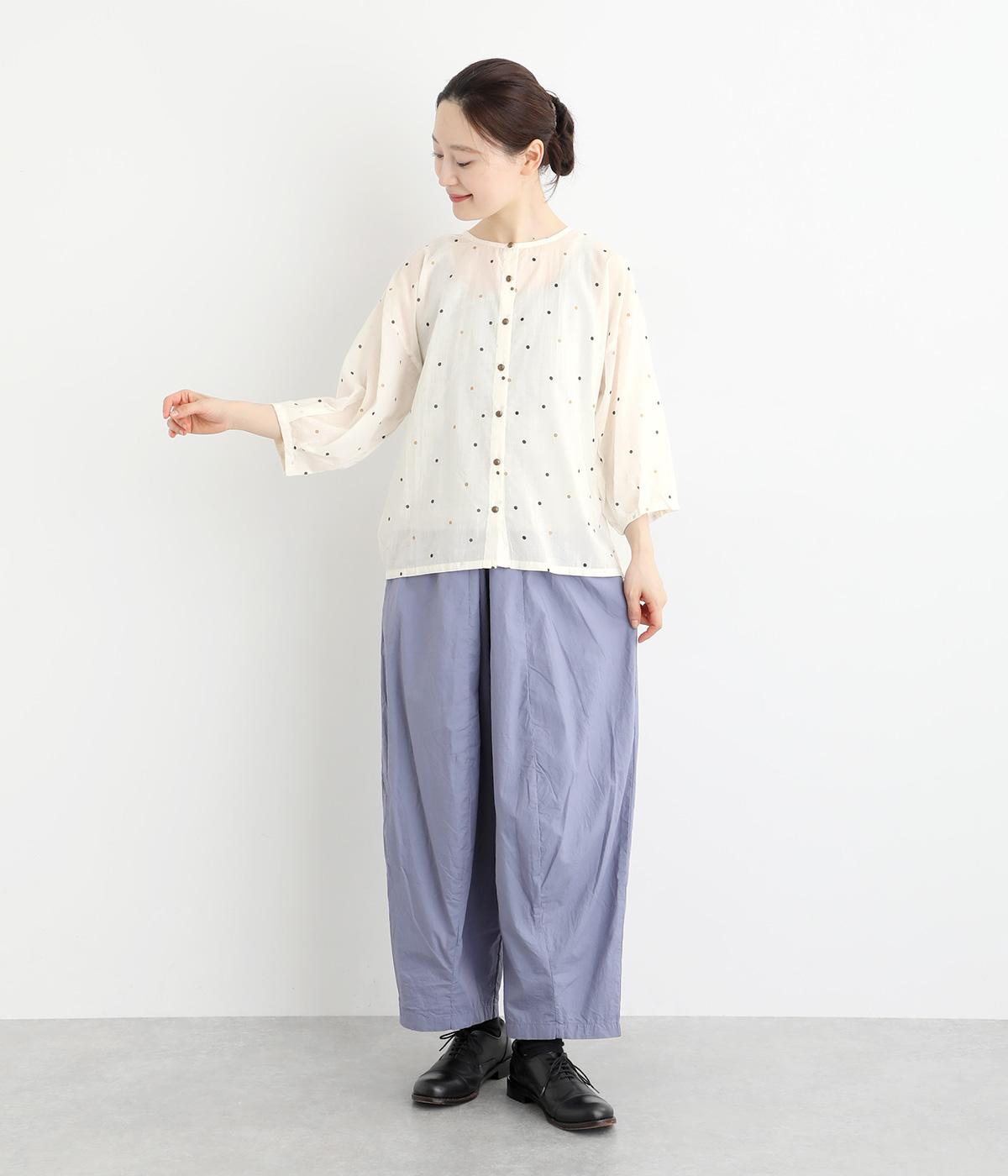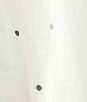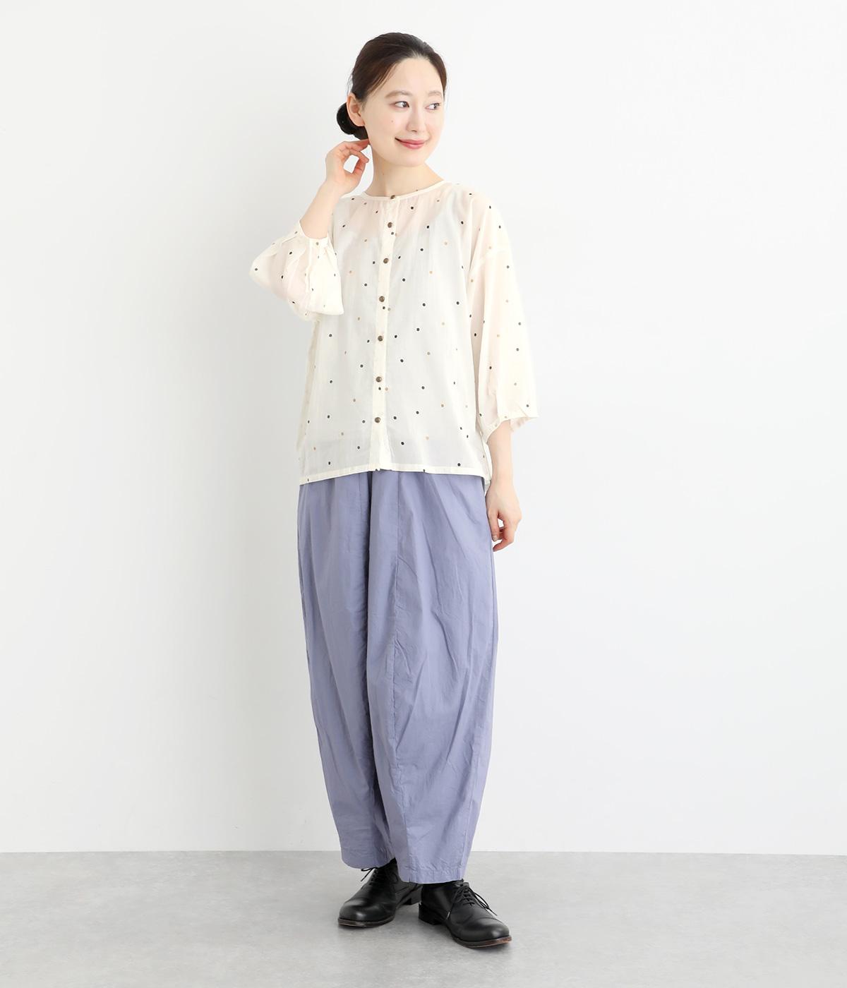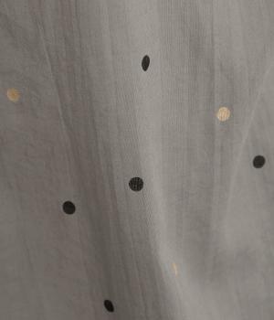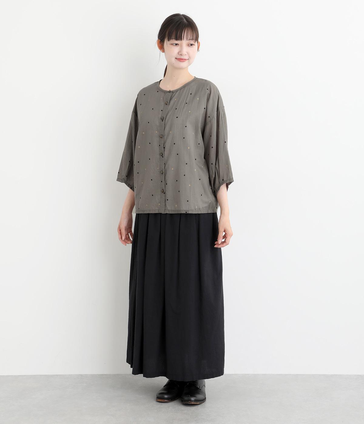 ドットのところどころに箔プリントをほどこし、華やかさのあるブラウスです。うしろネックは涙あきで脱ぎ着しやすく、添えられたボタンと紐がかわいらしいアクセントに。ノーカラーと七分袖ですっきりとした着心地を叶えます。