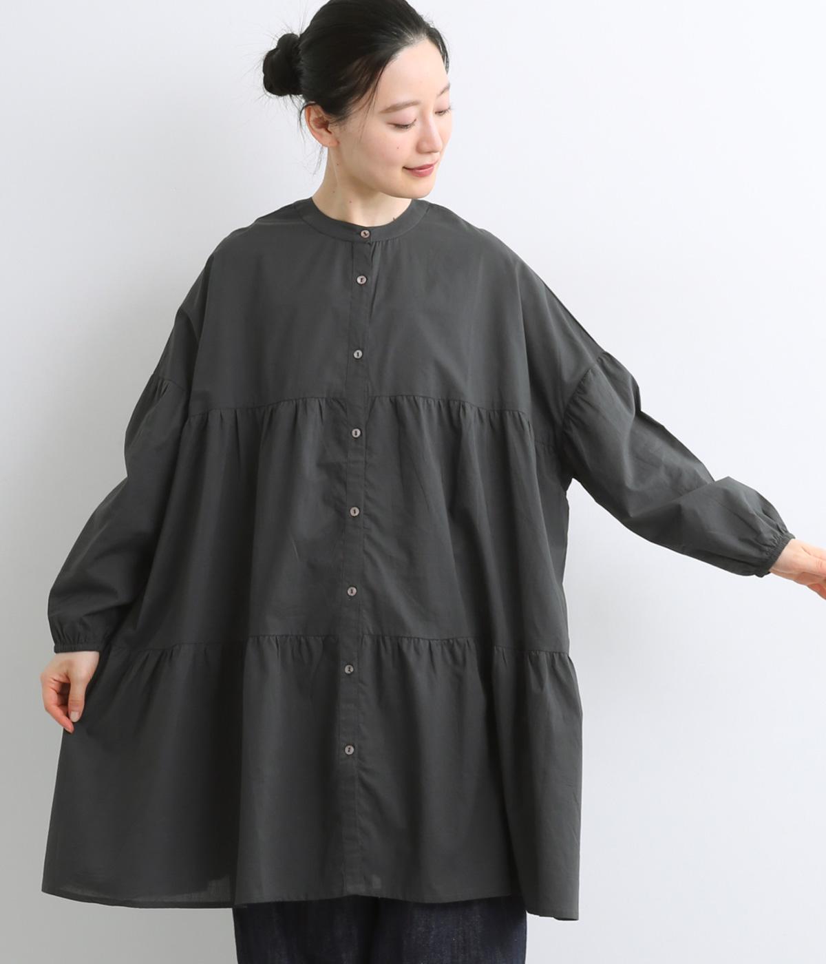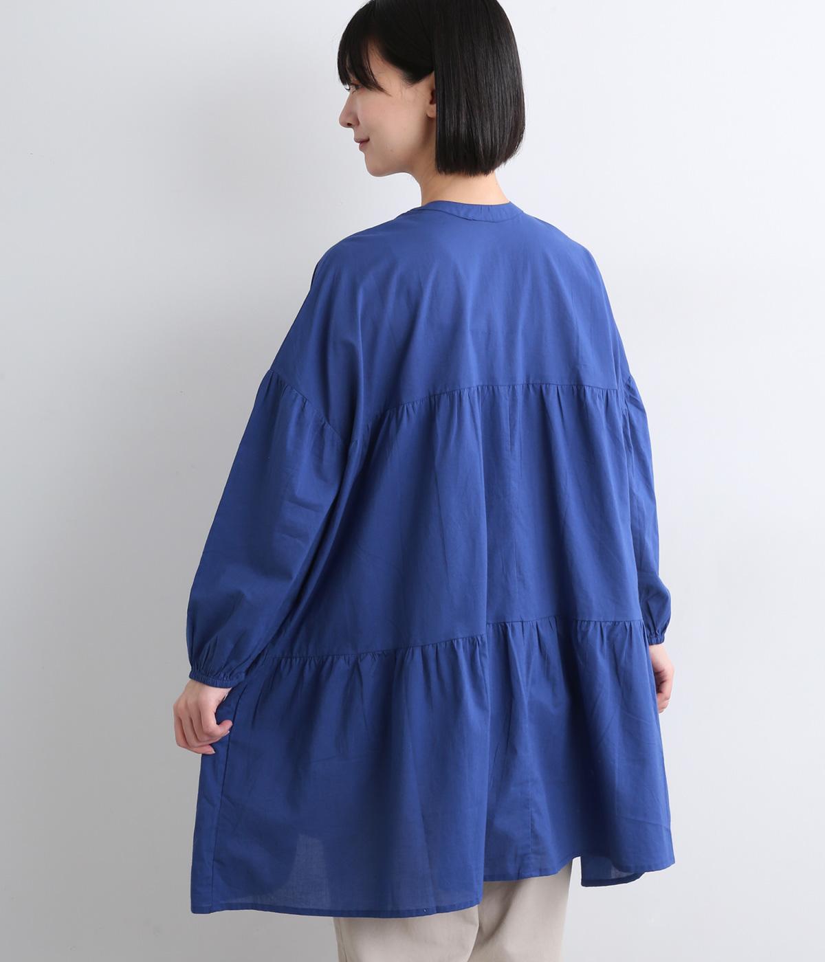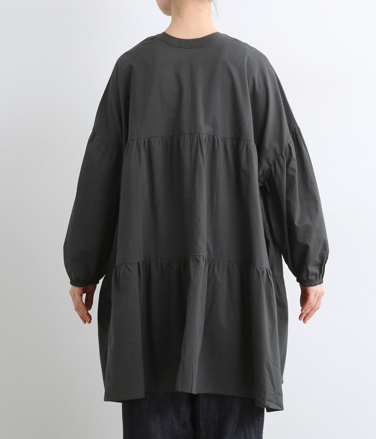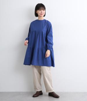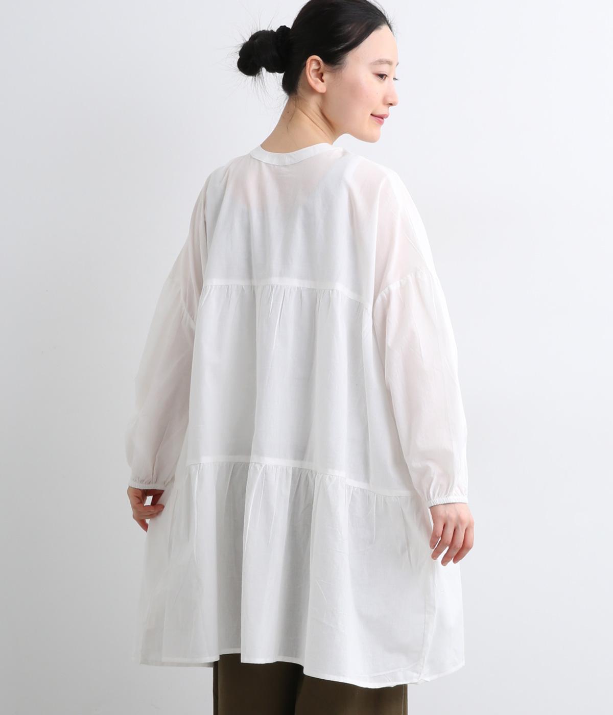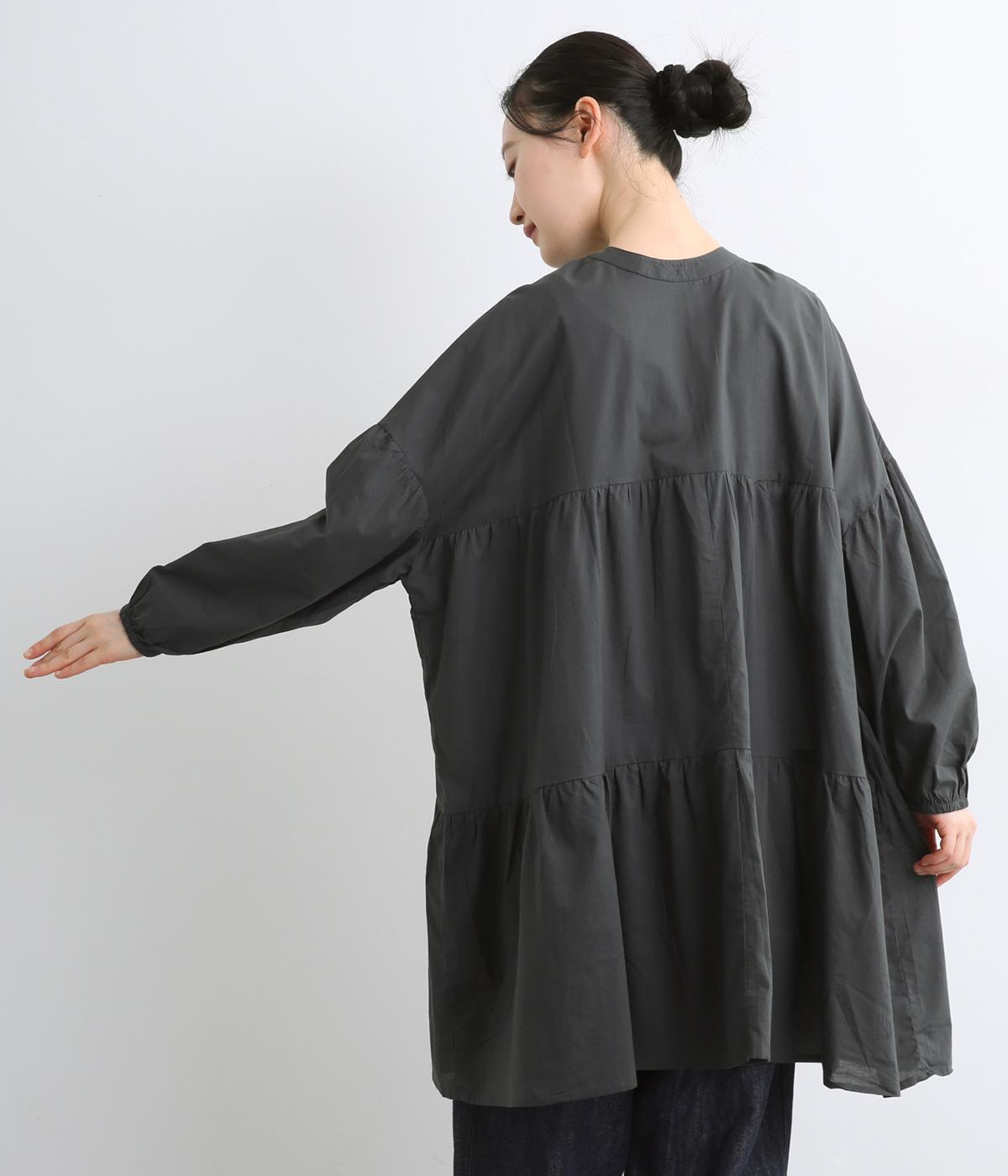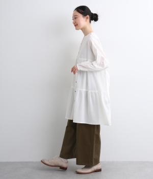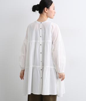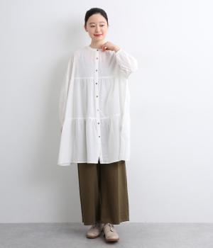華やかな印象のティアードブラウスを2wayで仕立てました。ふんわりとしたシルエットとロング丈で体型をカバー叶えます。首元はノーカラーで顔まわりをすっきり見せます。袖口はゴム仕様で、たくしあげてニュアンスの変化も楽しめます。