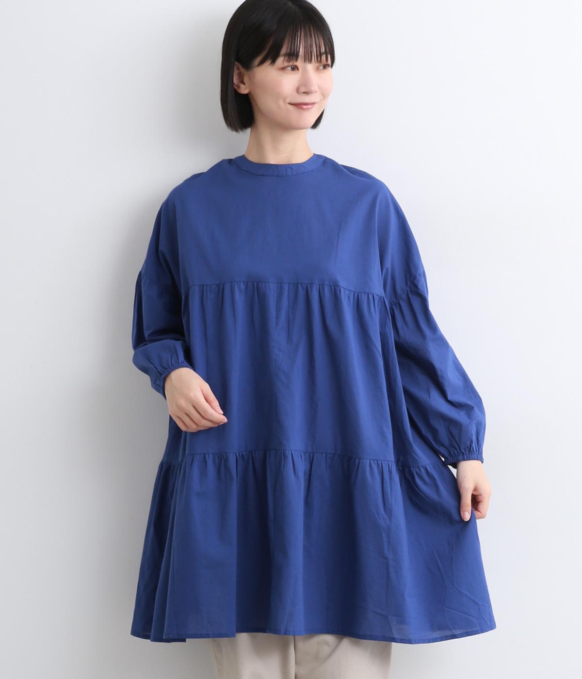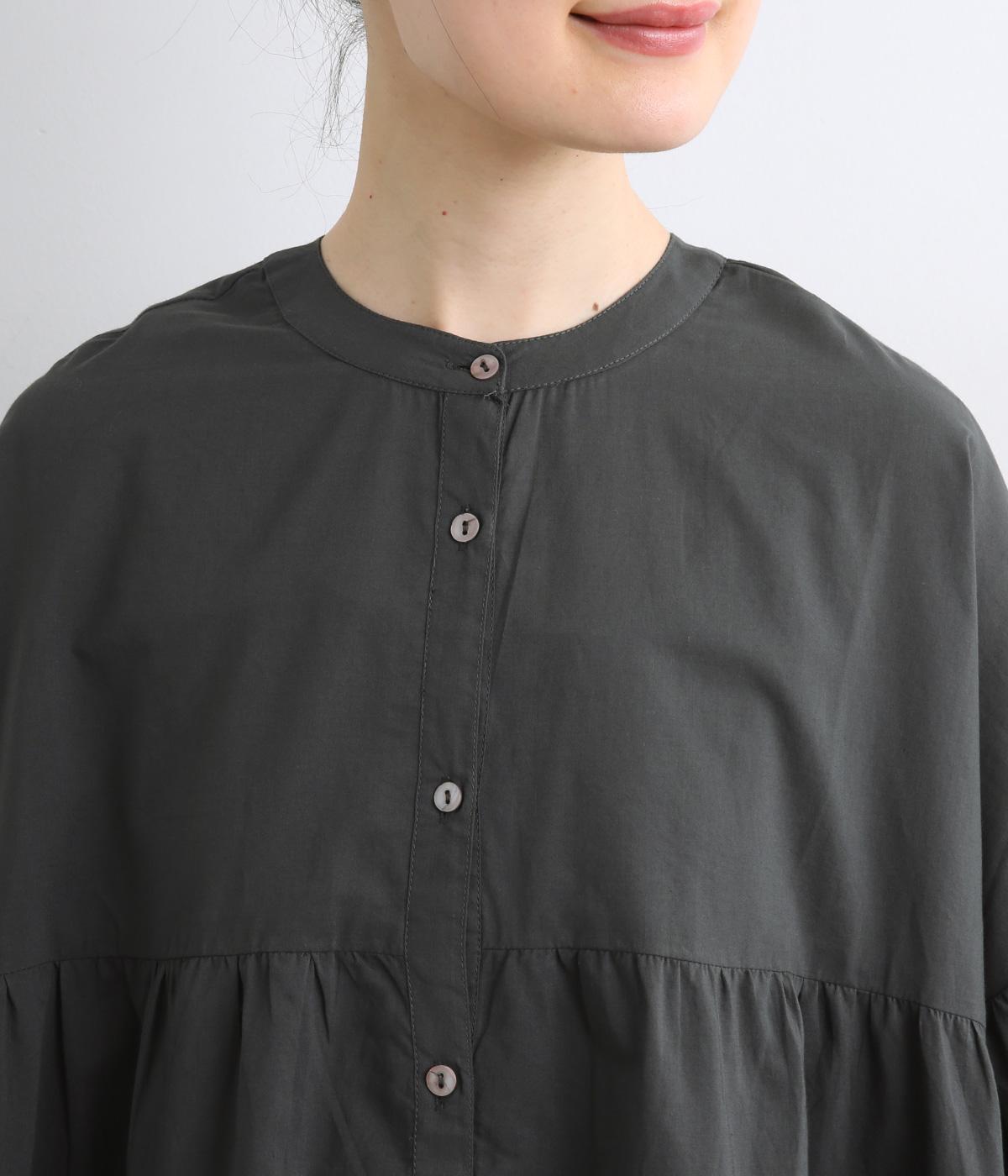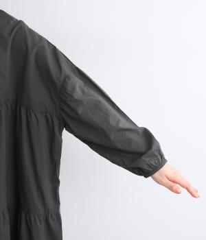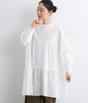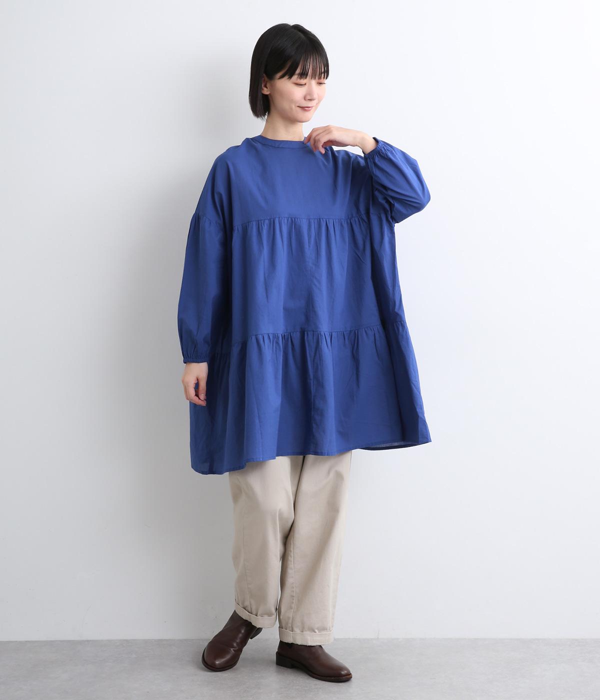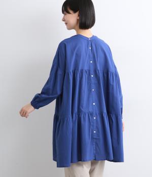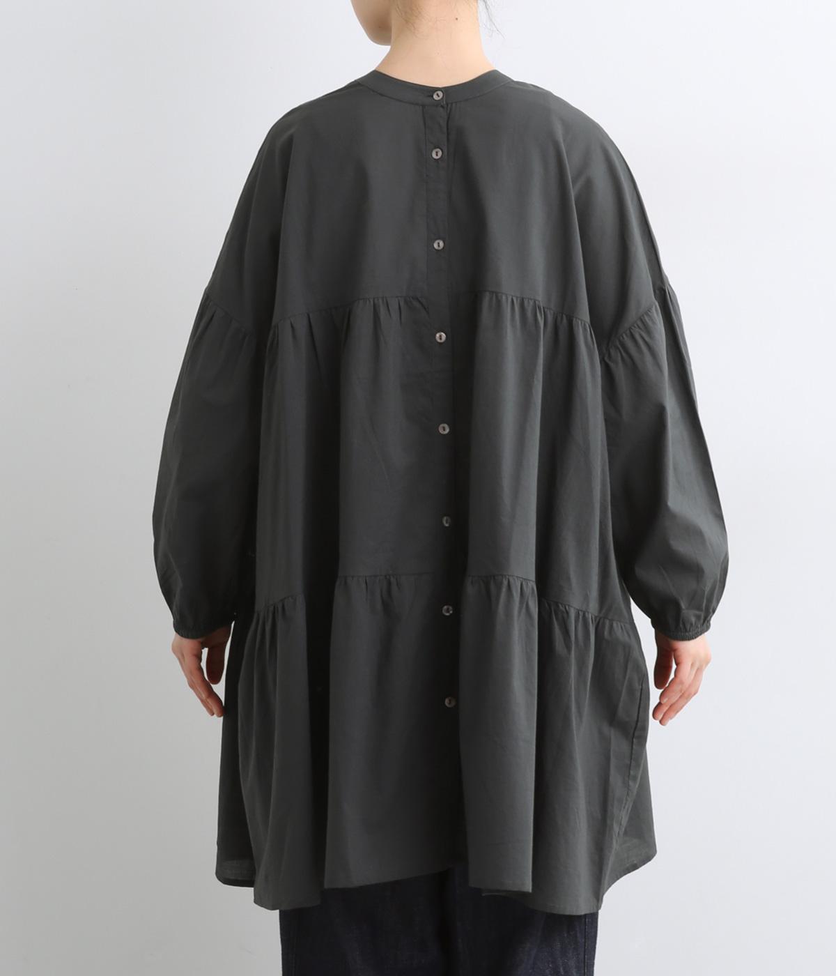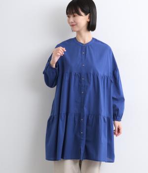 華やかな印象のティアードブラウスを2wayで仕立てました。ふんわりとしたシルエットとロング丈で体型をカバー叶えます。首元はノーカラーで顔まわりをすっきり見せます。袖口はゴム仕様で、たくしあげてニュアンスの変化も楽しめます。