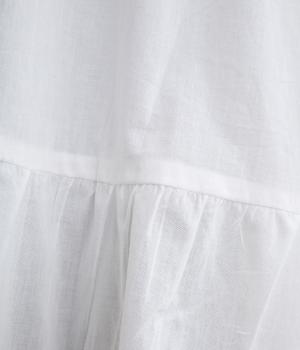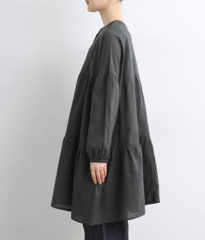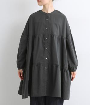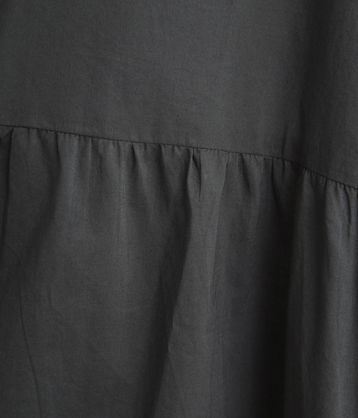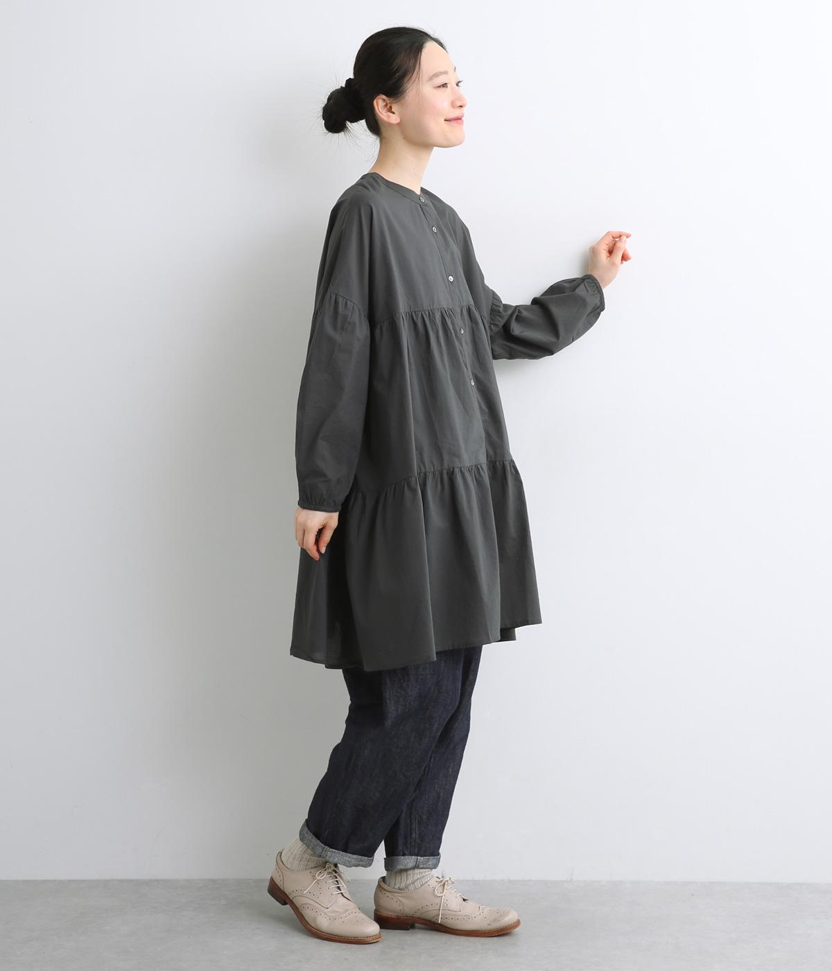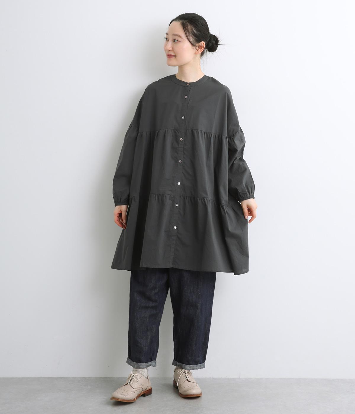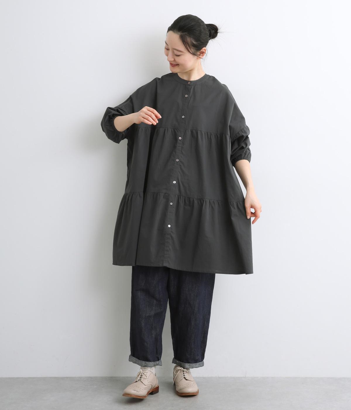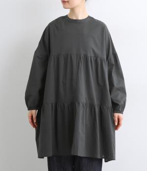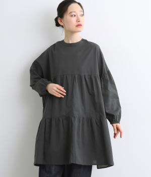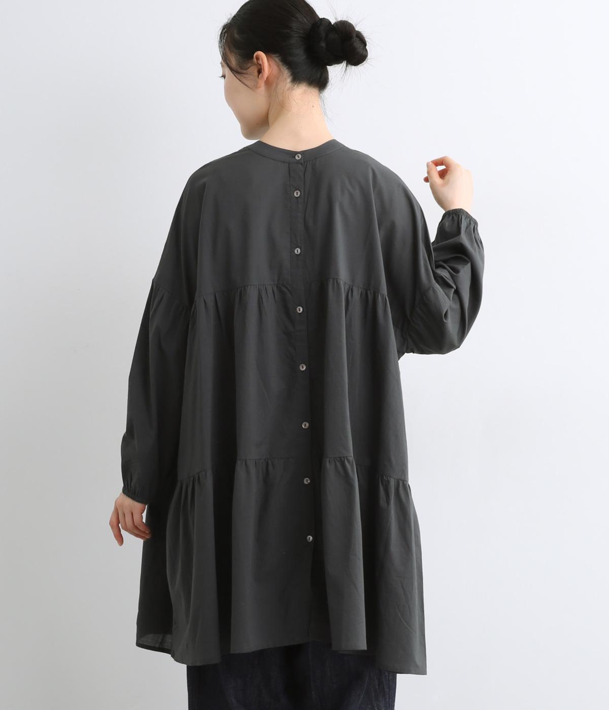 華やかな印象のティアードブラウスを2wayで仕立てました。ふんわりとしたシルエットとロング丈で体型をカバー叶えます。首元はノーカラーで顔まわりをすっきり見せます。袖口はゴム仕様で、たくしあげてニュアンスの変化も楽しめます。