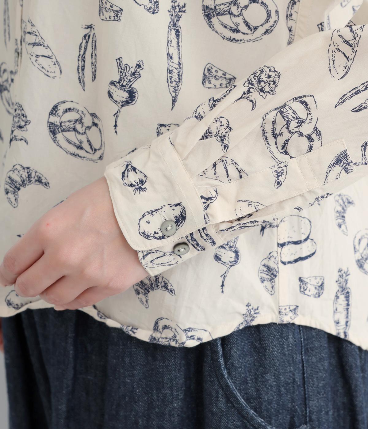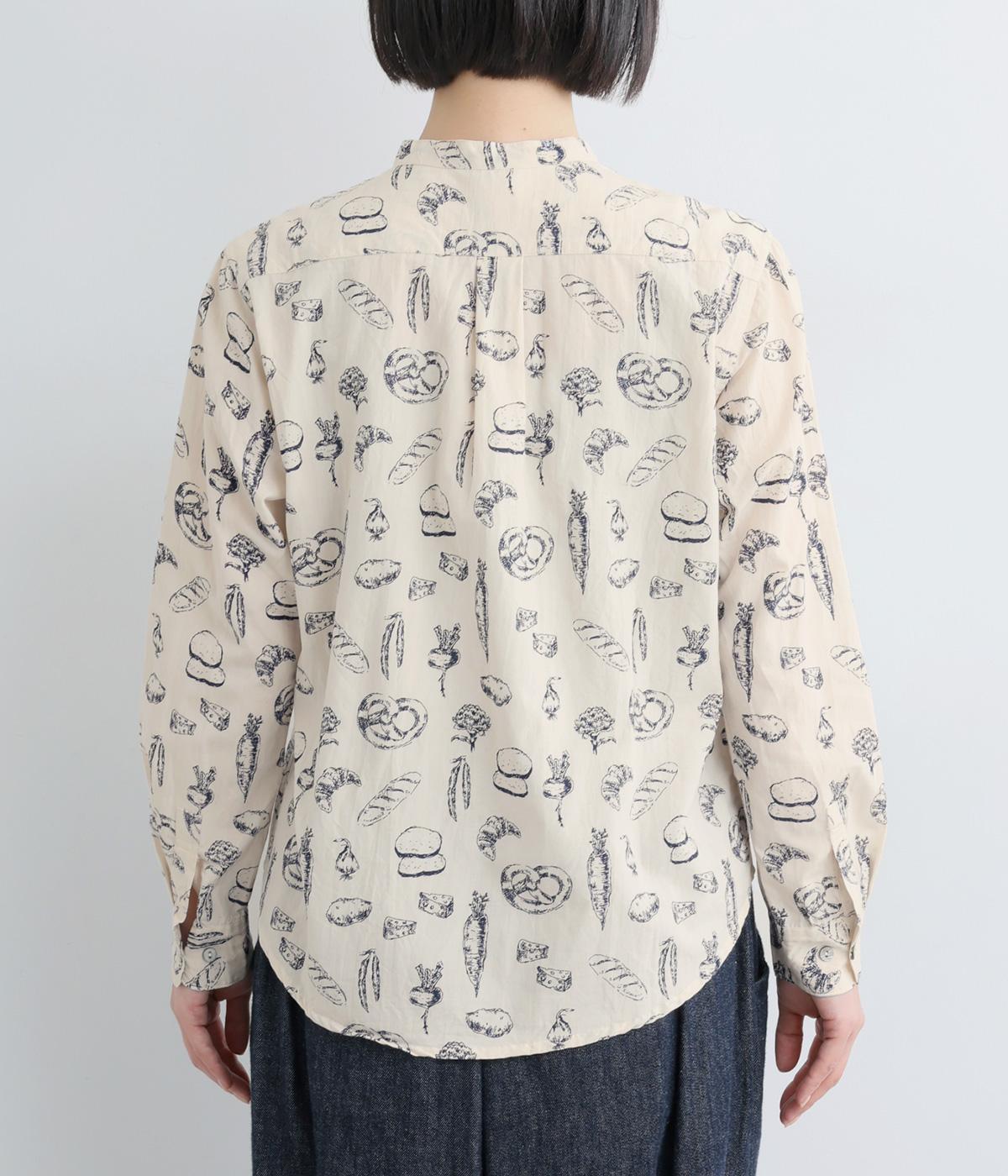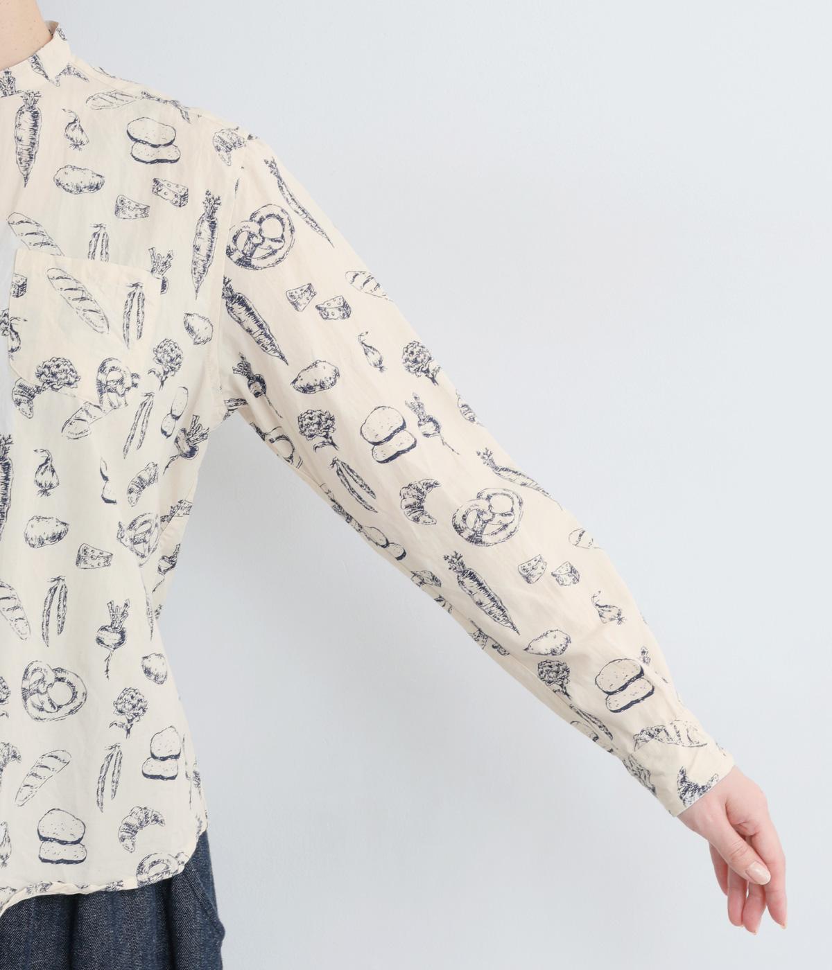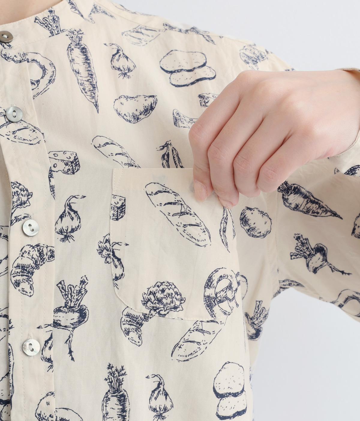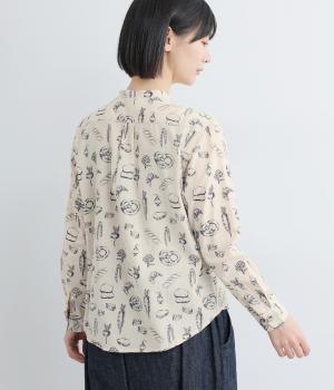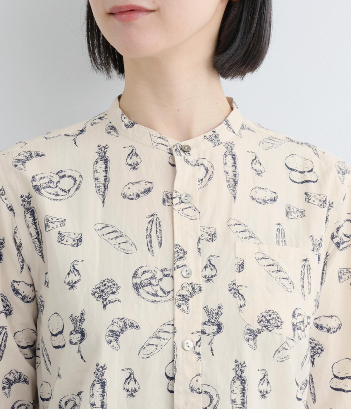手描きスケッチのようなタッチで描かれたパンや野菜が、あたたかみのある表情を添えます。バンドカラーのコンパクトなシルエットに、背中のタックとラウンド裾でさりげない立体感をプラス。個性がありながらも、日常の装いに自然となじむ一枚です。