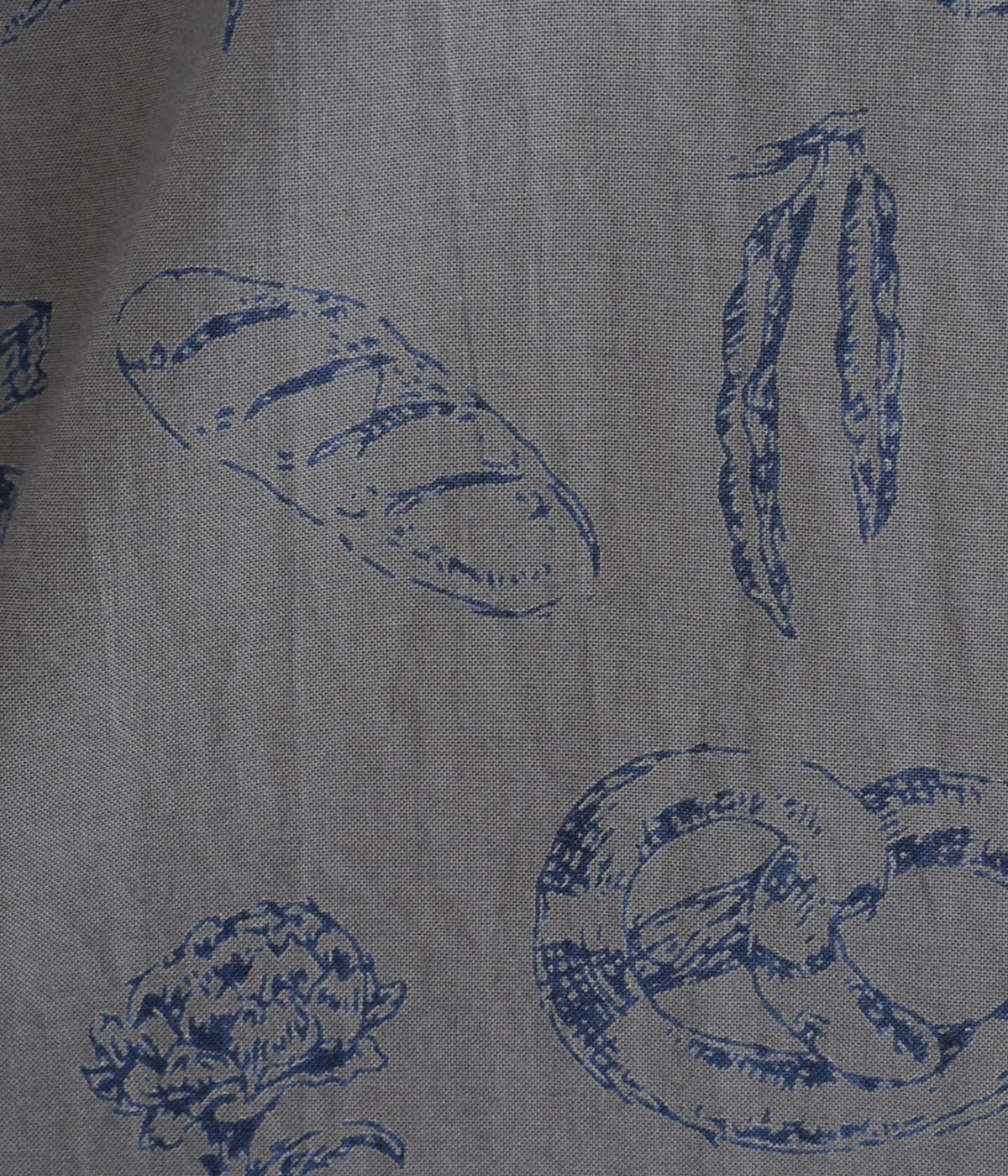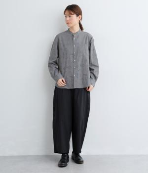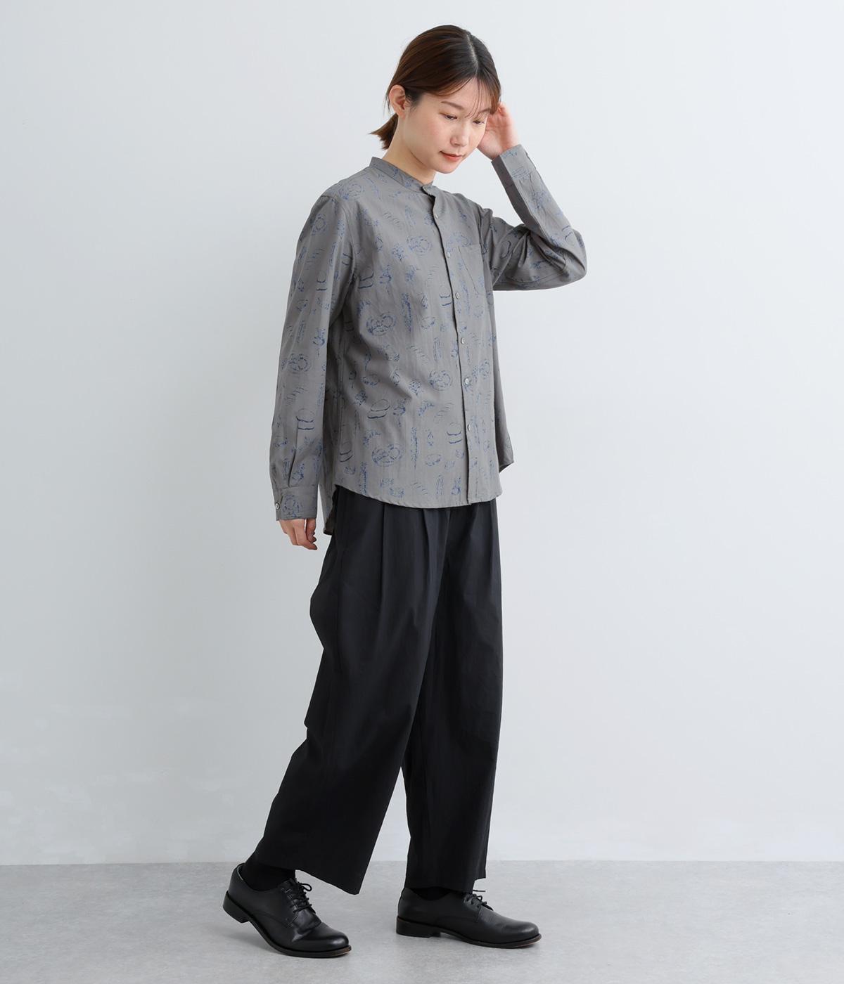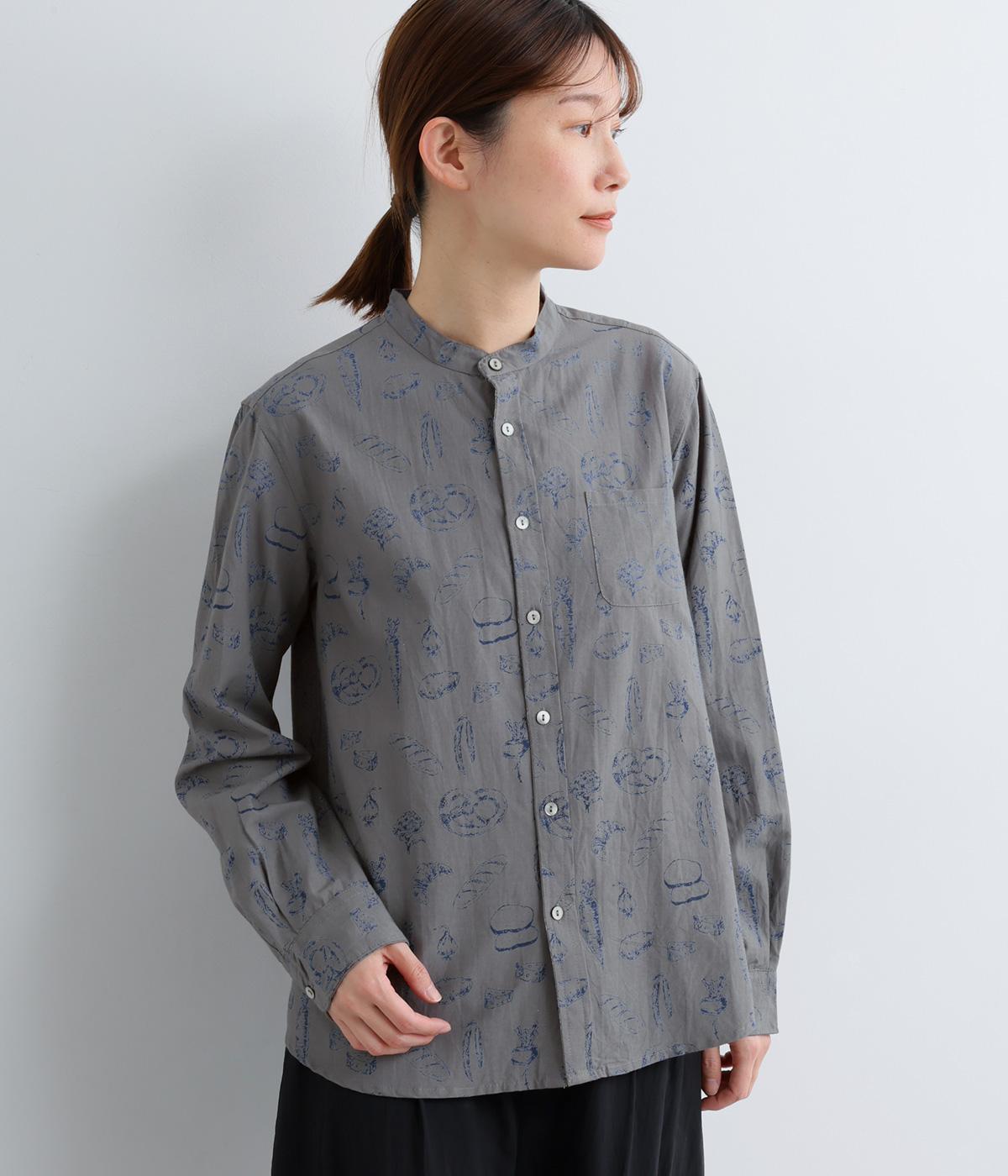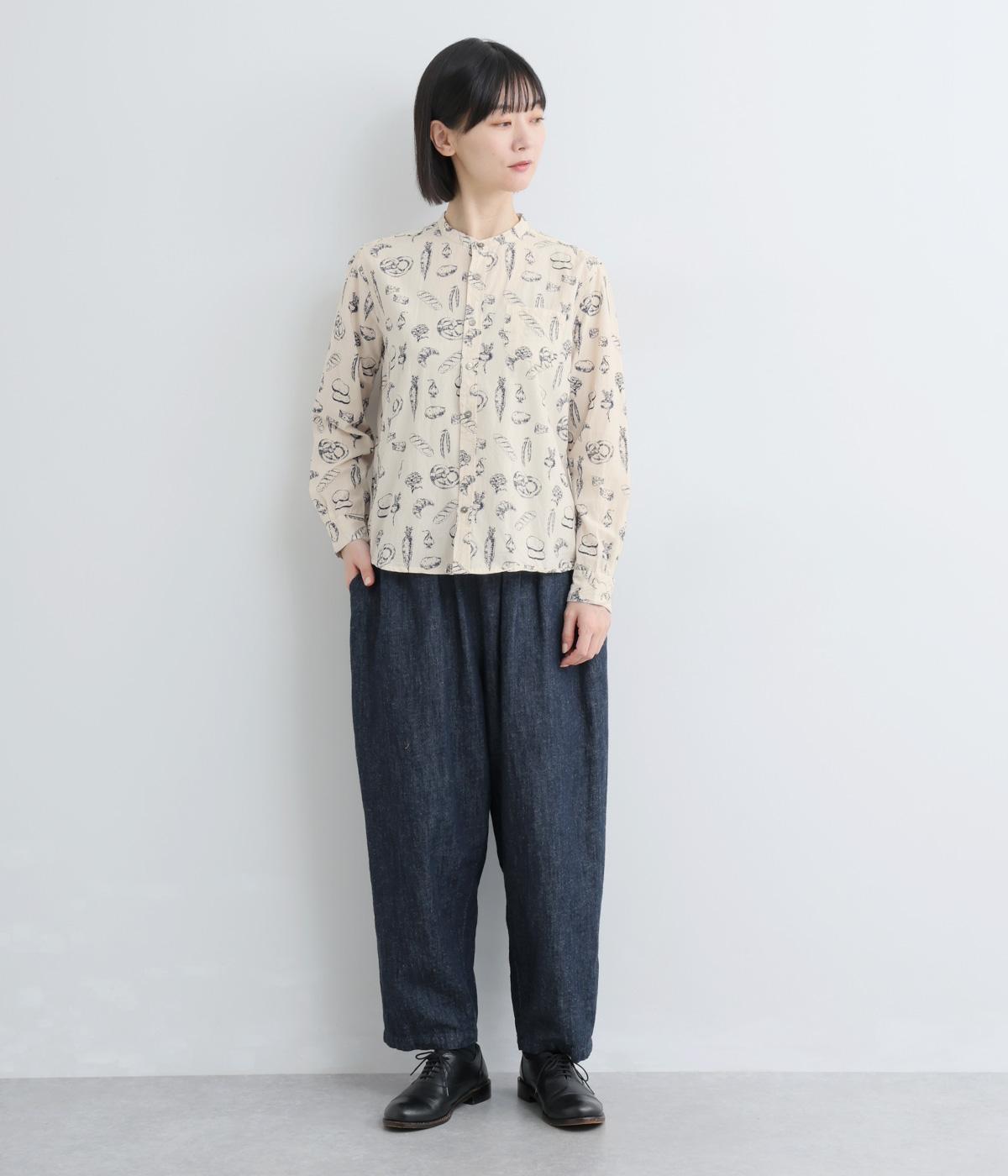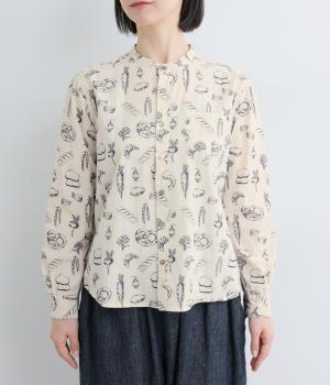 手描きスケッチのようなタッチで描かれたパンや野菜が、あたたかみのある表情を添えます。バンドカラーのコンパクトなシルエットに、背中のタックとラウンド裾でさりげない立体感をプラス。個性がありながらも、日常の装いに自然となじむ一枚です。
