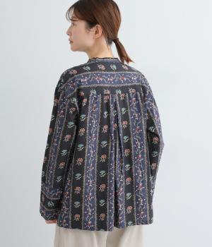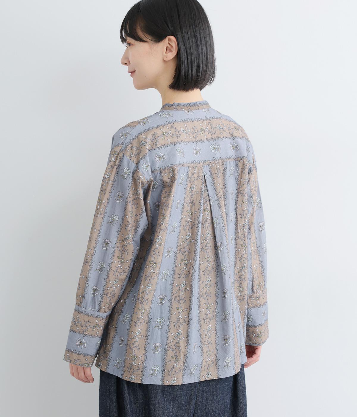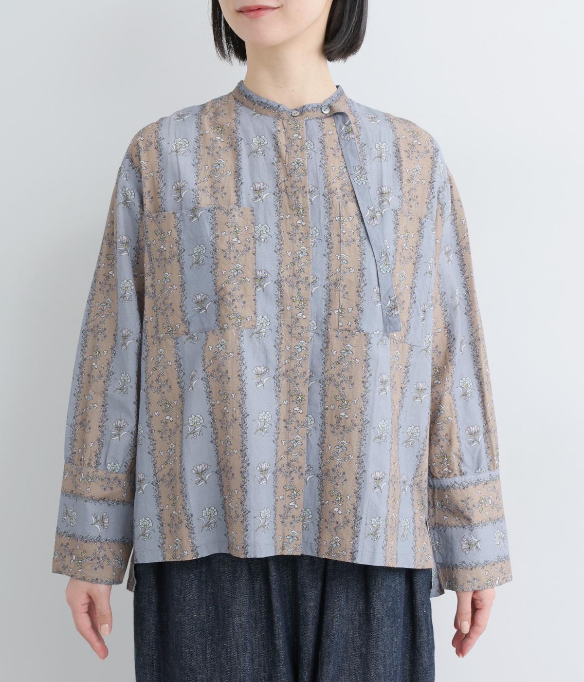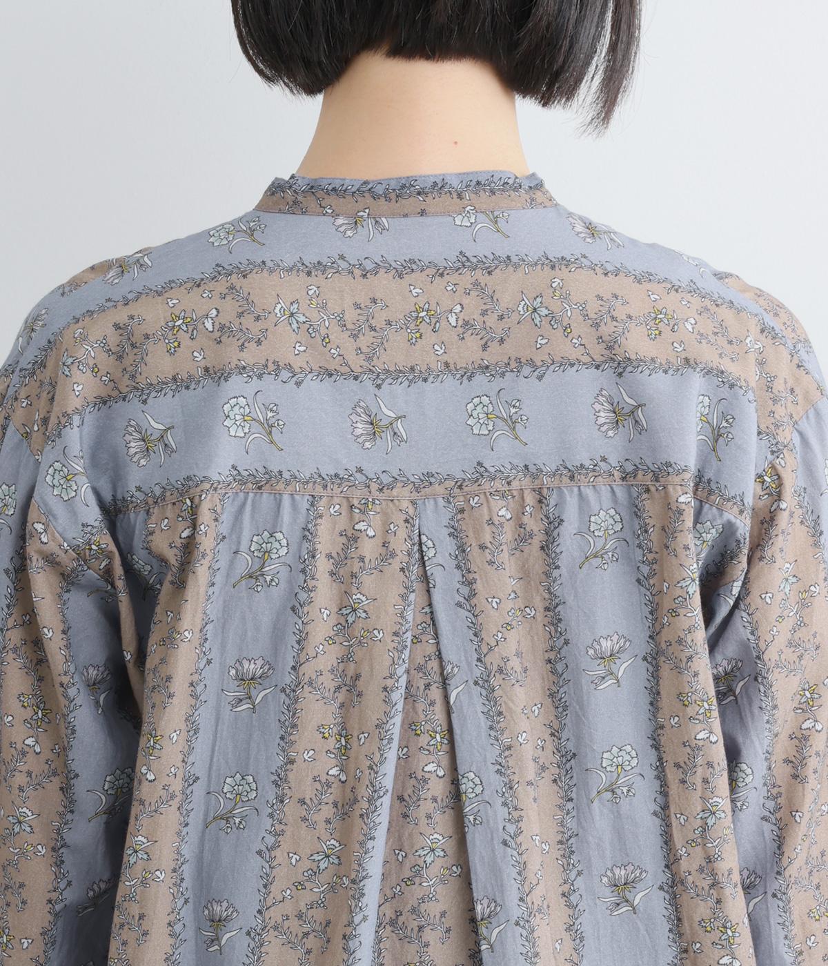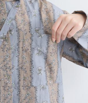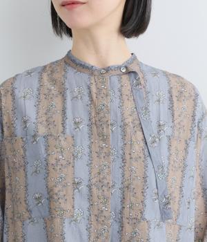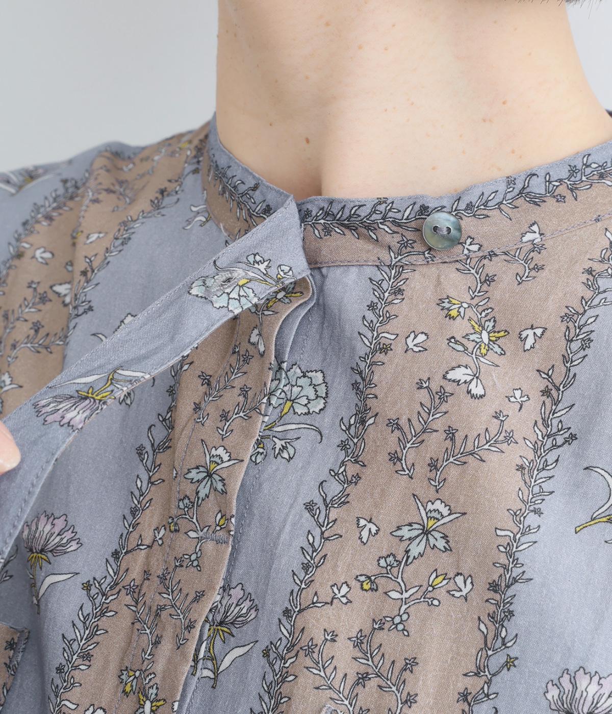 レトロな雰囲気が漂う、ストライプのフラワープリントです。リボンのスタンドカラーがさりげないデザインポイント。背中のヨークやカフスで柄の向きに変化をつけてニュアンスを添えています。シックながら着映えする一枚です。