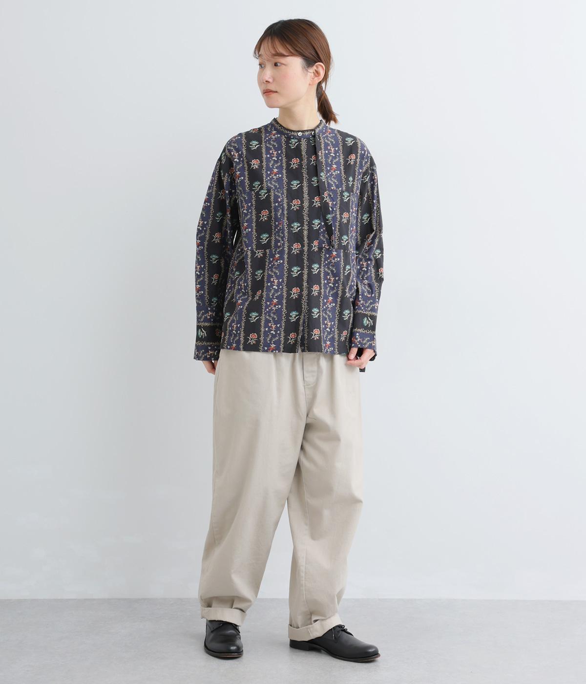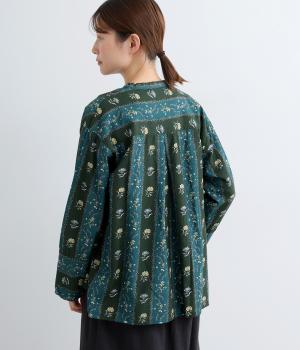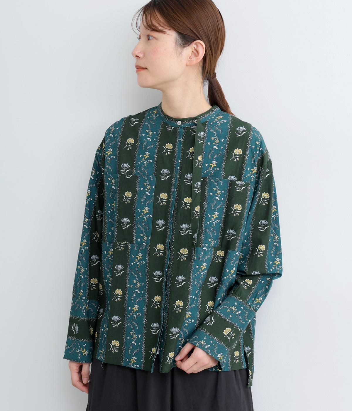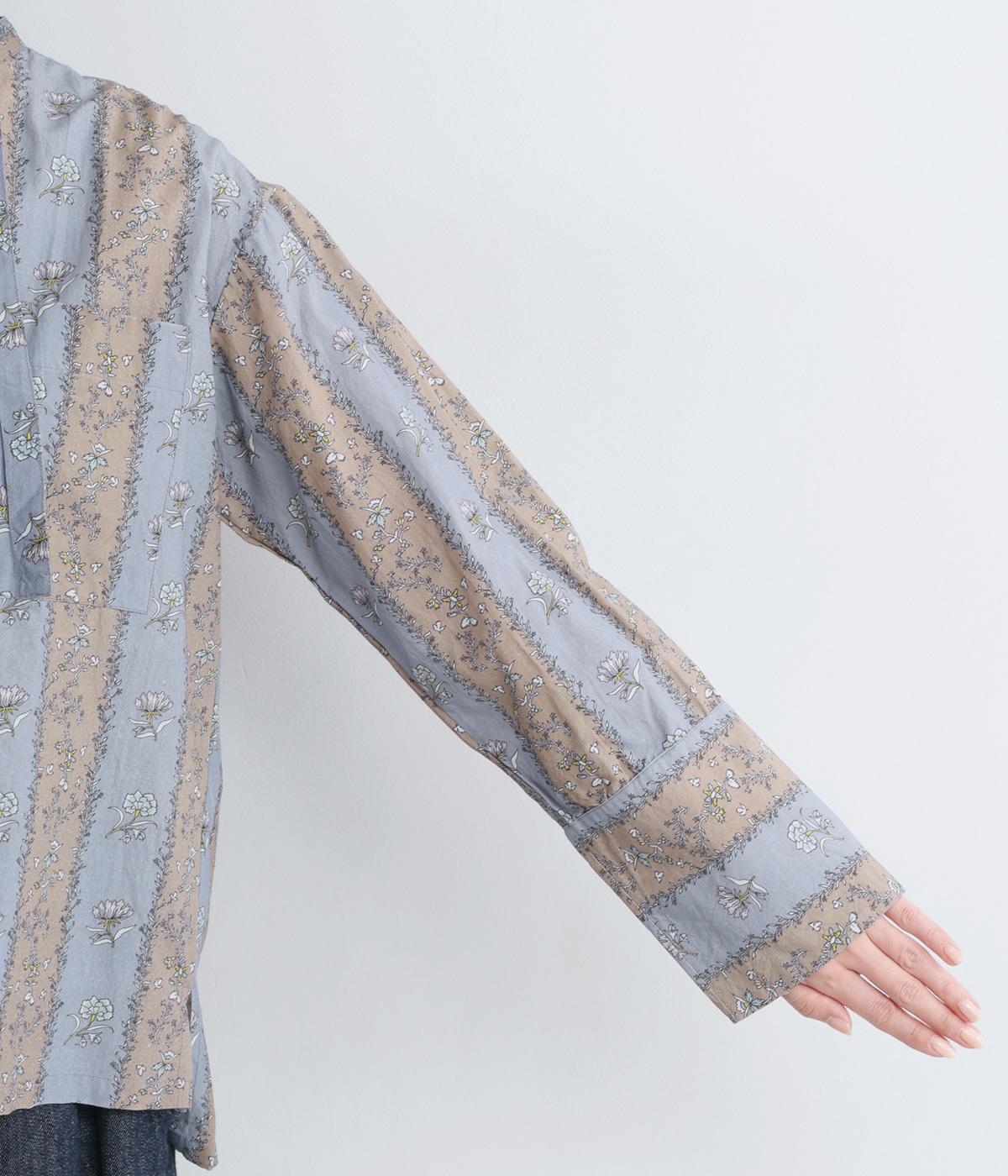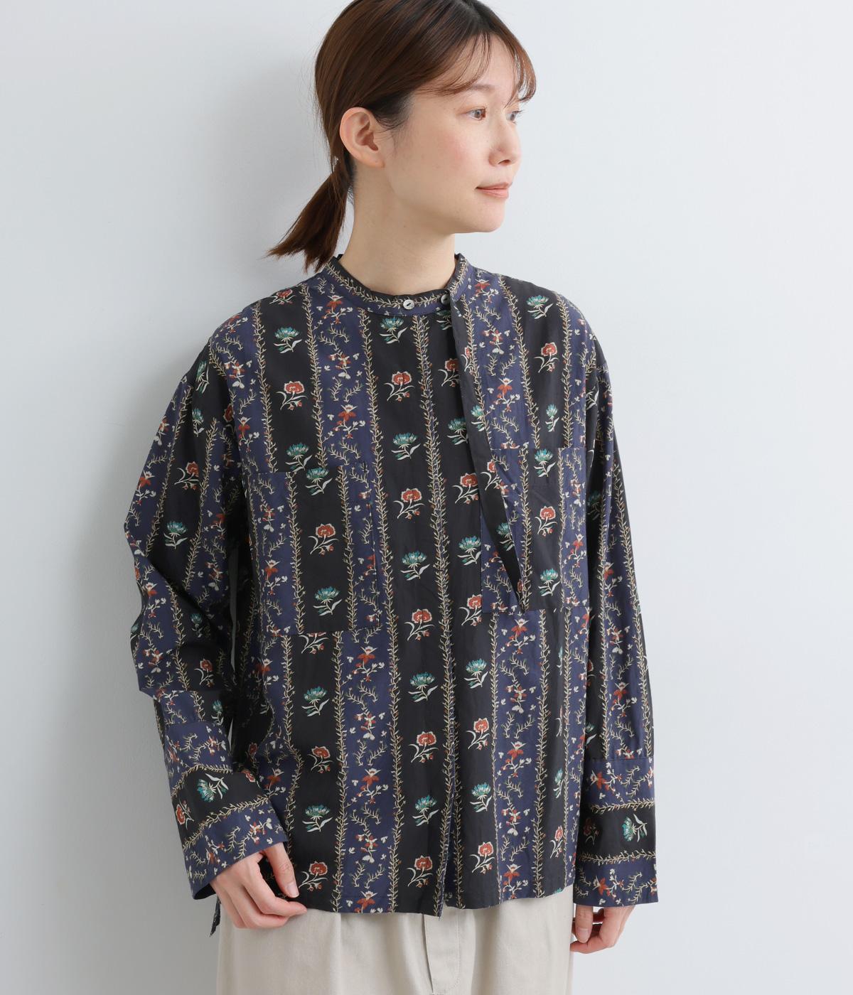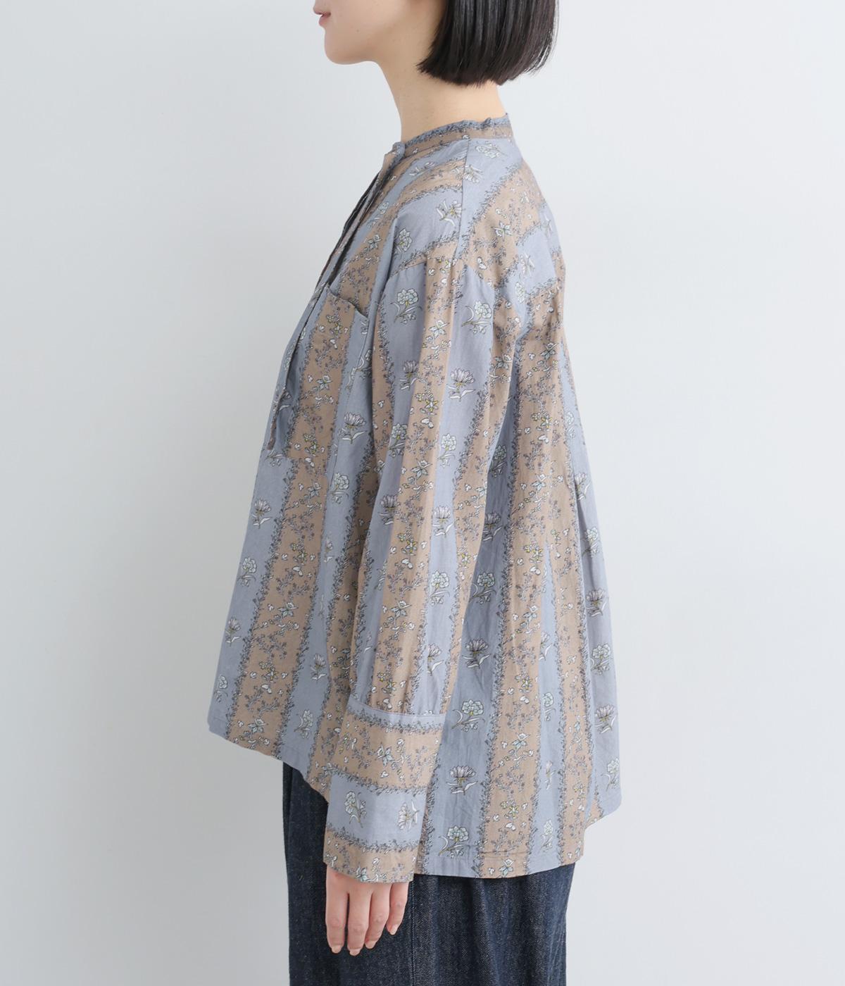 レトロな雰囲気が漂う、ストライプのフラワープリントです。リボンのスタンドカラーがさりげないデザインポイント。背中のヨークやカフスで柄の向きに変化をつけてニュアンスを添えています。シックながら着映えする一枚です。