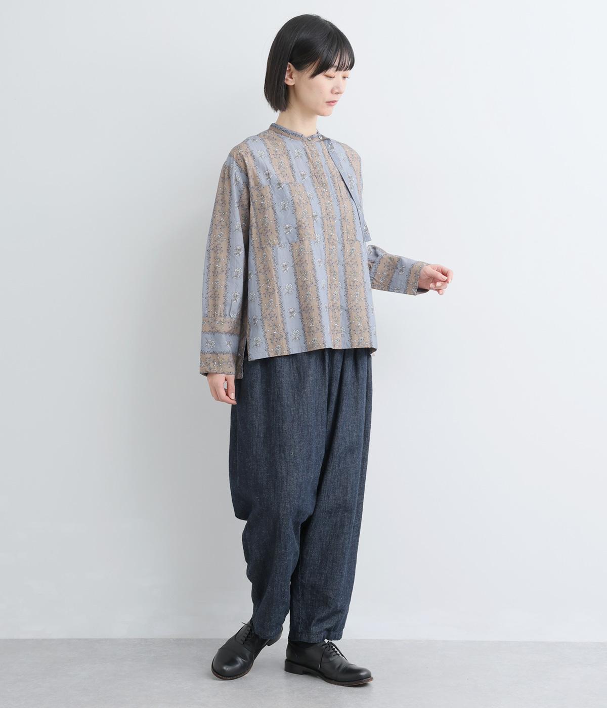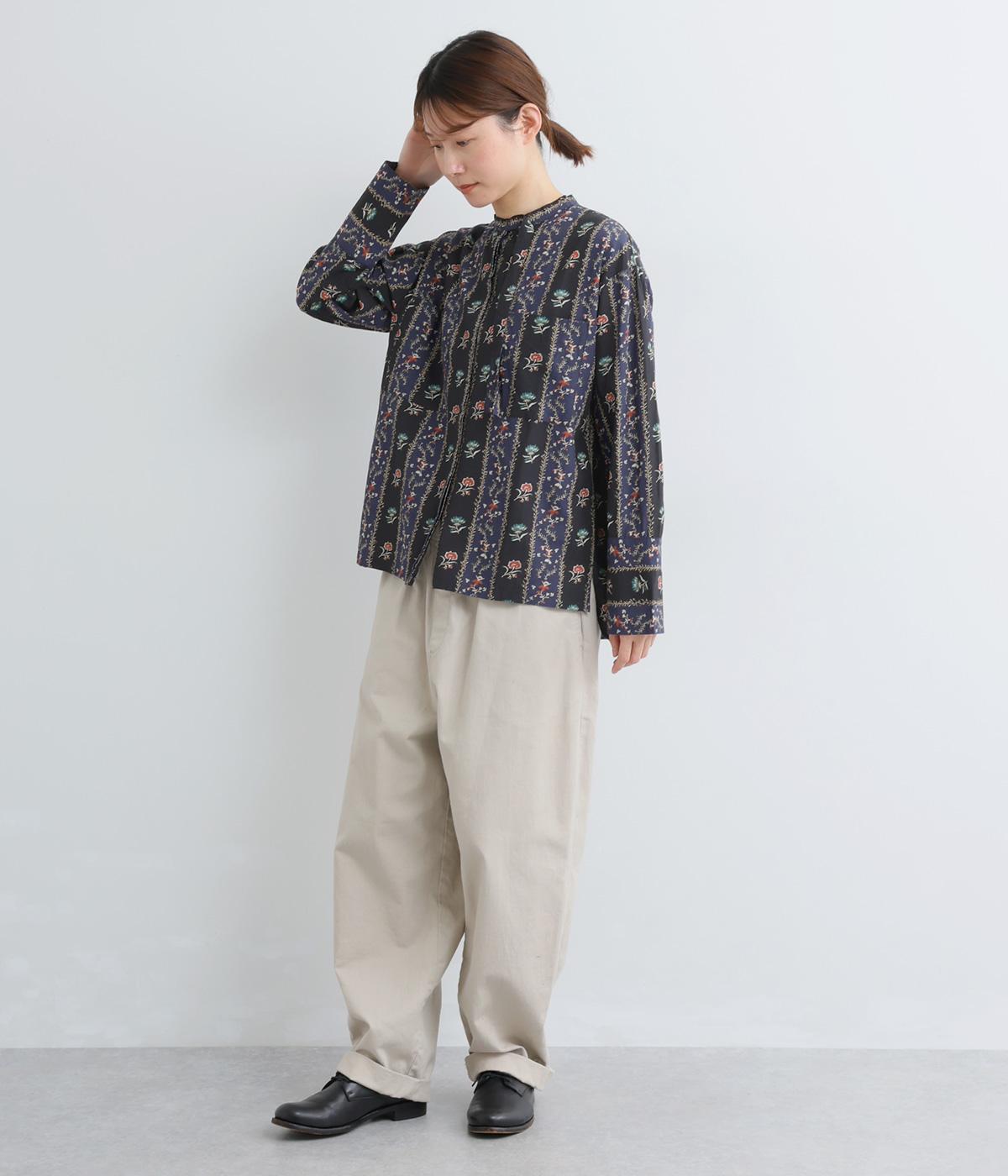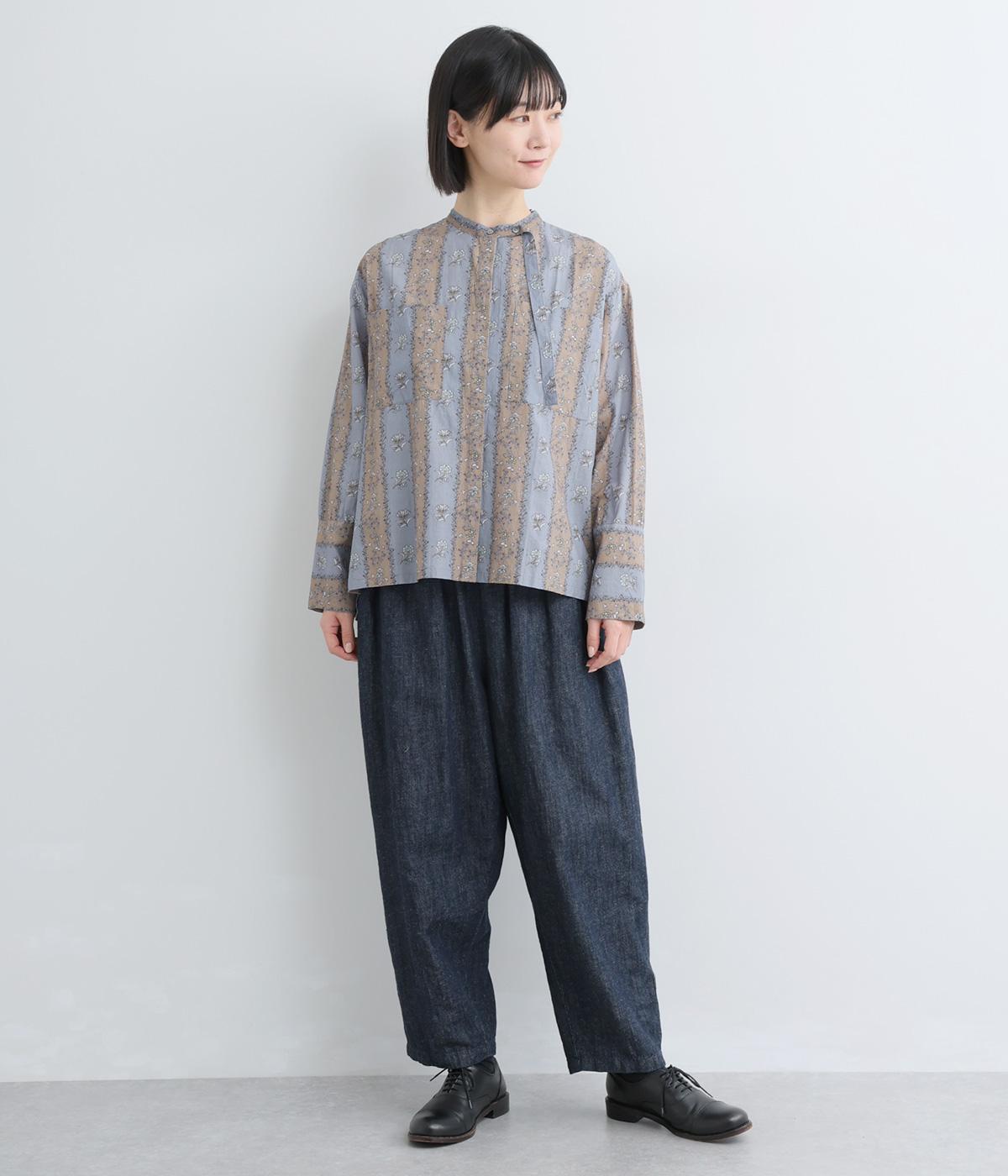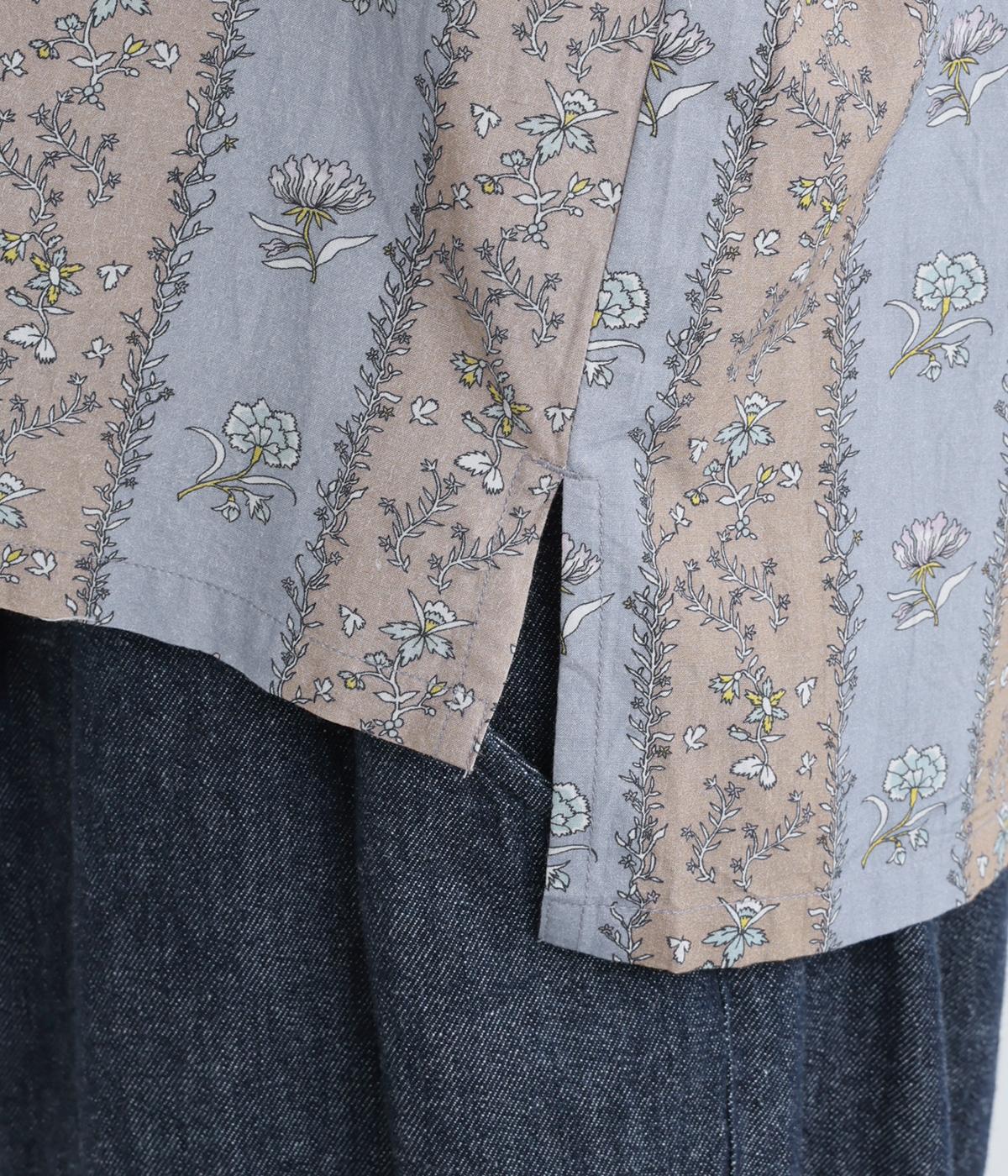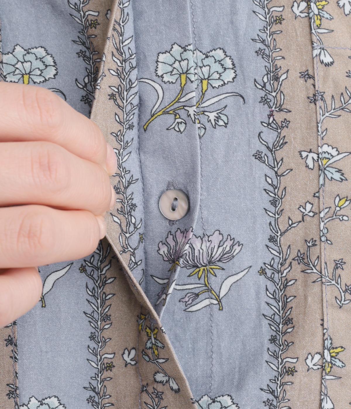 レトロな雰囲気が漂う、ストライプのフラワープリントです。リボンのスタンドカラーがさりげないデザインポイント。背中のヨークやカフスで柄の向きに変化をつけてニュアンスを添えています。シックながら着映えする一枚です。
