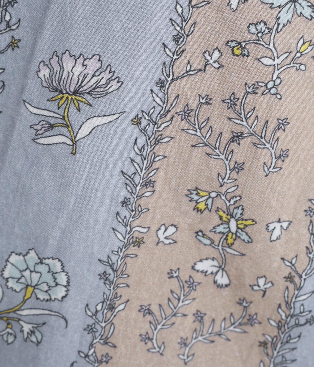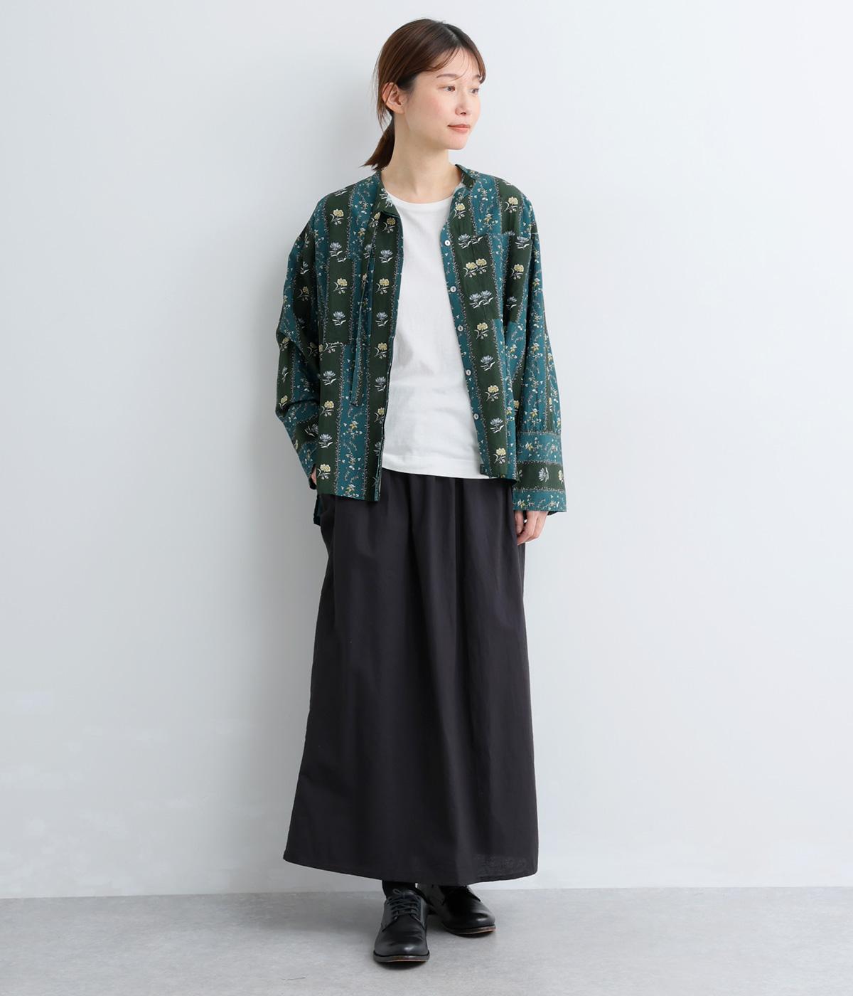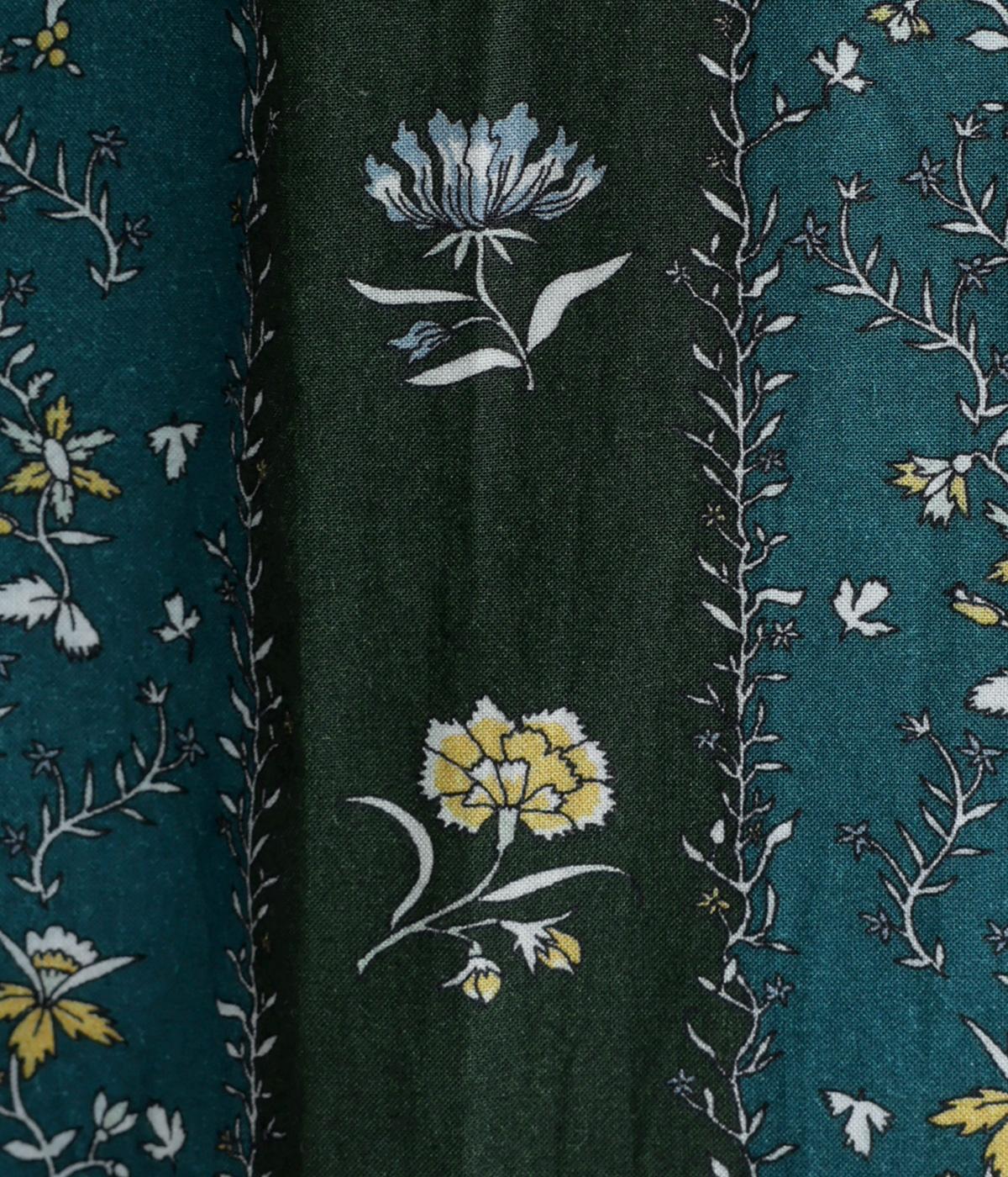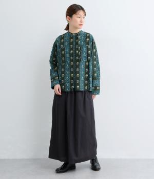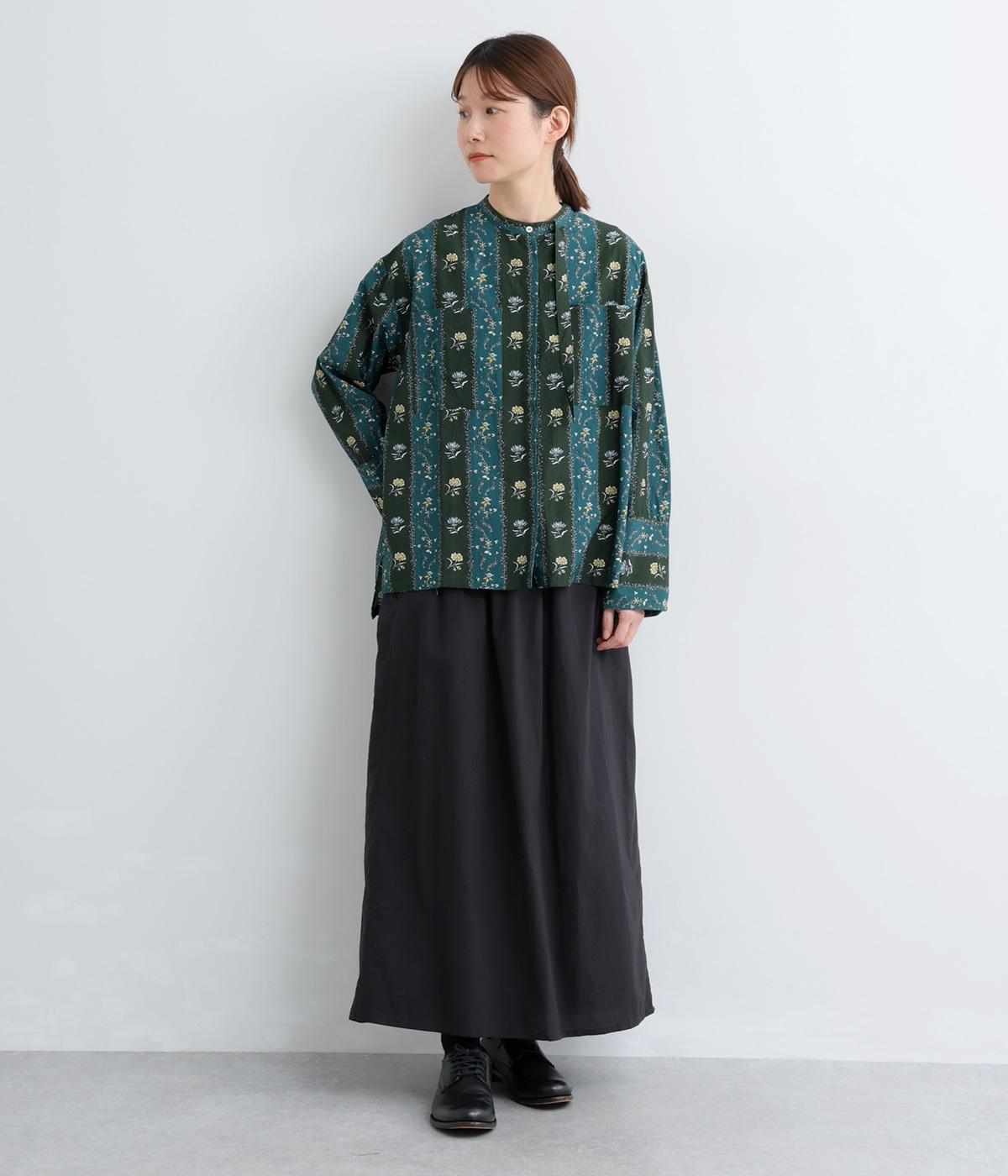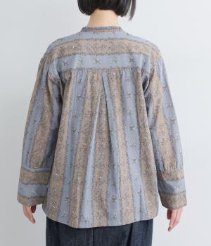 レトロな雰囲気が漂う、ストライプのフラワープリントです。リボンのスタンドカラーがさりげないデザインポイント。背中のヨークやカフスで柄の向きに変化をつけてニュアンスを添えています。シックながら着映えする一枚です。
