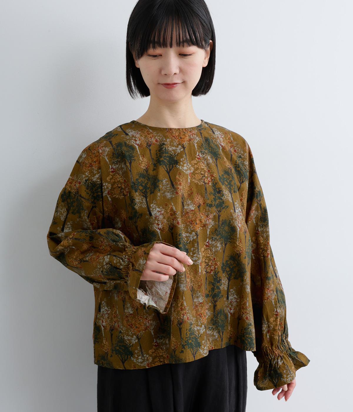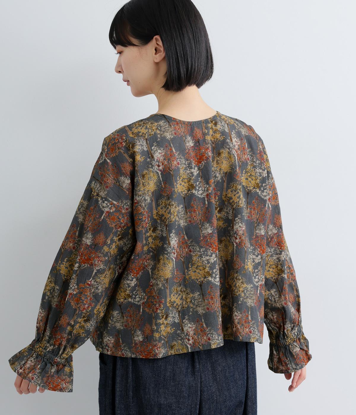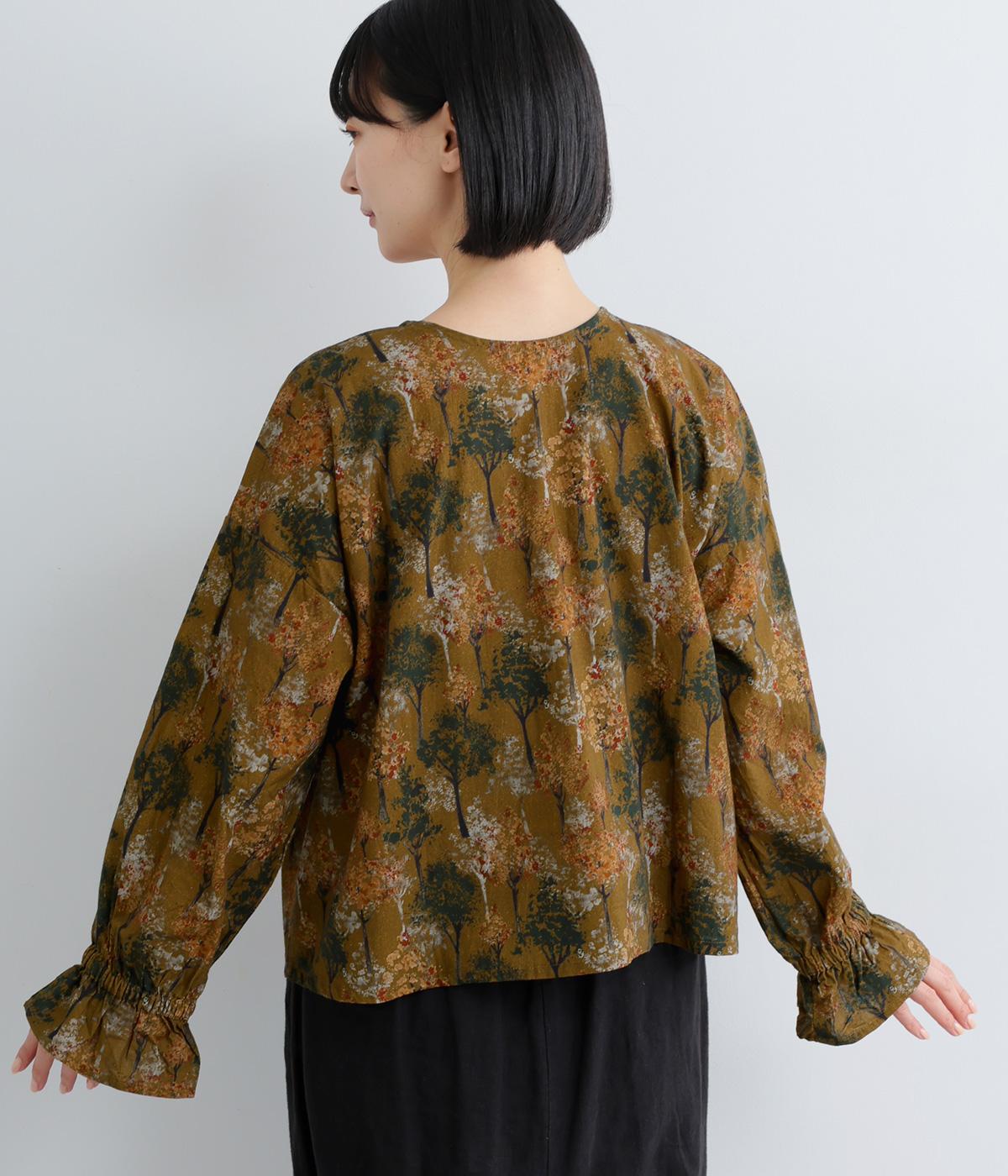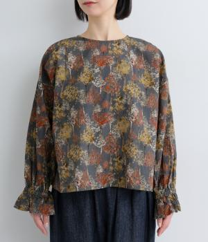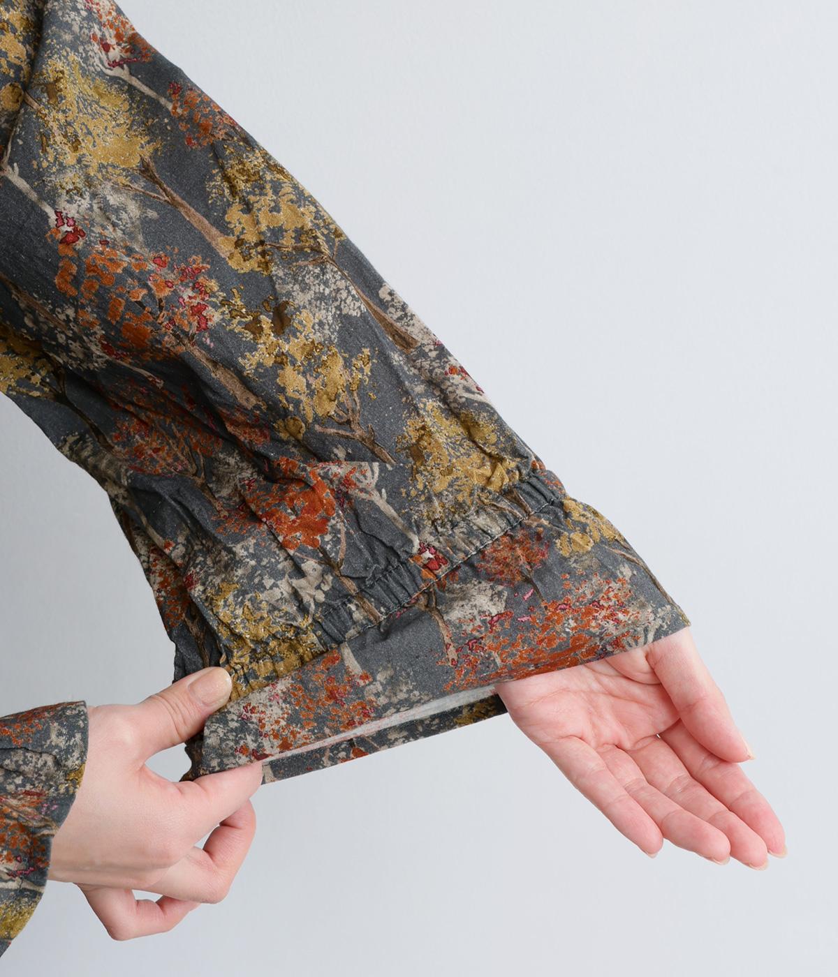 絵の具を重ねたようなタッチの木のプリントが個性的な雰囲気を醸します。袖口にゴムを配し優雅に広がるフレアシルエットが華やかさをプラス。前後でそれぞれの表情を楽しめる2way仕様で、シンプルなスタイリングにニュアンスを添えるアイテムです。