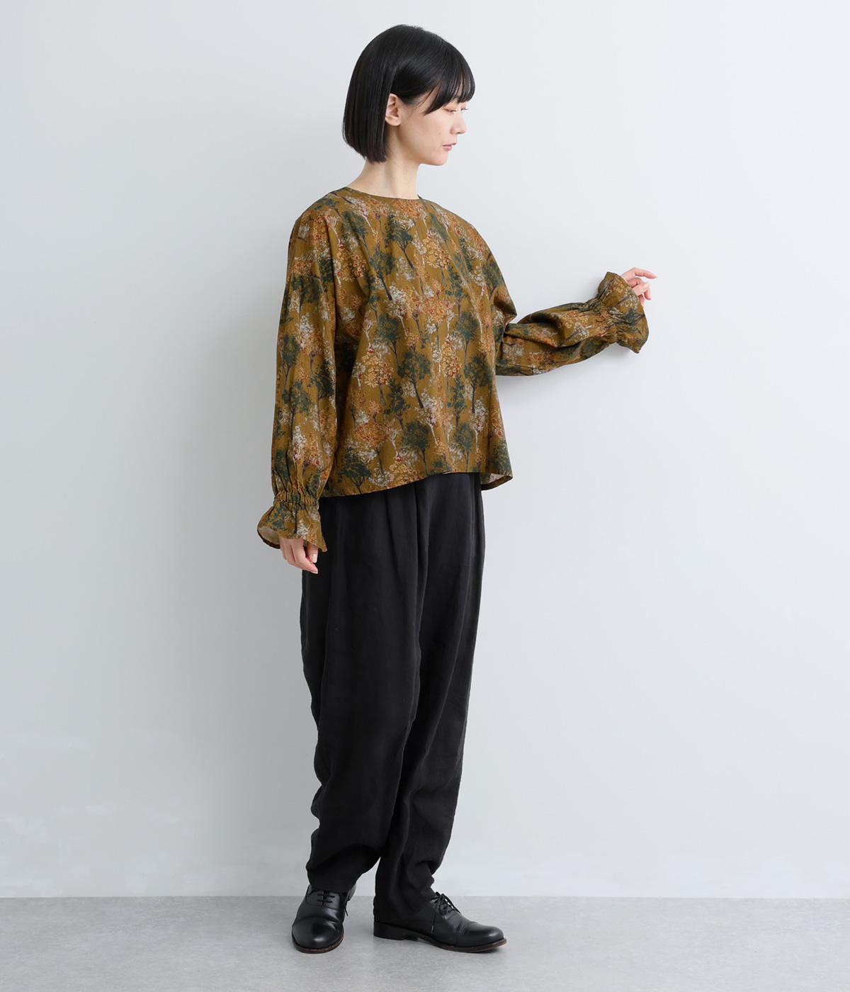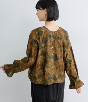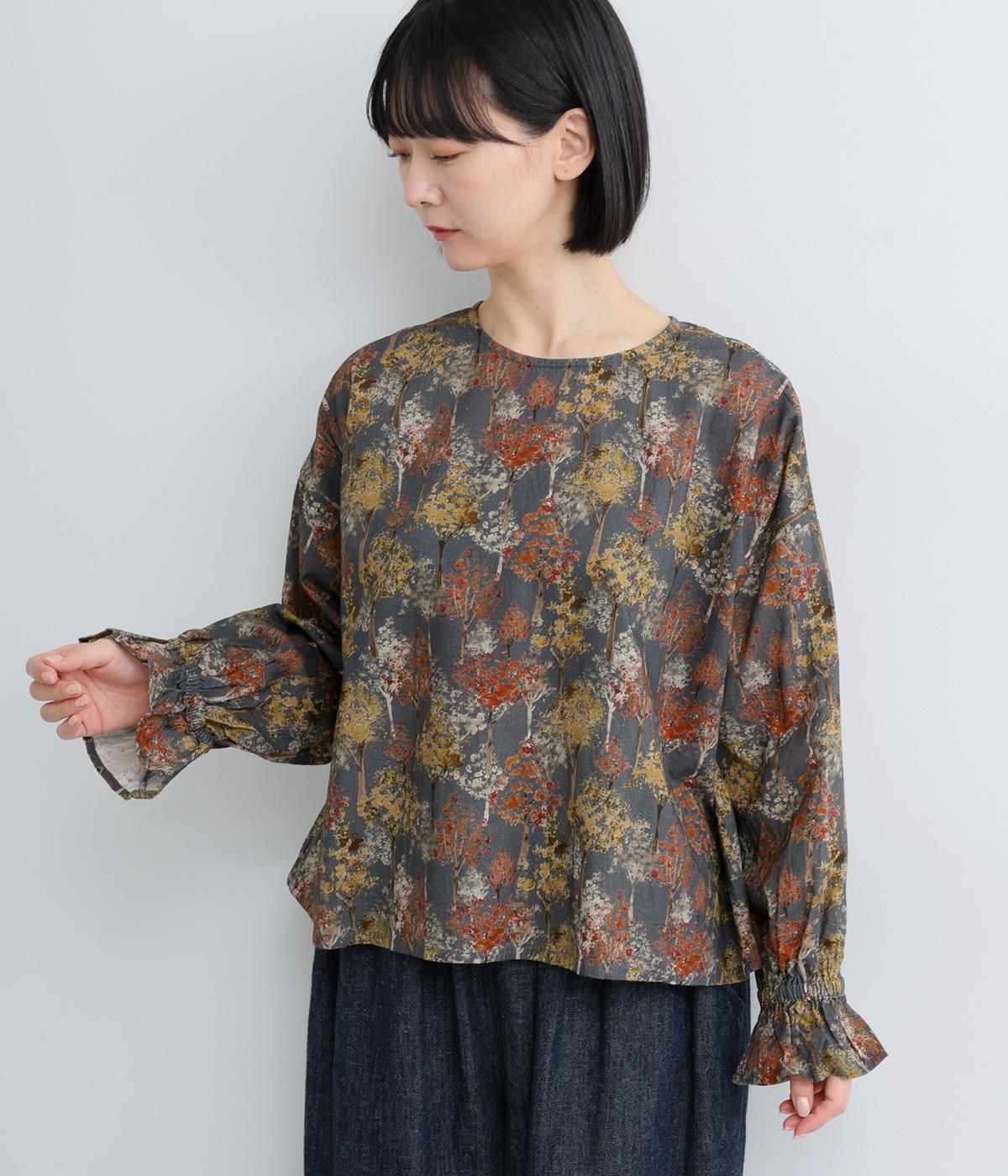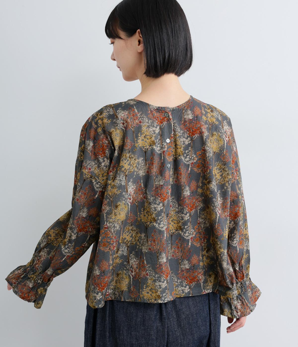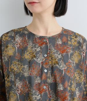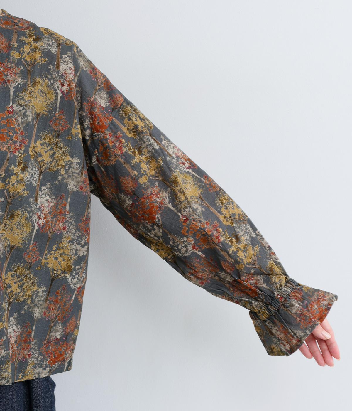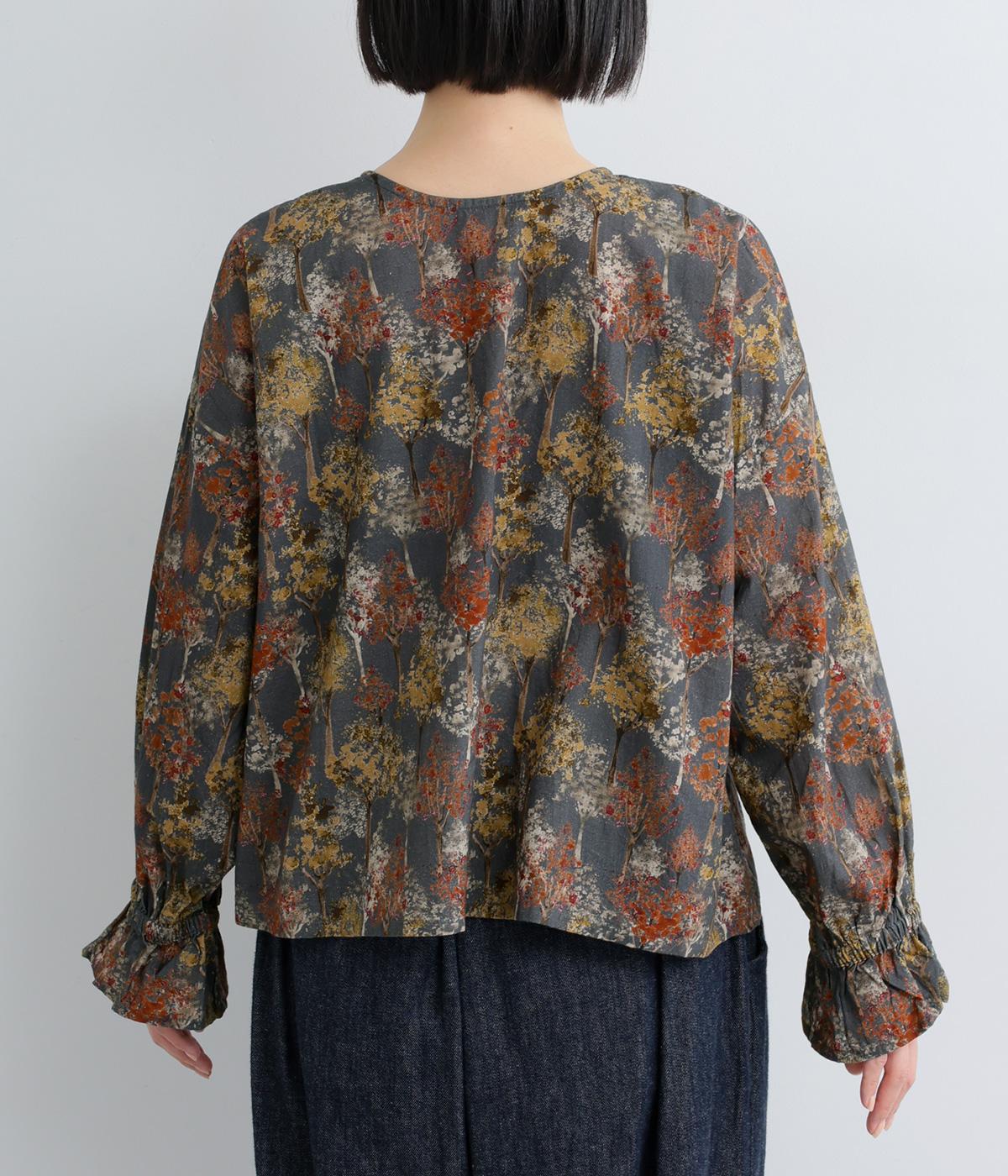 絵の具を重ねたようなタッチの木のプリントが個性的な雰囲気を醸します。袖口にゴムを配し優雅に広がるフレアシルエットが華やかさをプラス。前後でそれぞれの表情を楽しめる2way仕様で、シンプルなスタイリングにニュアンスを添えるアイテムです。