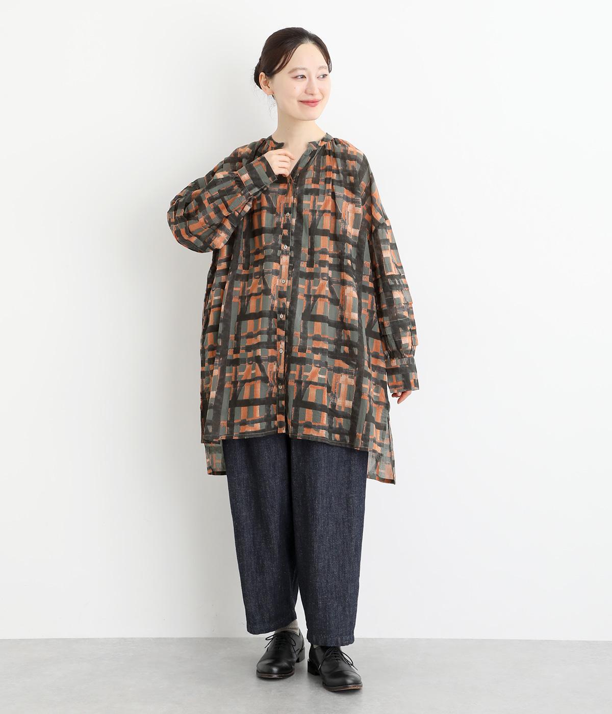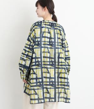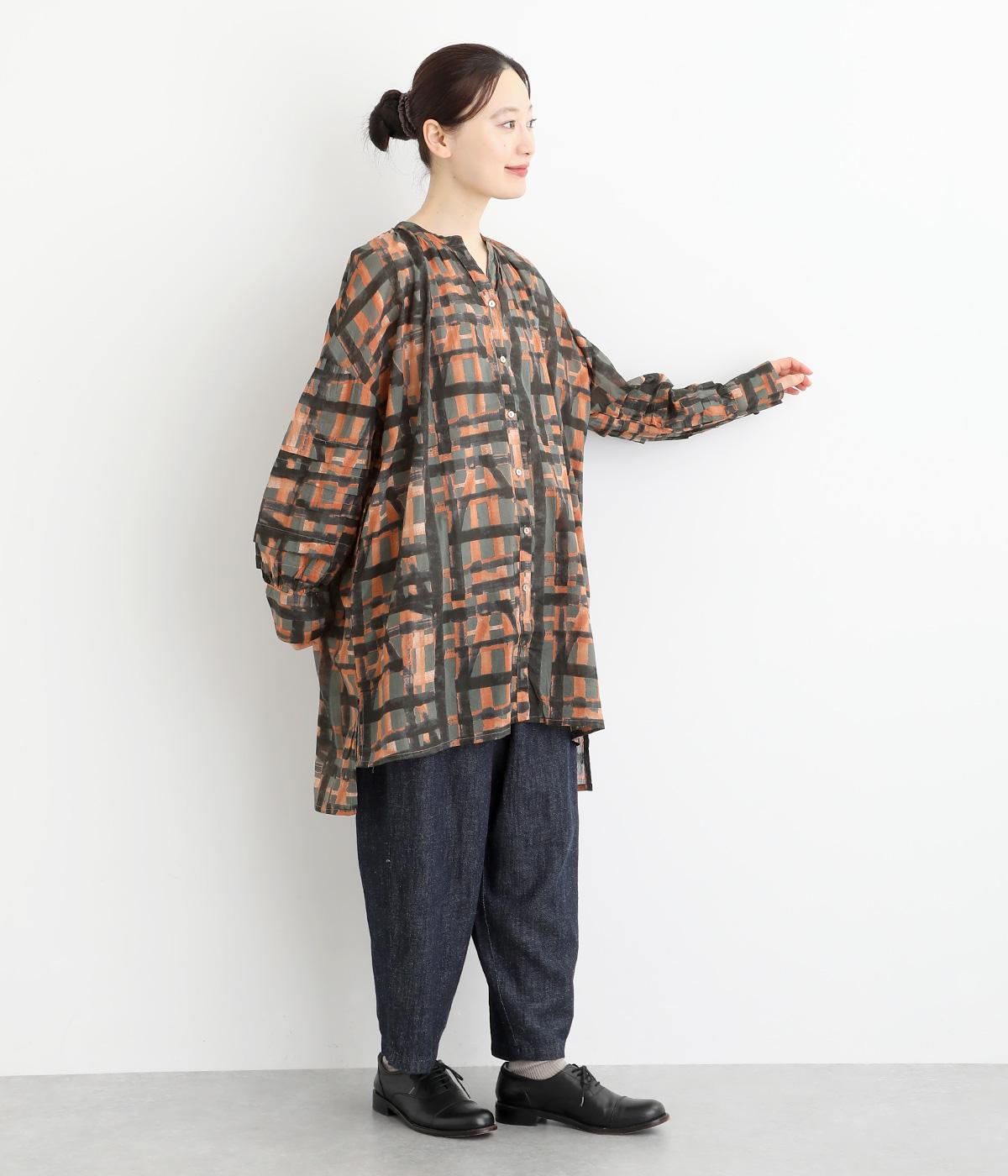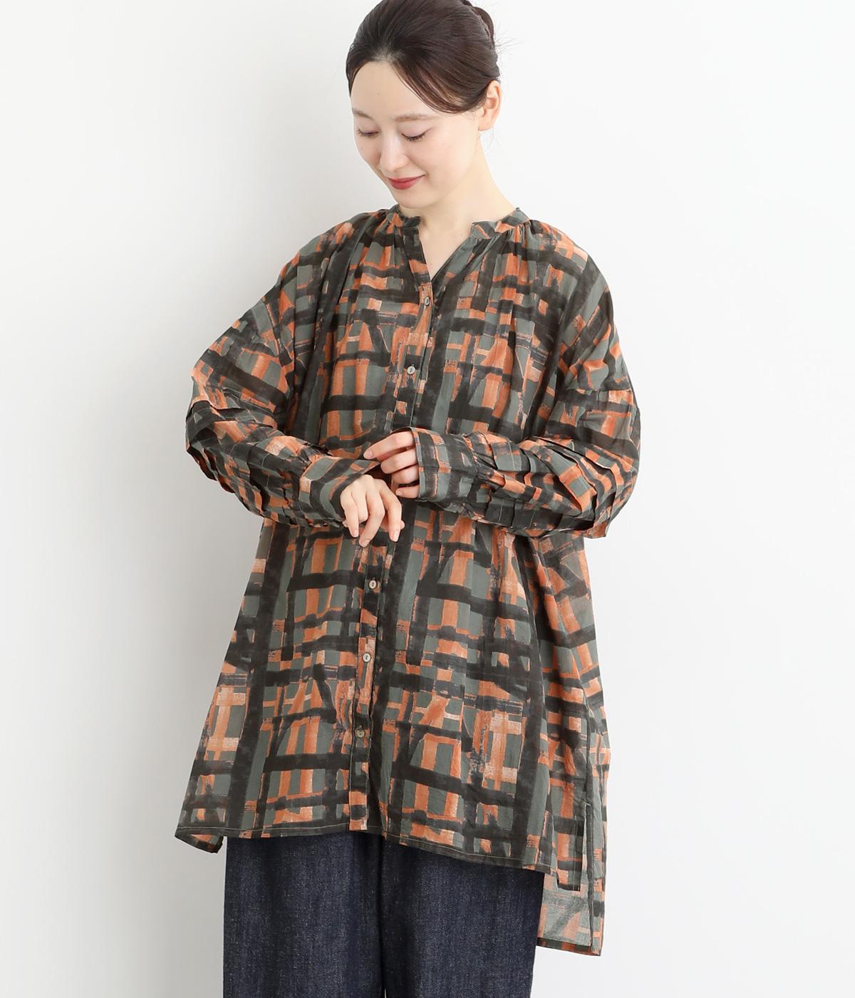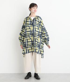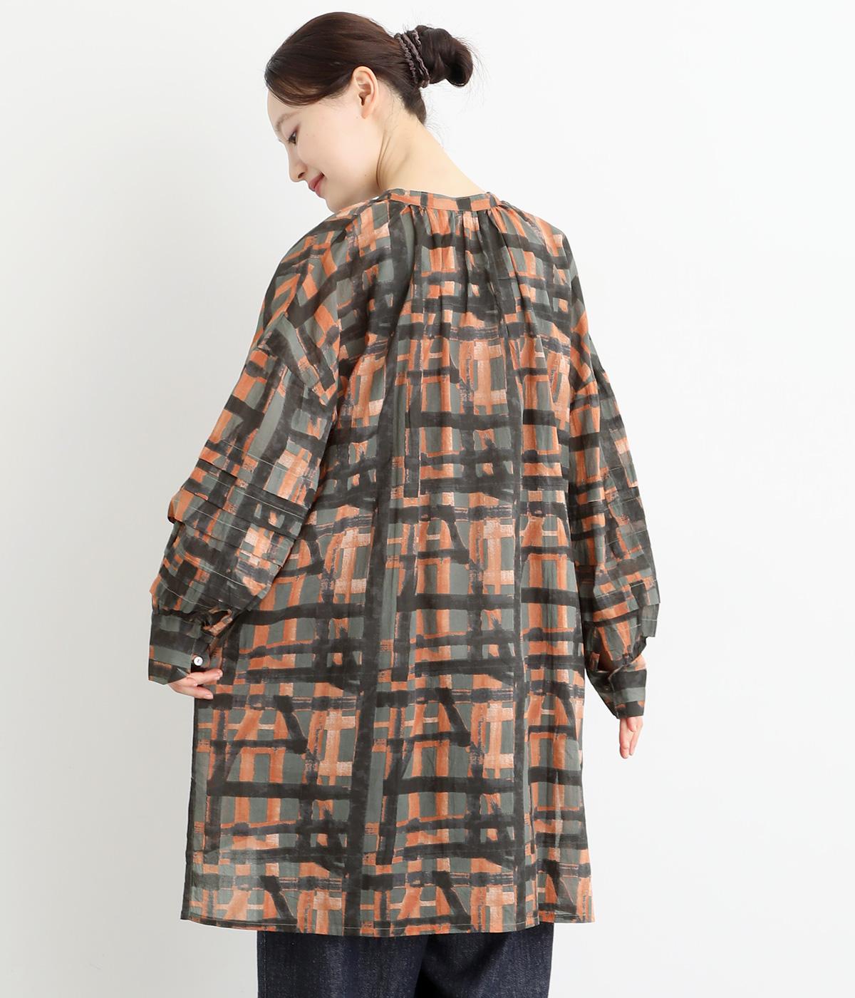 手書きの水彩画のような、個性的で表情のある柄が目をひきます。タックをほどこした袖がぽわんと膨らみのあるシルエットに。前後差をつけた裾が抜け感を演出しながら体型カバーも叶えます。