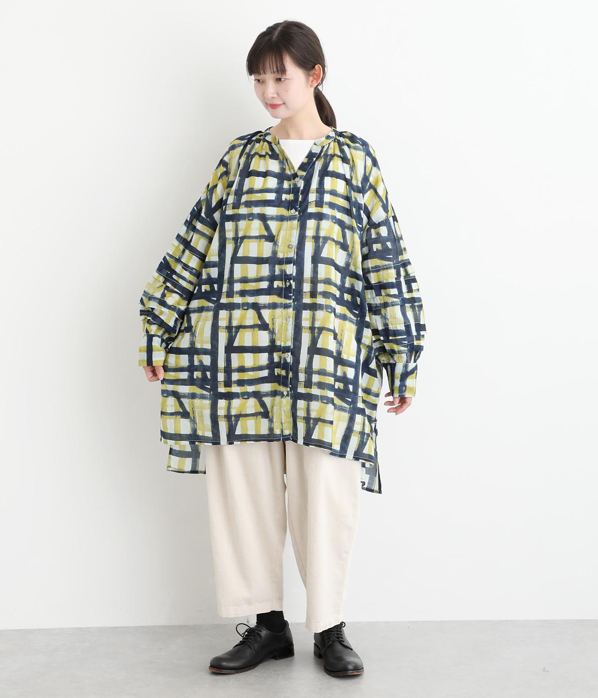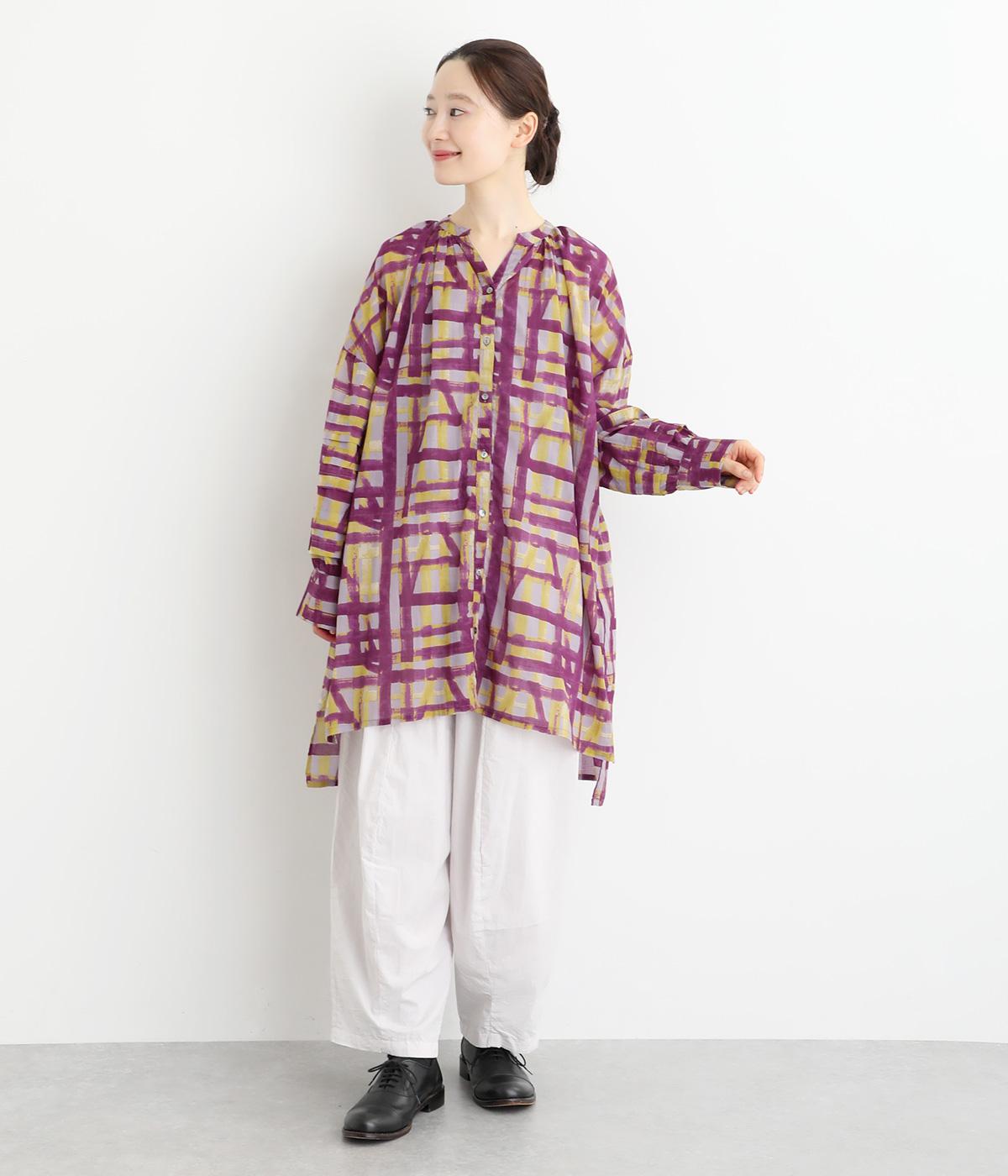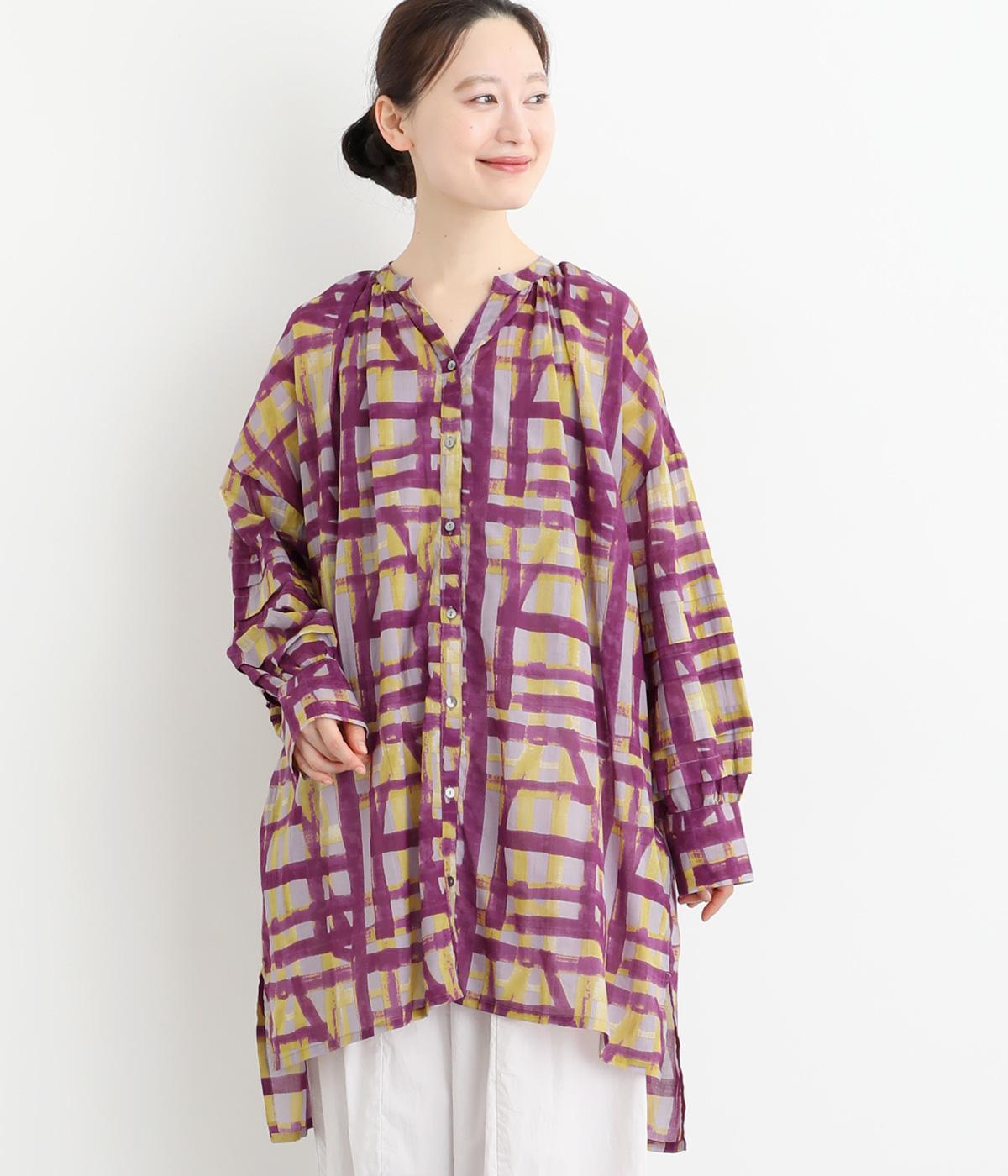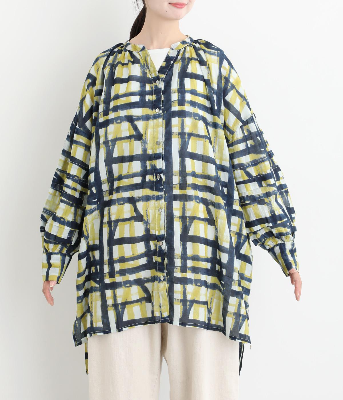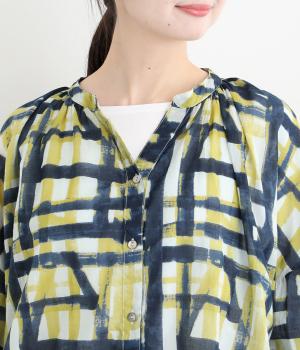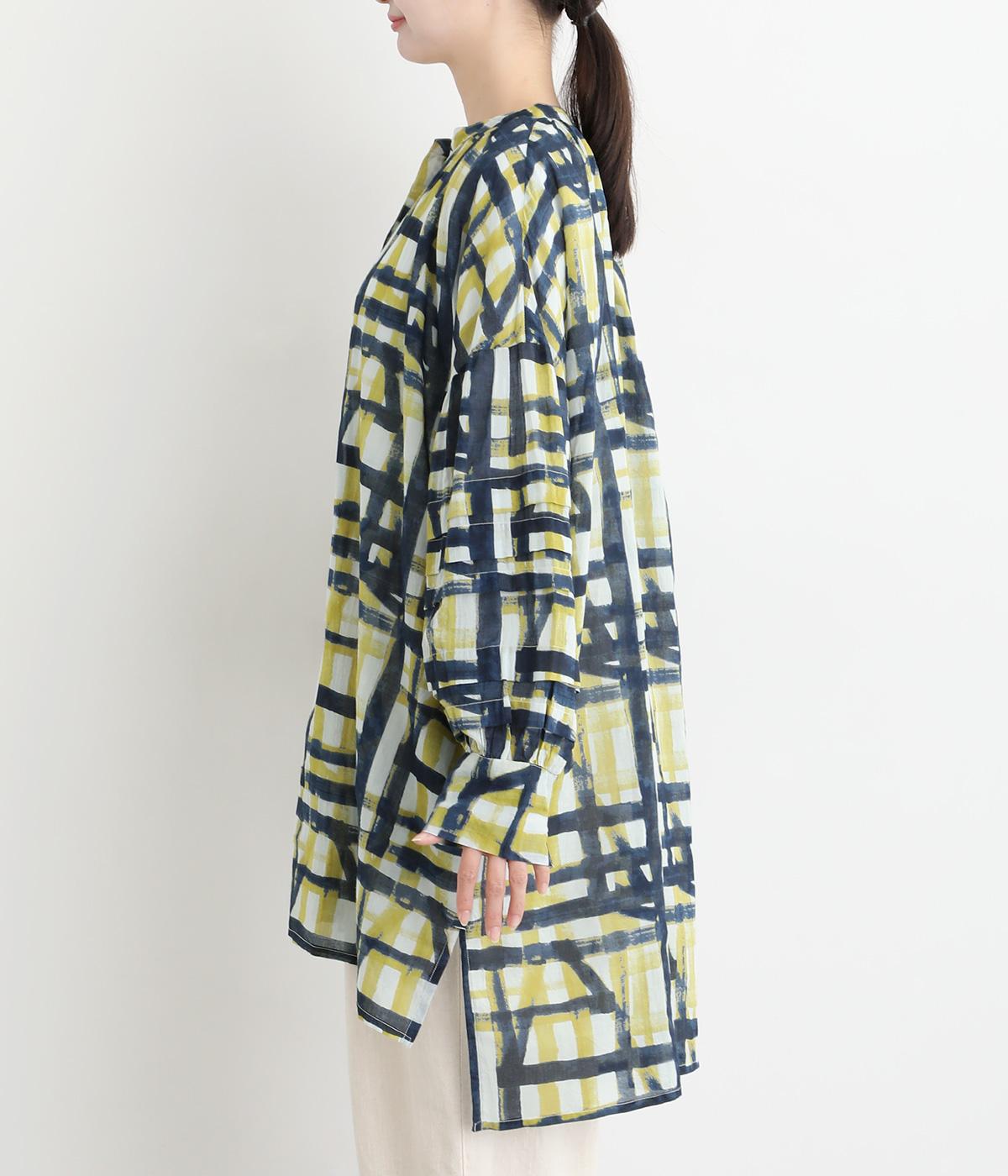 手書きの水彩画のような、個性的で表情のある柄が目をひきます。タックをほどこした袖がぽわんと膨らみのあるシルエットに。前後差をつけた裾が抜け感を演出しながら体型カバーも叶えます。