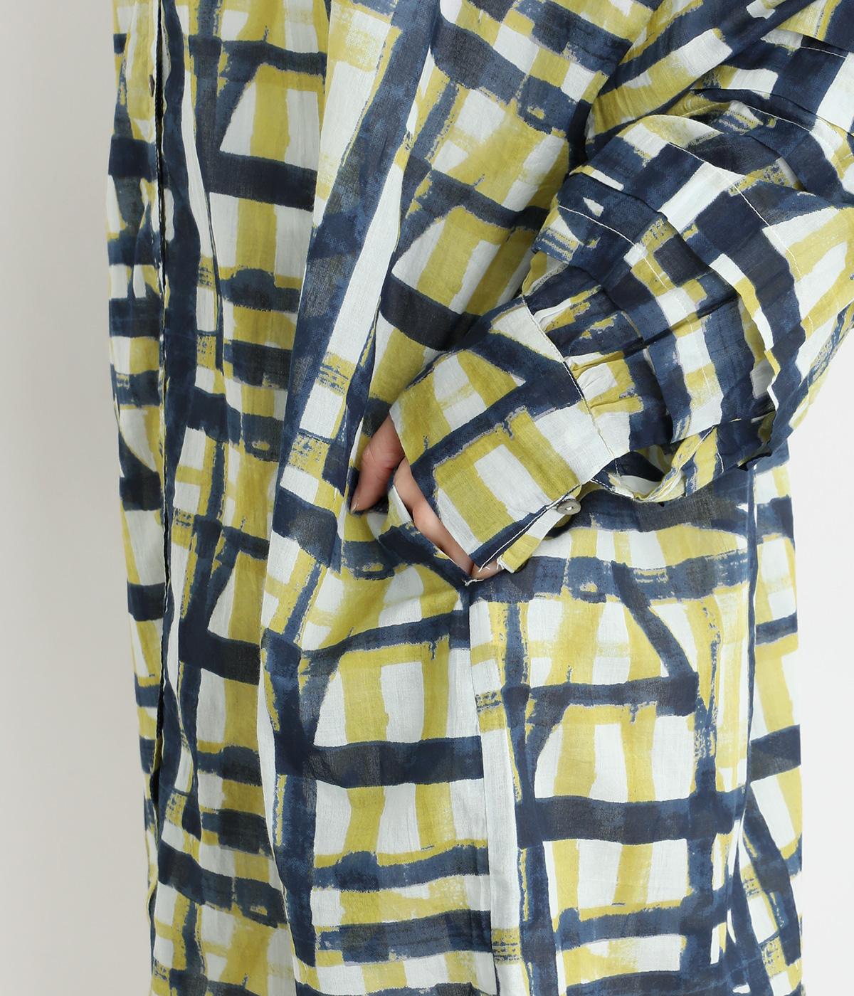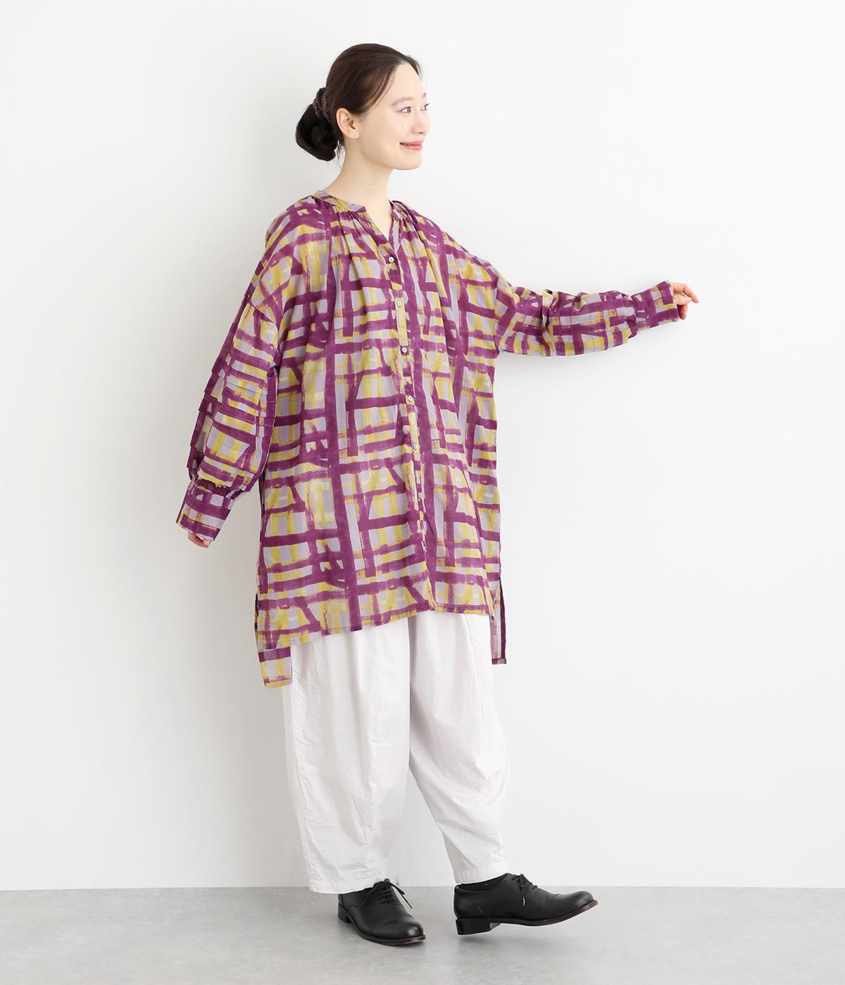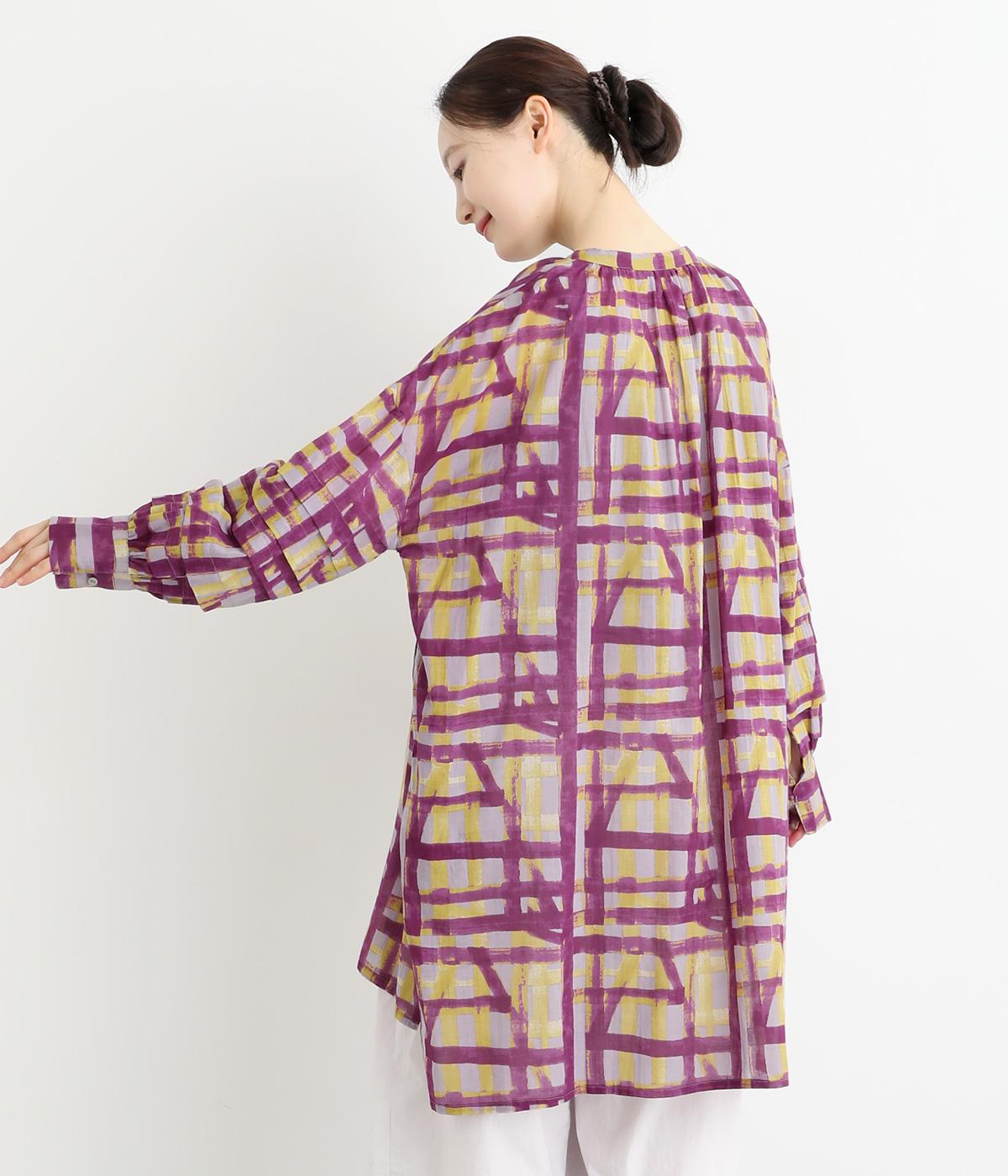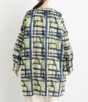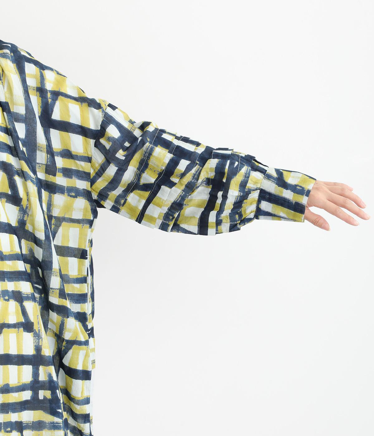 手書きの水彩画のような、個性的で表情のある柄が目をひきます。タックをほどこした袖がぽわんと膨らみのあるシルエットに。前後差をつけた裾が抜け感を演出しながら体型カバーも叶えます。
