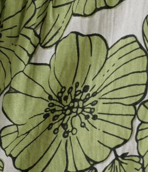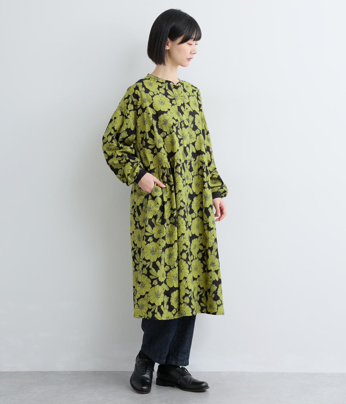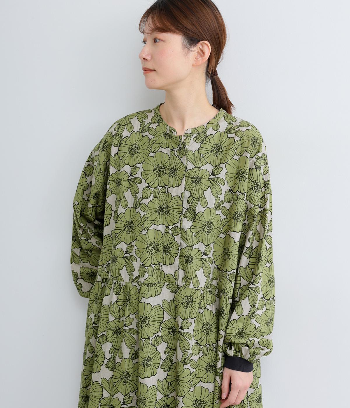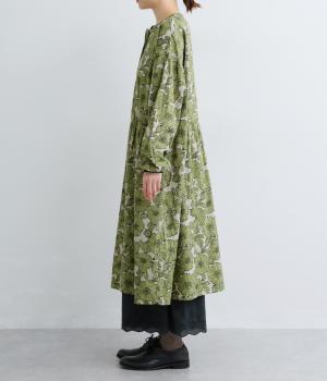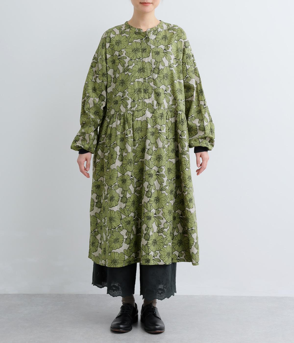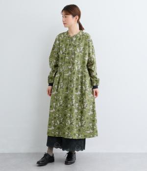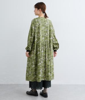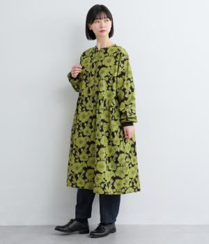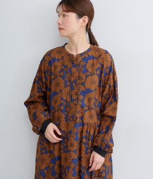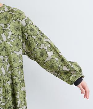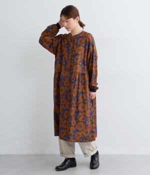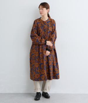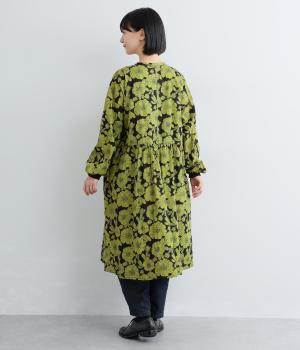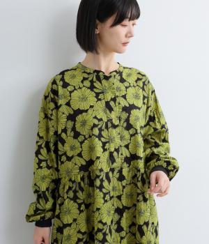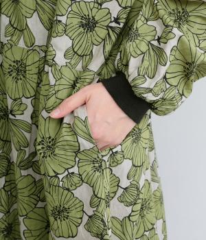 味わいのある生地に目をひくフラワープリントをほどこしました。ウエストの切替にギャザーをほどこし、ふんわり軽やかに広がります。レイヤードスタイルにもぴったりで、装いに華やぎを添えるアイテムです。