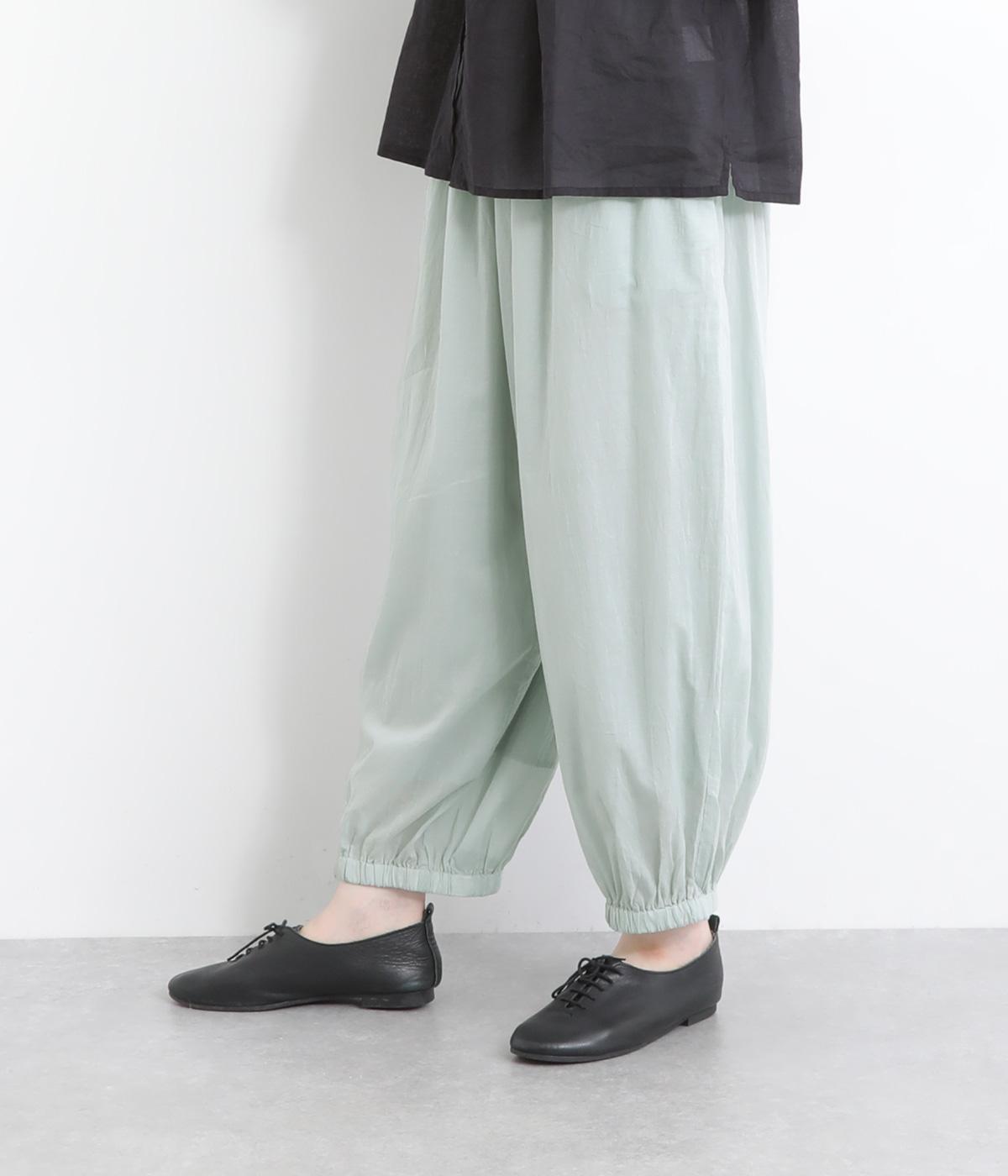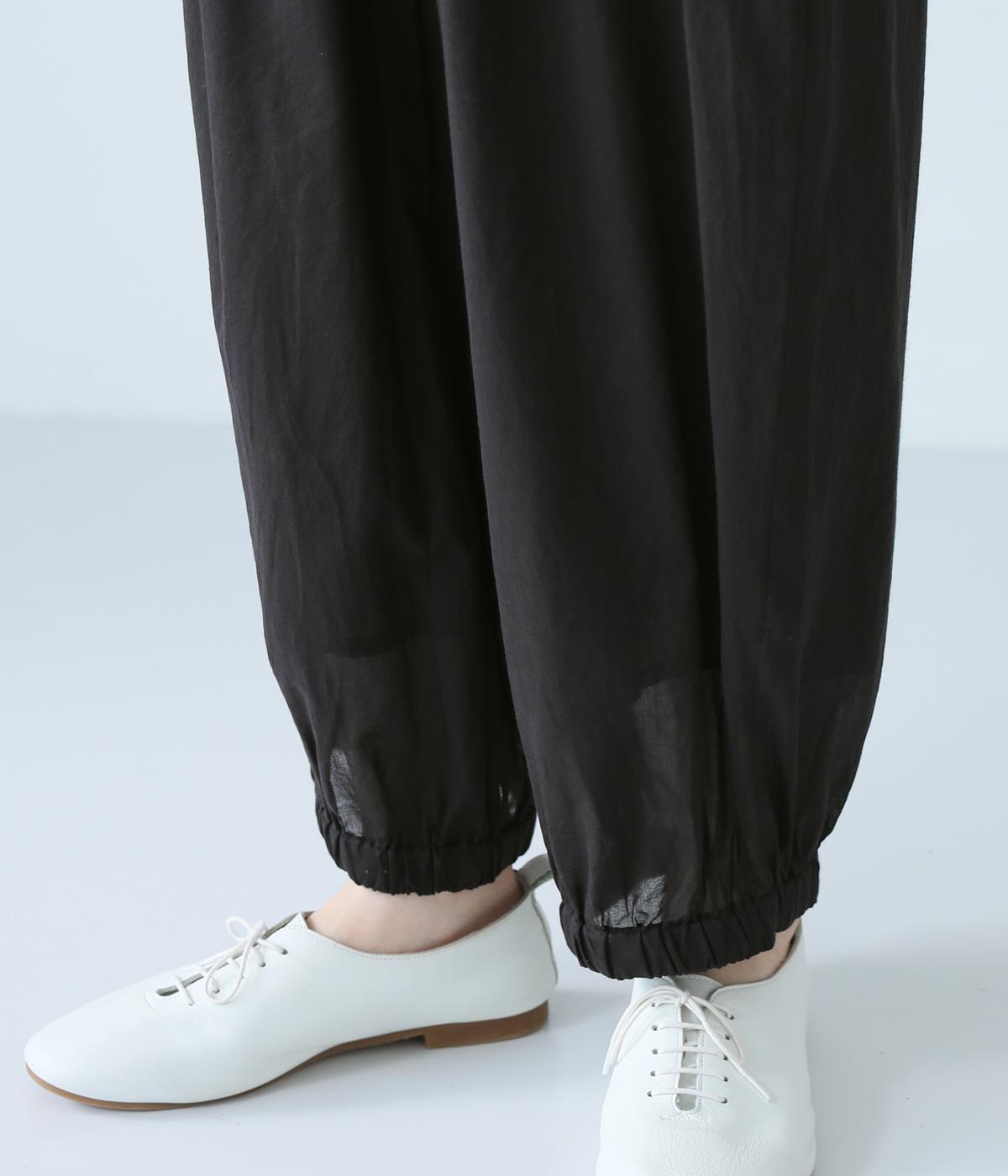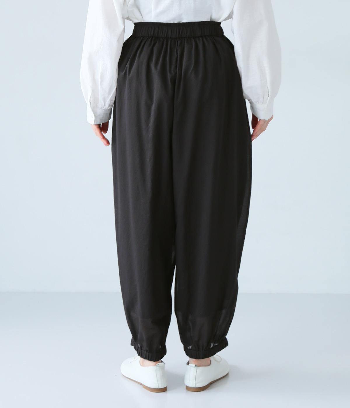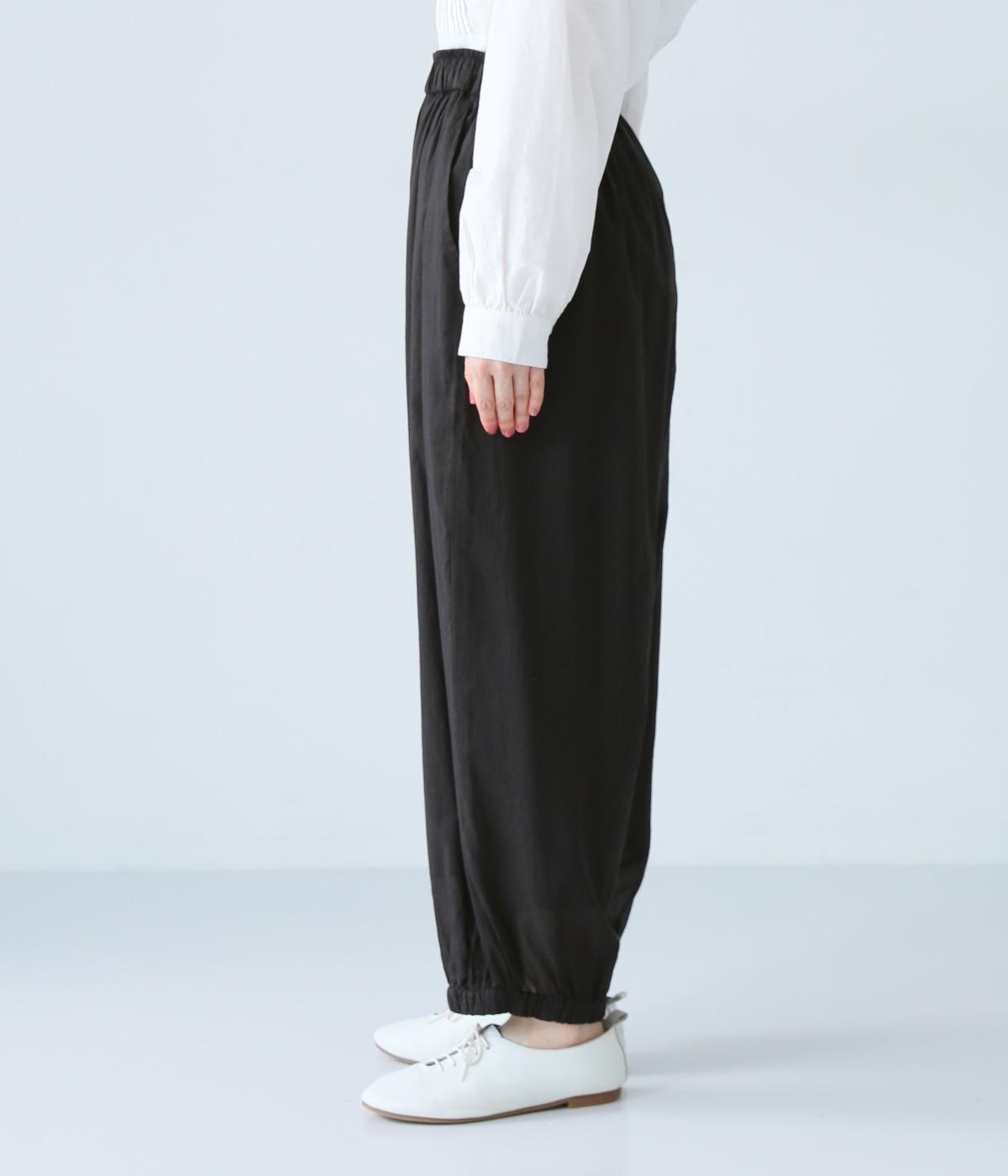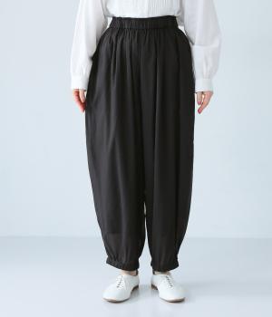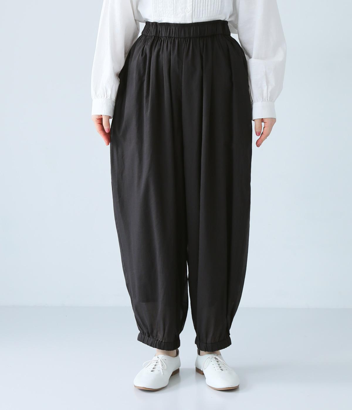 裾にゴムを入れてきゅっと引き締めた、ふんわりシルエットのパンツです。ウエストのギャザーから広がるきれいなドレープが印象的で、ワンピースなどとのスタイリングもおすすめです。総ゴム仕様のウエストには、フィット感を高める内紐を通しています。