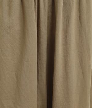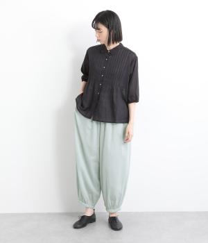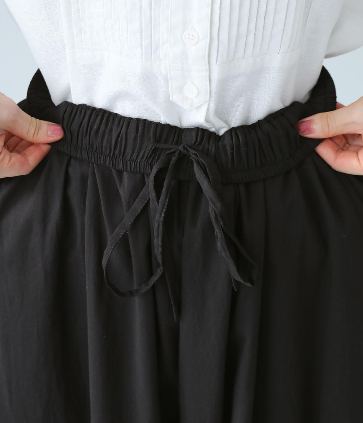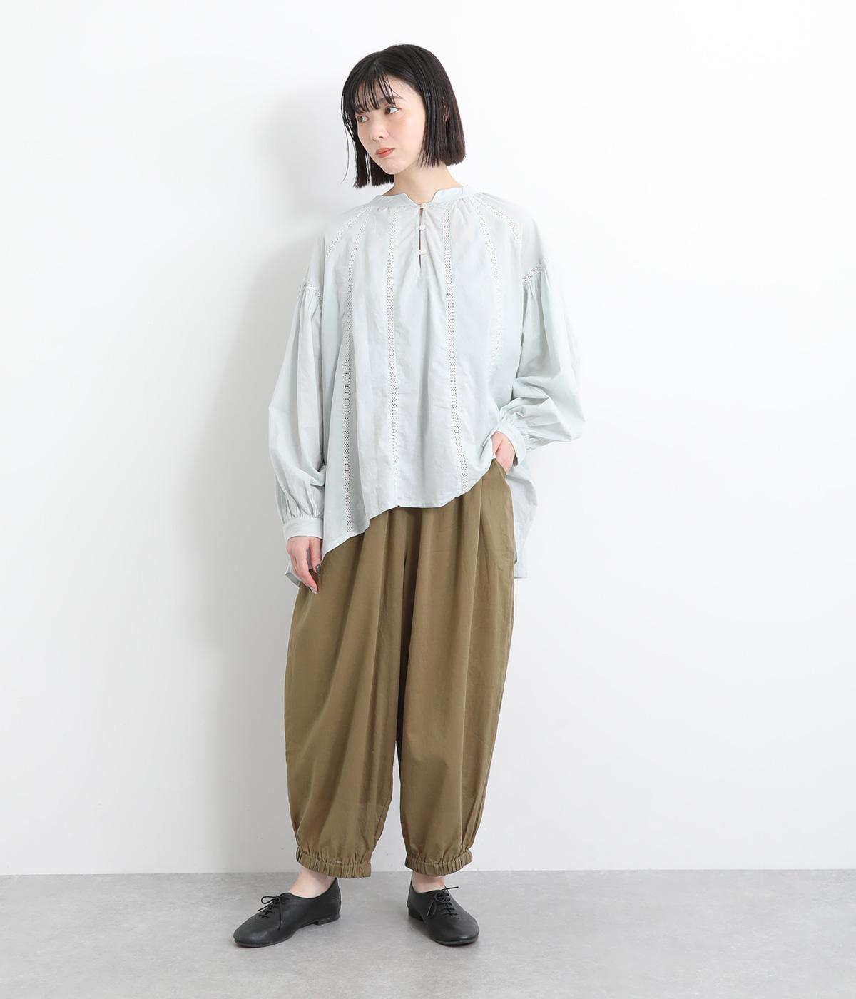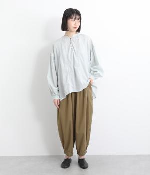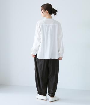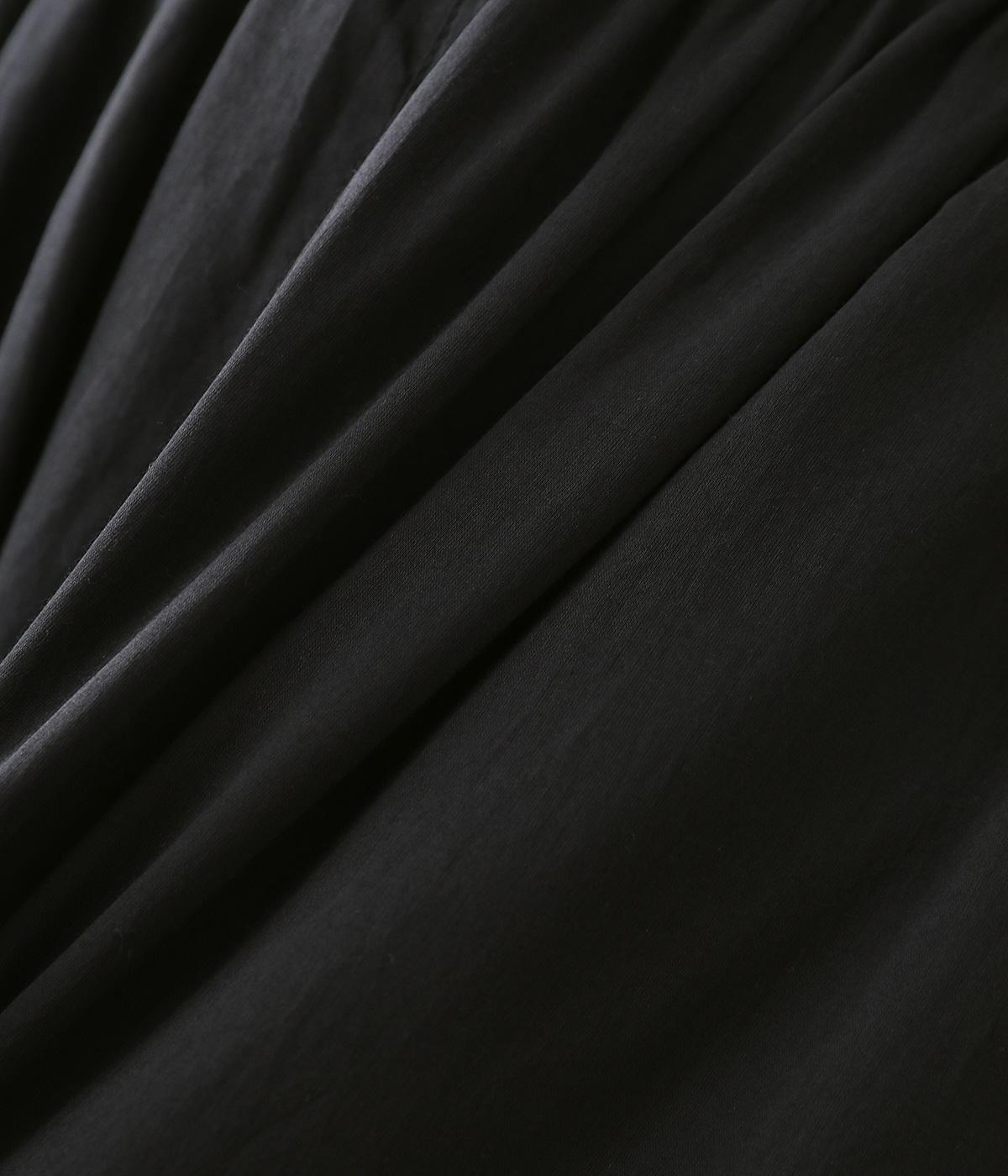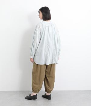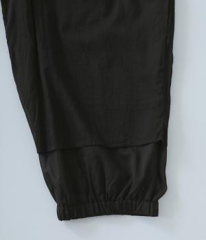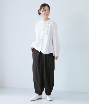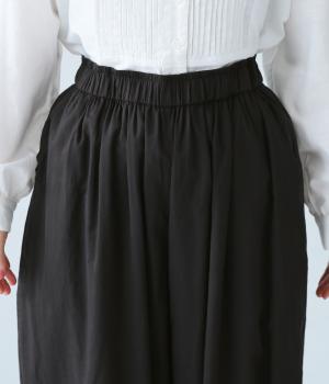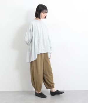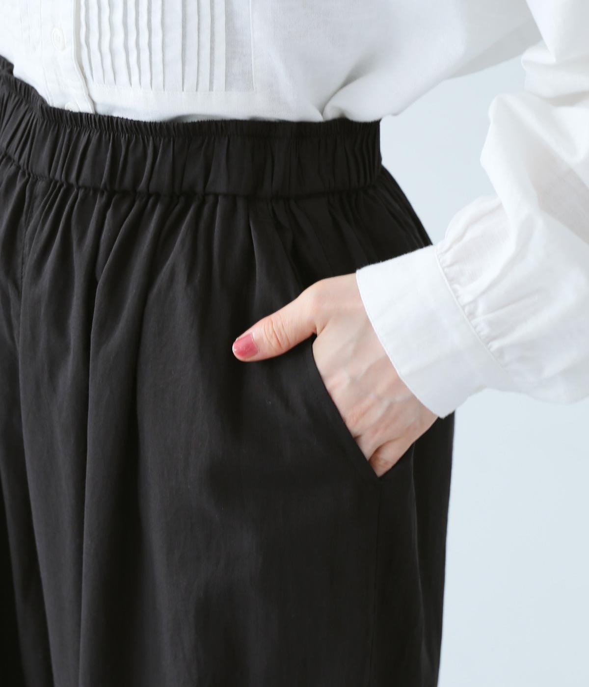 裾にゴムを入れてきゅっと引き締めた、ふんわりシルエットのパンツです。ウエストのギャザーから広がるきれいなドレープが印象的で、ワンピースなどとのスタイリングもおすすめです。総ゴム仕様のウエストには、フィット感を高める内紐を通しています。