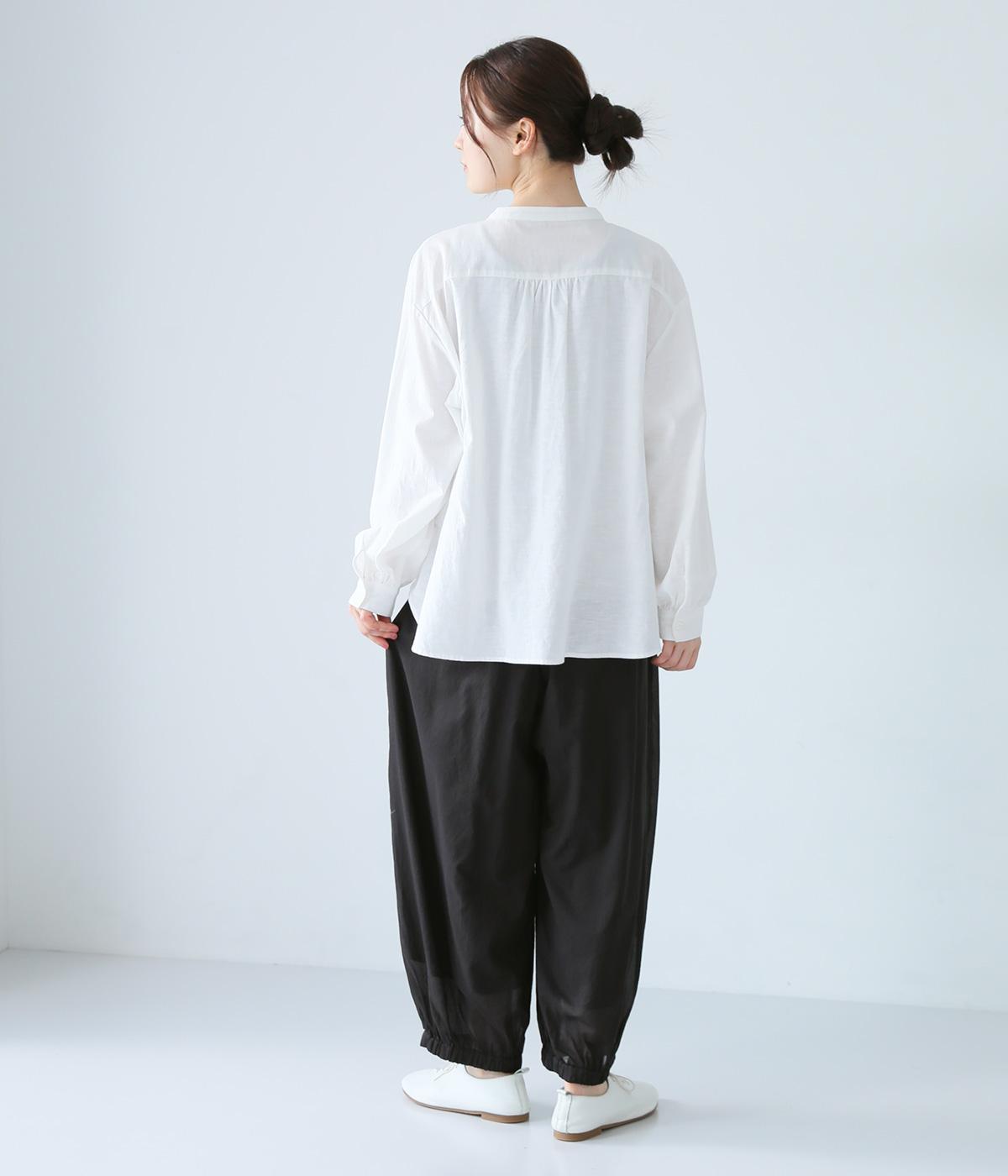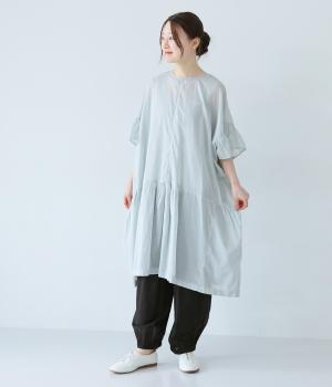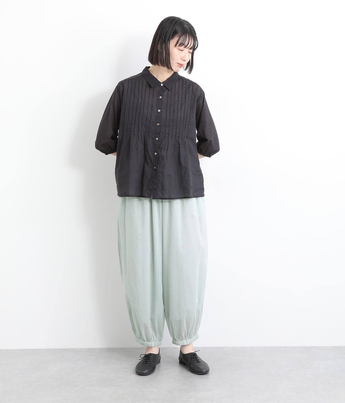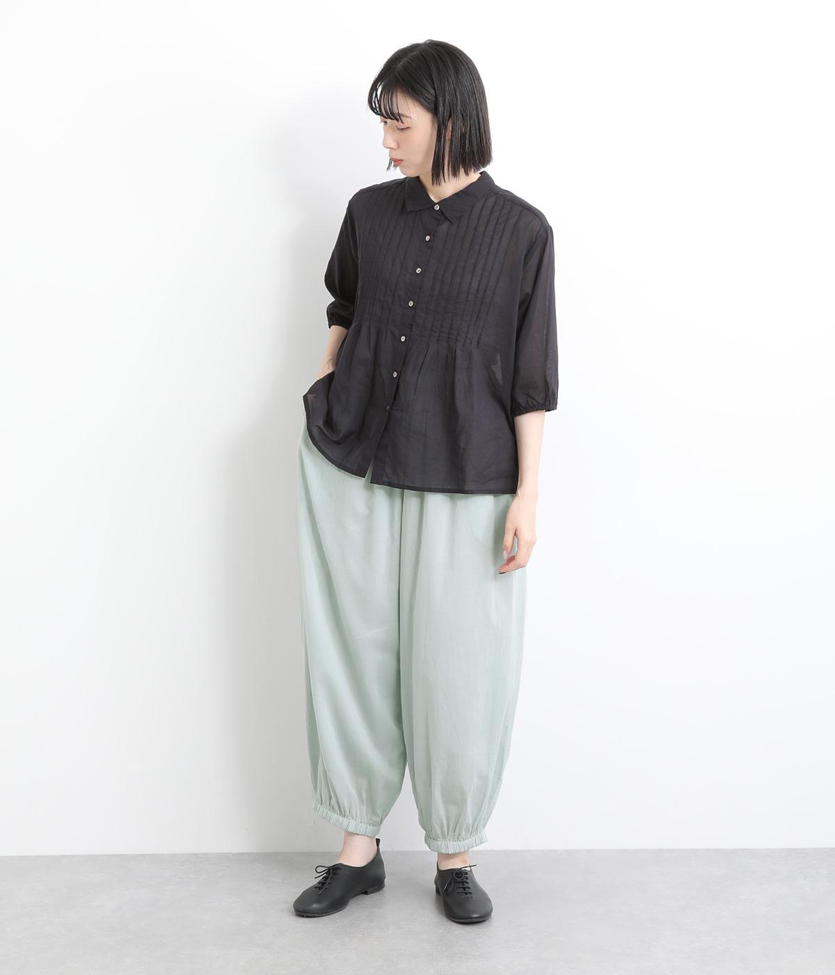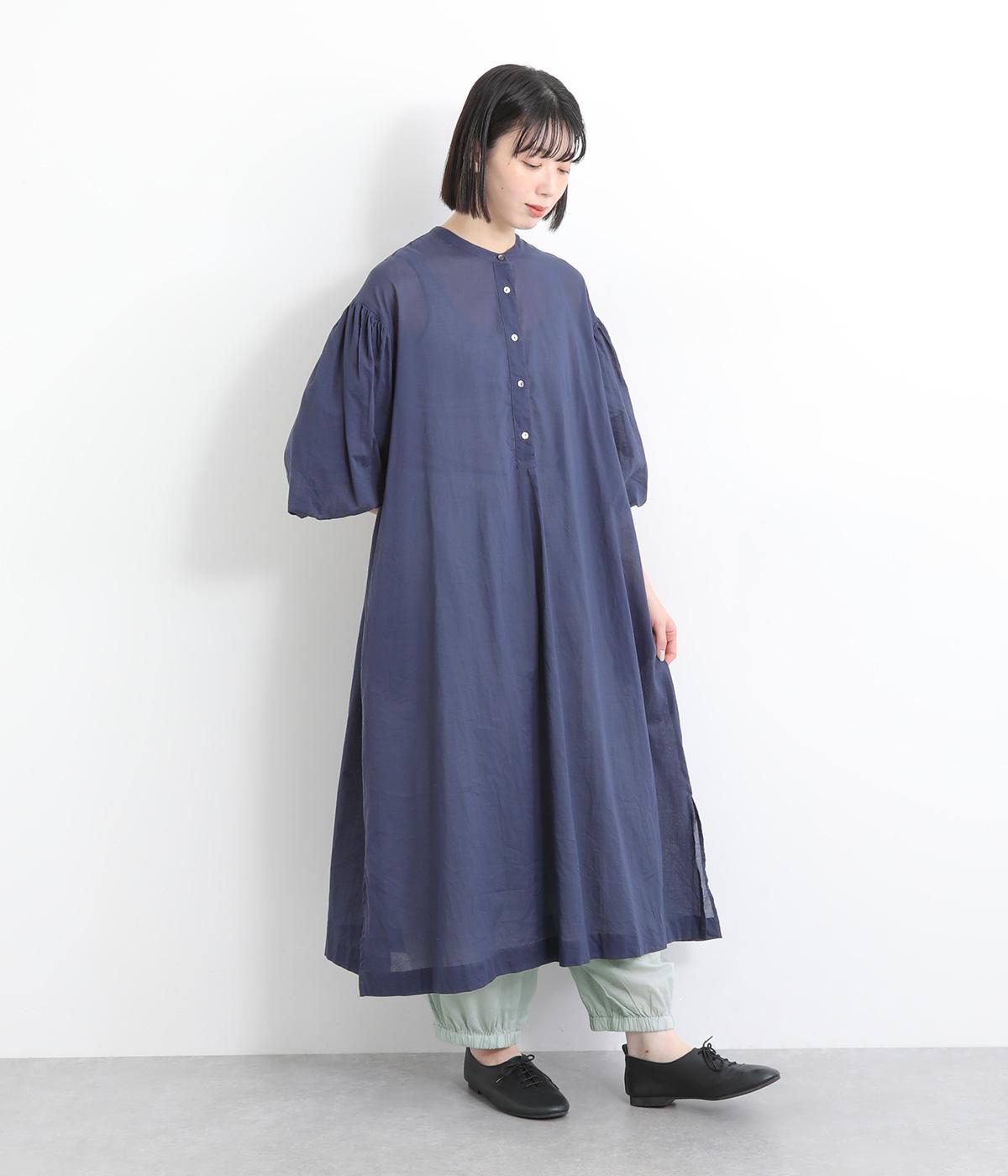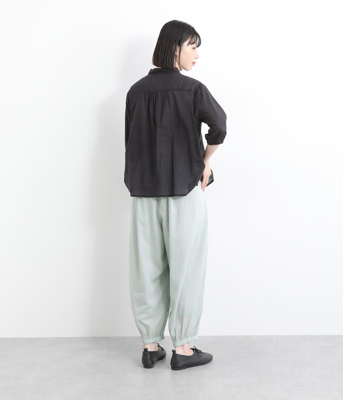 風通しの良い薄手で軽やかなコットンボイル生地。くったりとしたやわらかな風合いが特徴で、心地よく肌になじみます。透け感をおさえるコットンの裏地つきです。