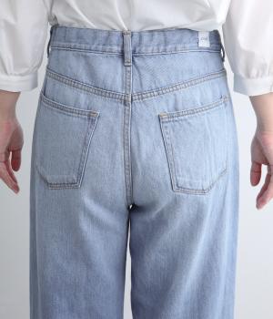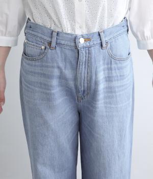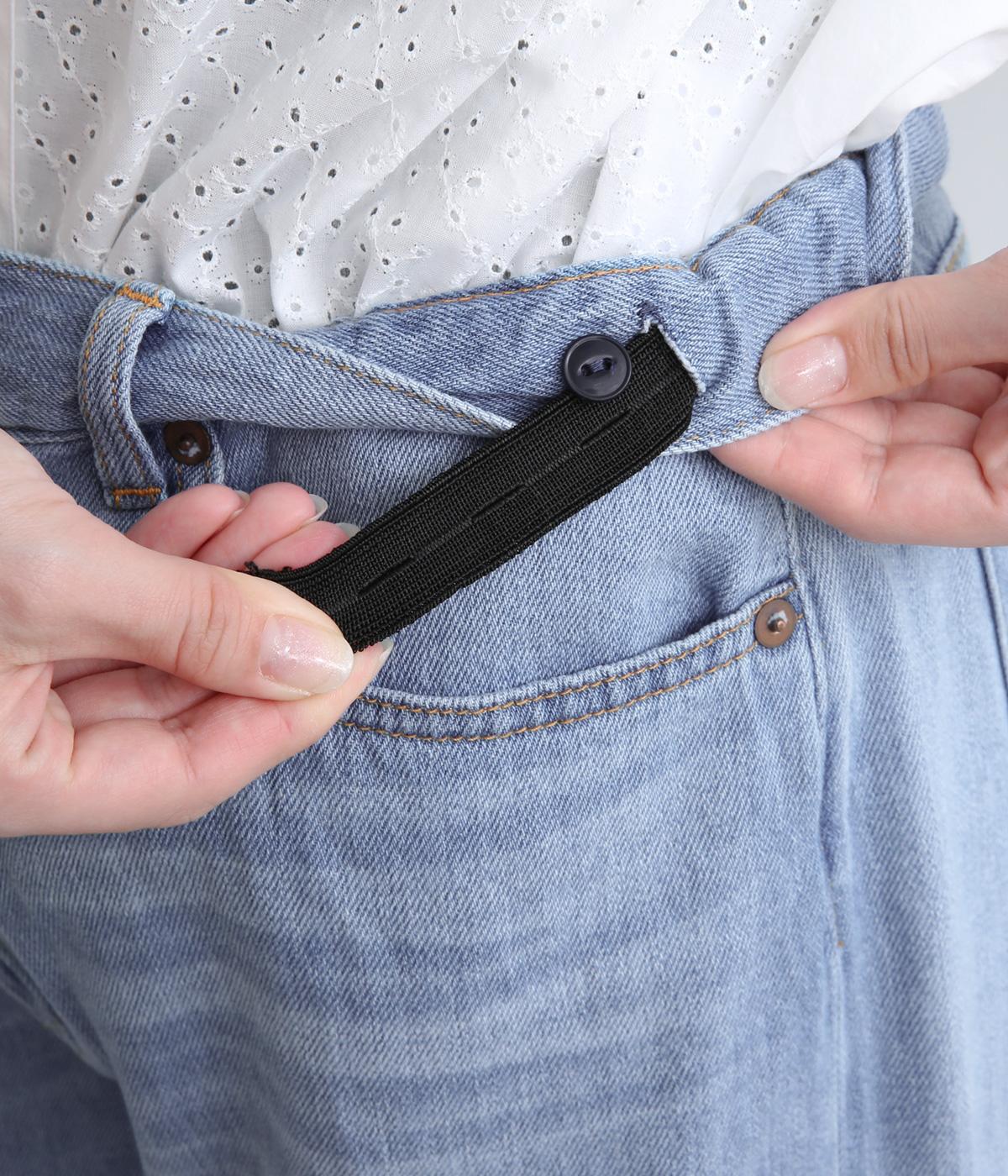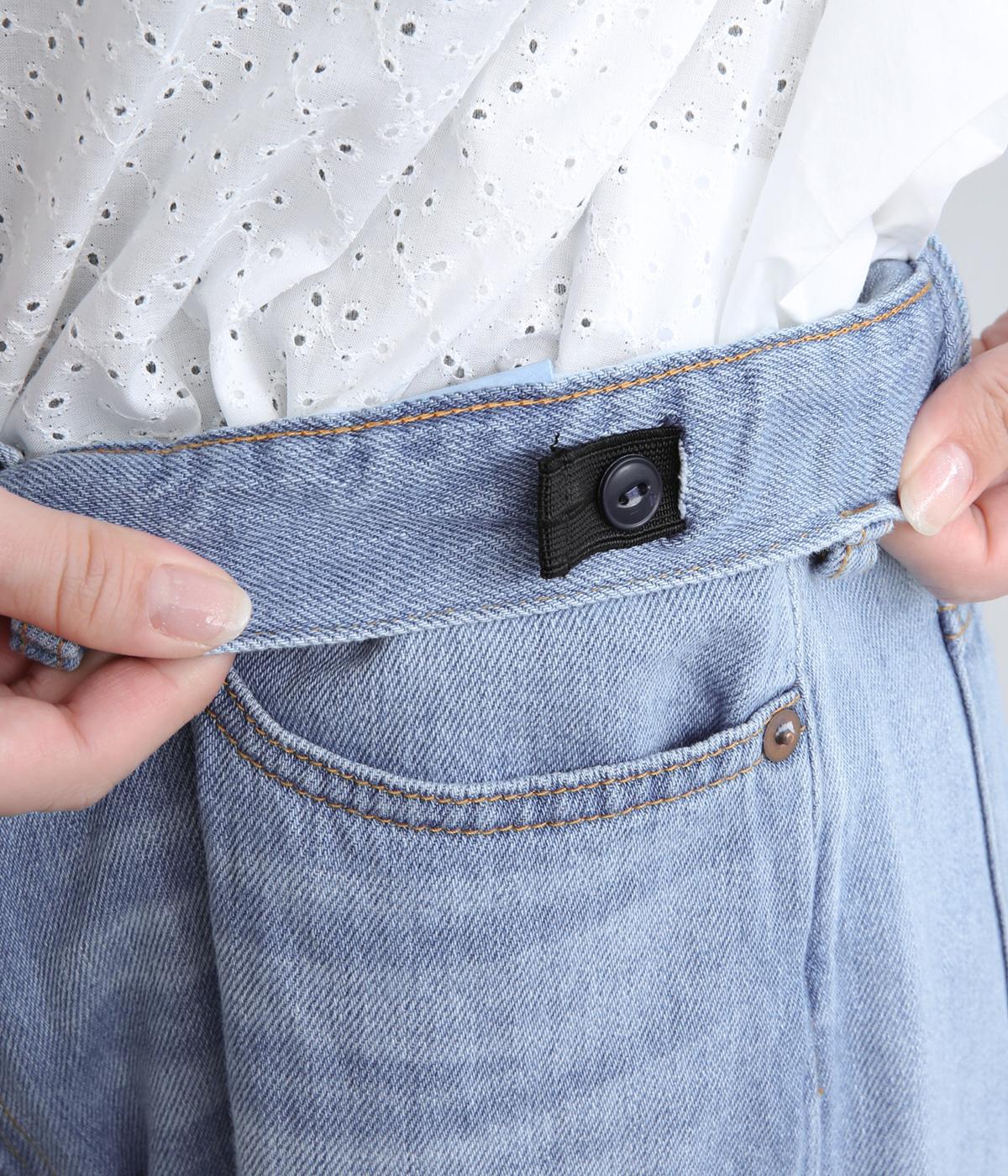 サギング(腰穿き)できる大きめウエストが特徴のワイドデニム。ウエスト内側に調節可能なボタンホールゴムを採用。ジャストサイズでも着用でき、ハイライズ特有の締めつけ感もすくなく、腰が浮かない美しいラインが叶います。