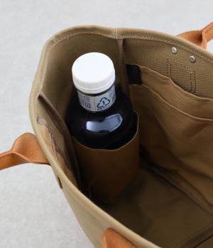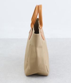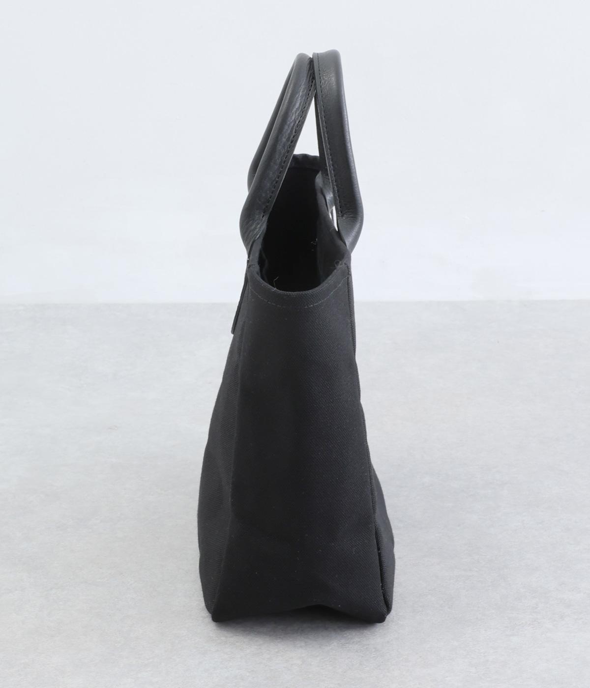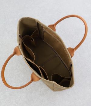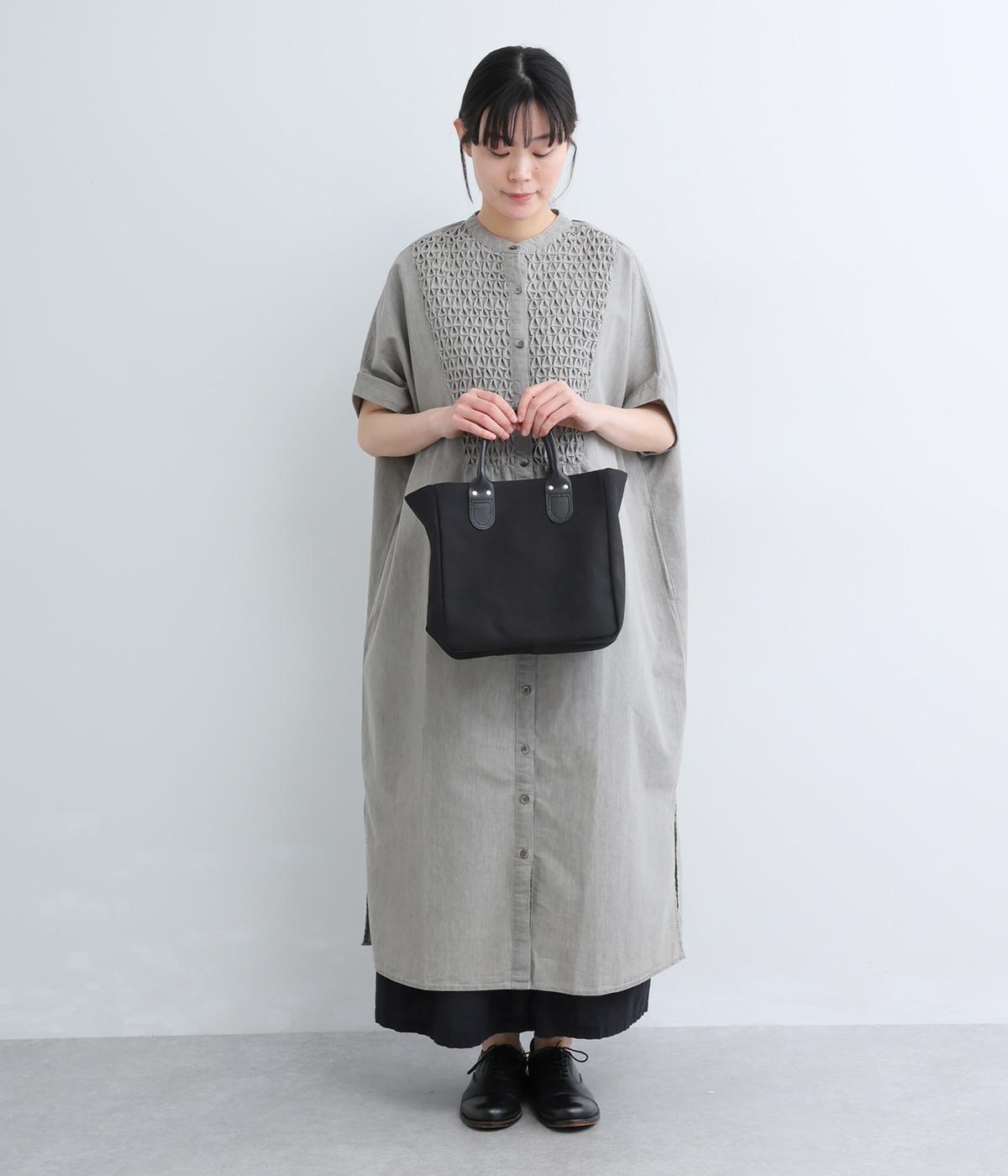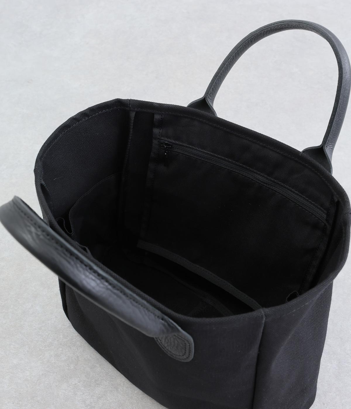 長財布やボトルが収まる容量に仕立て、内側にはファスナー付きのポケットを配して実用性にも配慮しました。牛革のアクセントが映えるデザインは、凛とした佇まいでありながら、日々の装いにも優しくなじむ、使い勝手のよい仕上がりです。