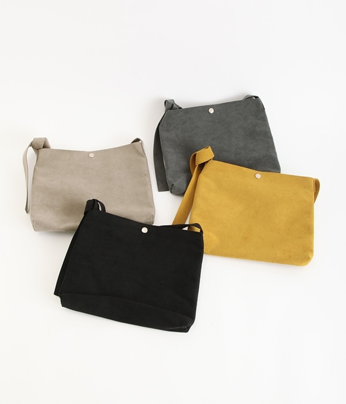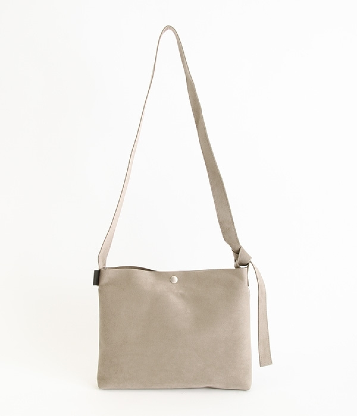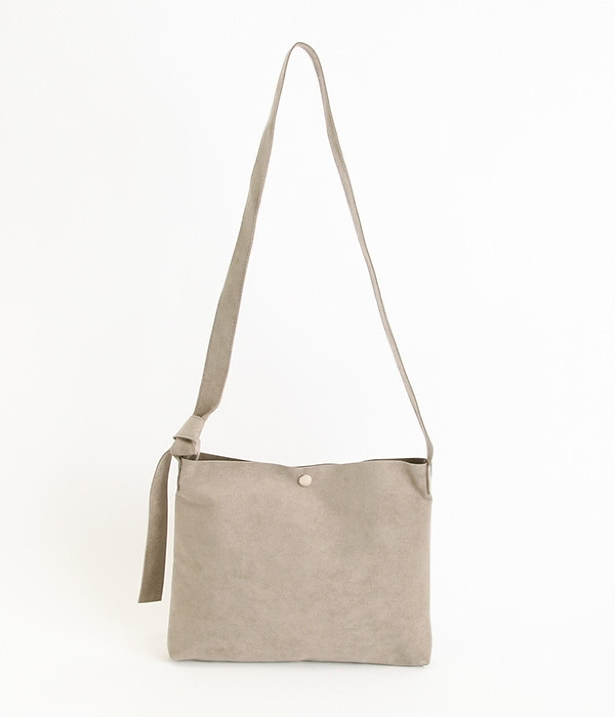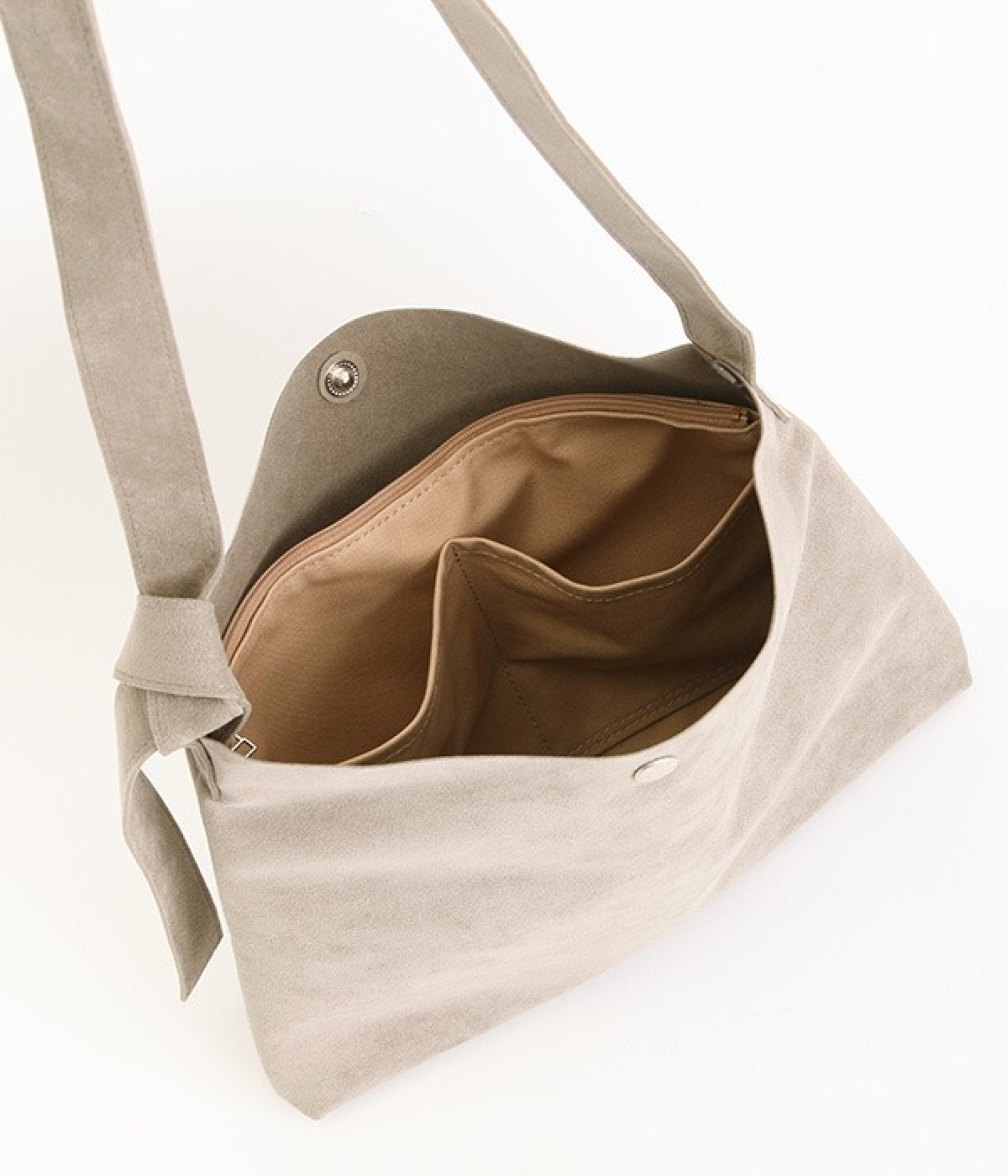 高級感のある雰囲気のフェイクスエードショルダーバッグです。おでかけにちょうどよいサイズ感で、ファスナー付きのファスナーポケットで収納力も抜群です。ショルダーの紐は結んで長さを調節できます。